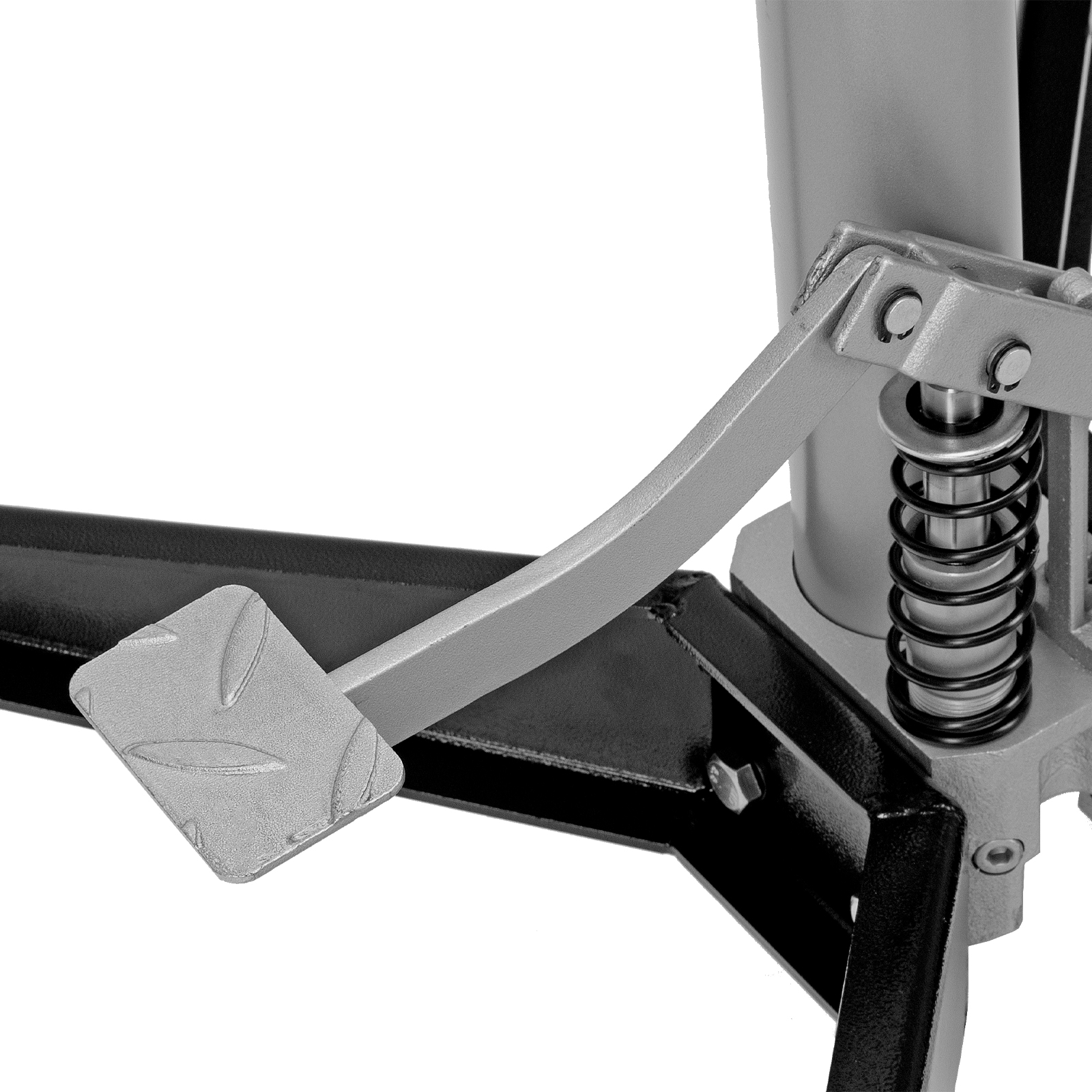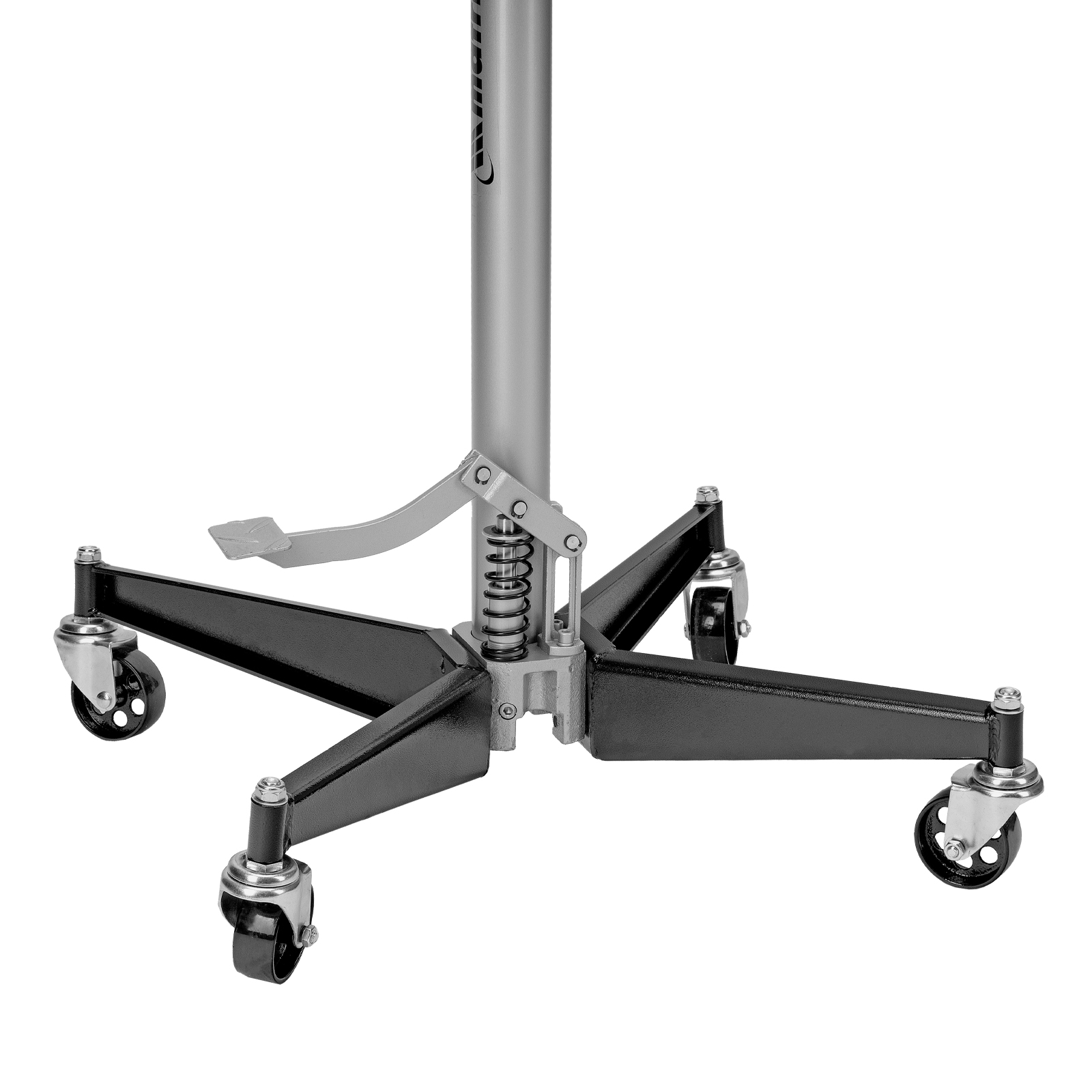 - Для удобства перемещения стойки по рабочей площадке предусмотрены колеса, а для ее надежной фиксации на месте — стопорные педали.