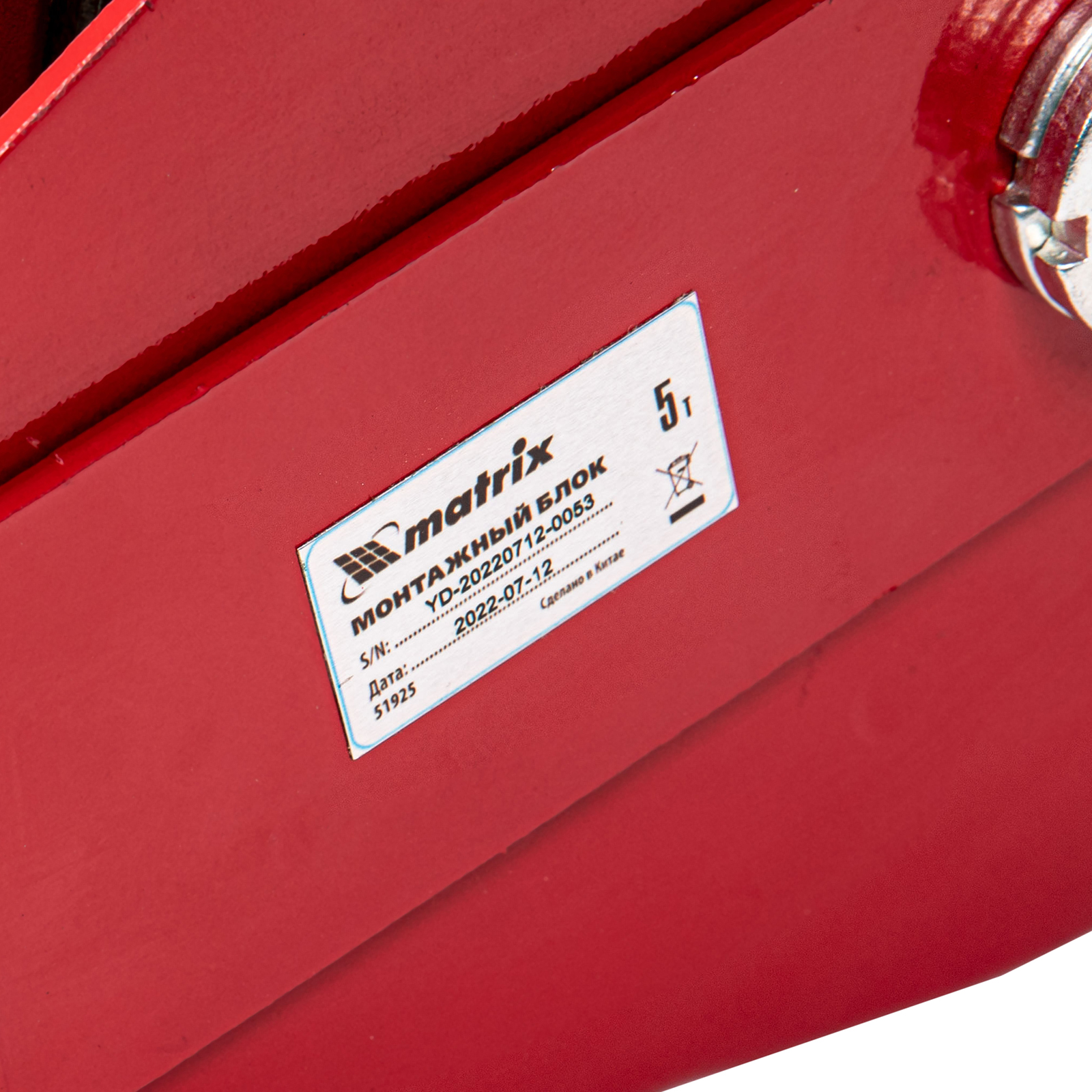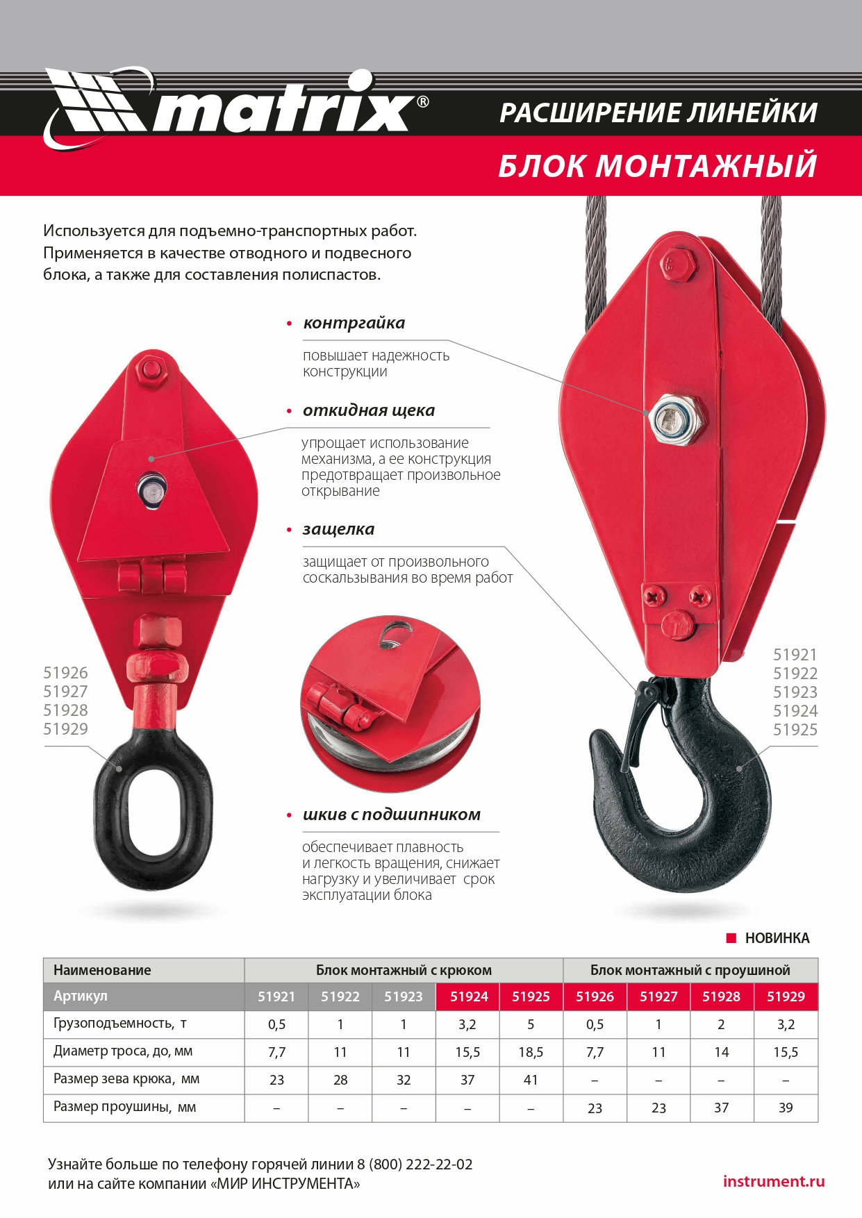 Монтажный блок с крюком Matrix 51925 грузоподъемностью 5 т расширяет функциональные возможности ручного и электрического грузоподъемного оборудования. Он позволяет менять направление движения груза, а также увеличивает подъемную силу.