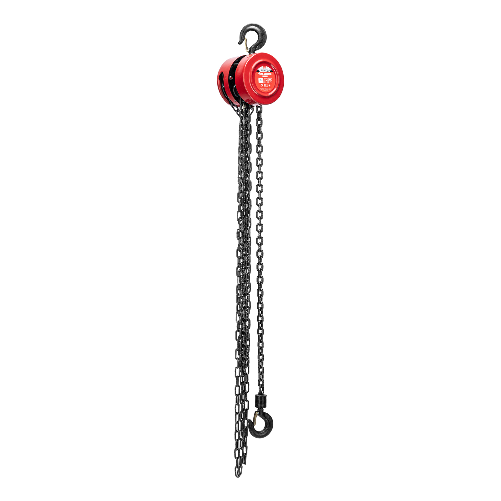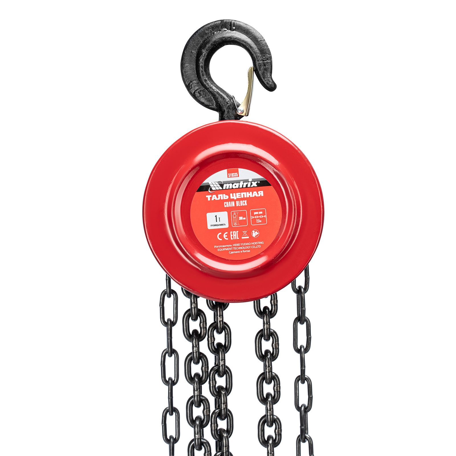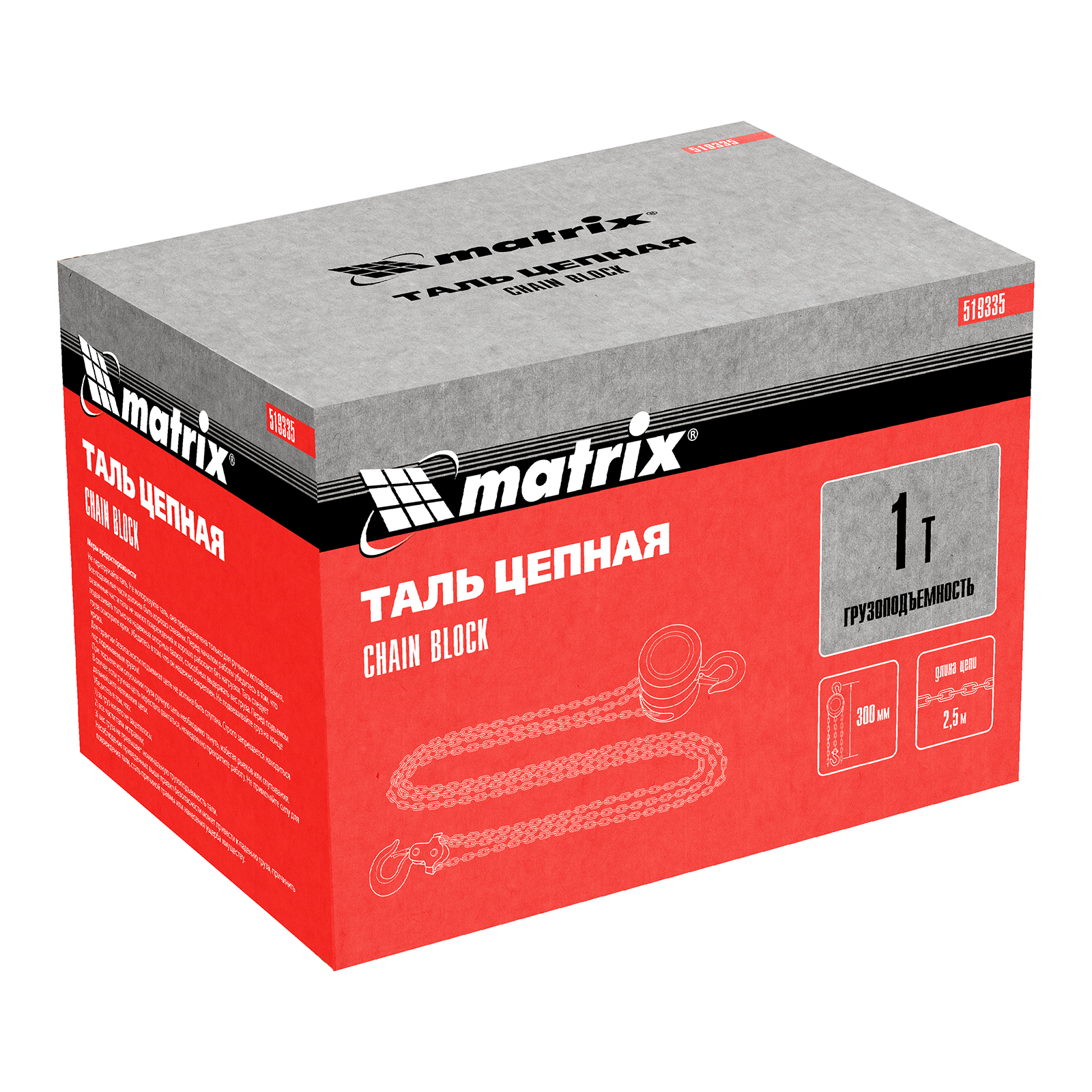 Цепная таль Matrix 519335 с расстоянием между крюками 300 мм позволяет поднимать грузы весом не более 1 т на высоту до 2,5 м. Простая конструкция облегчает использование. Механизм пригодится для проведения погрузочно-разгрузочных, ремонтных, монтажных работ.