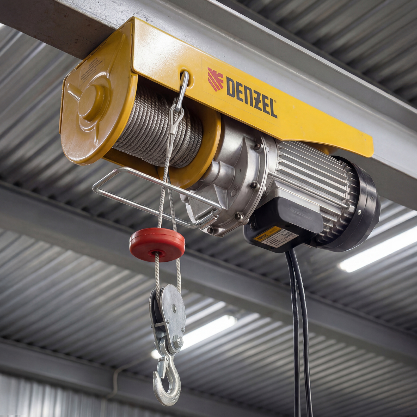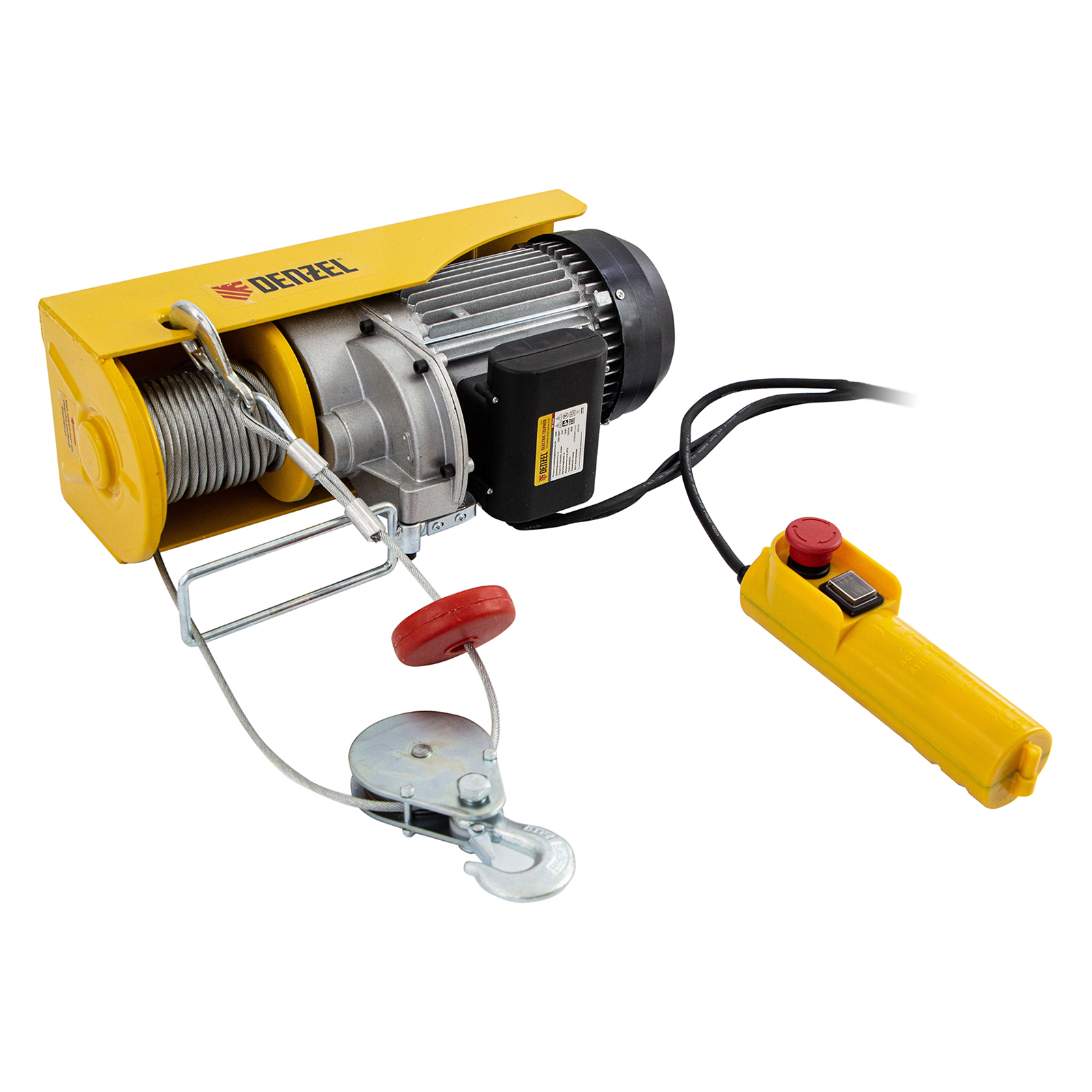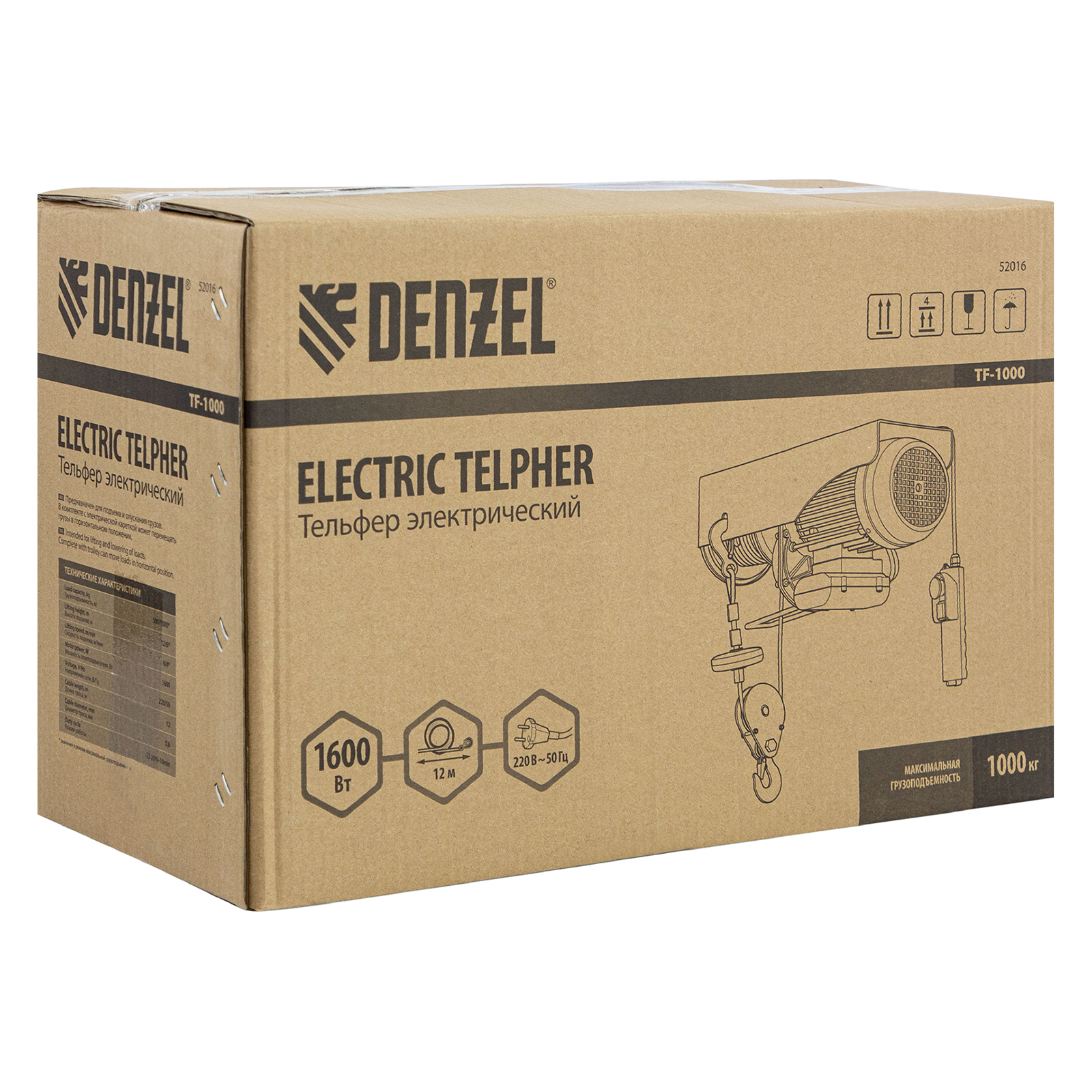 Электрический тельфер Denzel TF-1000 52016 мощностью 1600 Вт способен поднимать автомобильные двигатели, строительные материалы и другие грузы массой до 0,5 т напрямую и до 1 т с помощью блока полиспаста. Высота подъема составляет 6 м при использовании полиспаста и 12 м без него, скорость — 4 и 8 м/мин соответственно. Устройство пригодится в гараже, автомастерской или на строительной площадке. Полиспаст входит в комплект поставки.