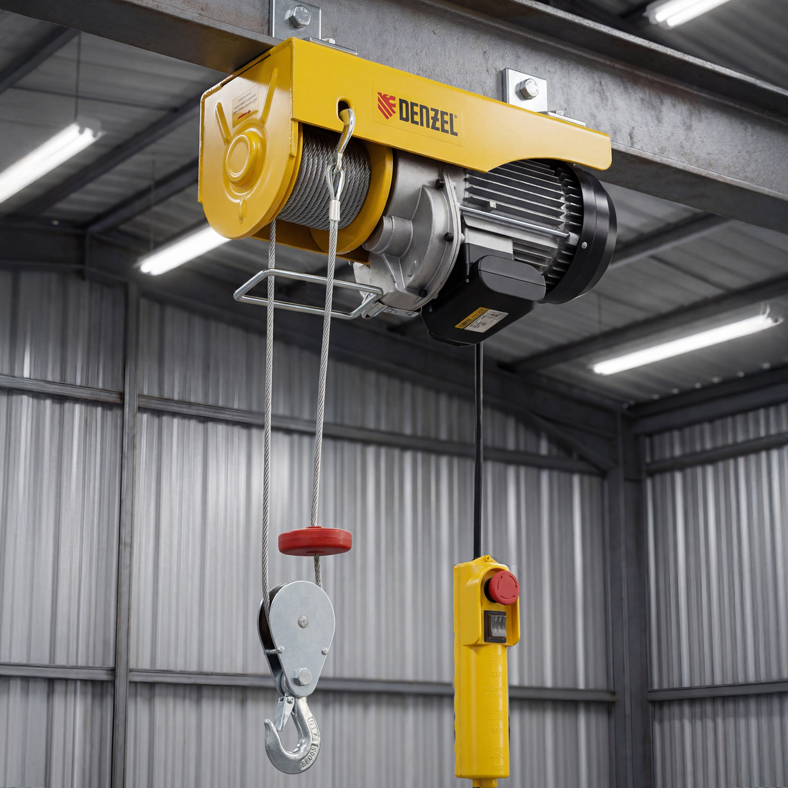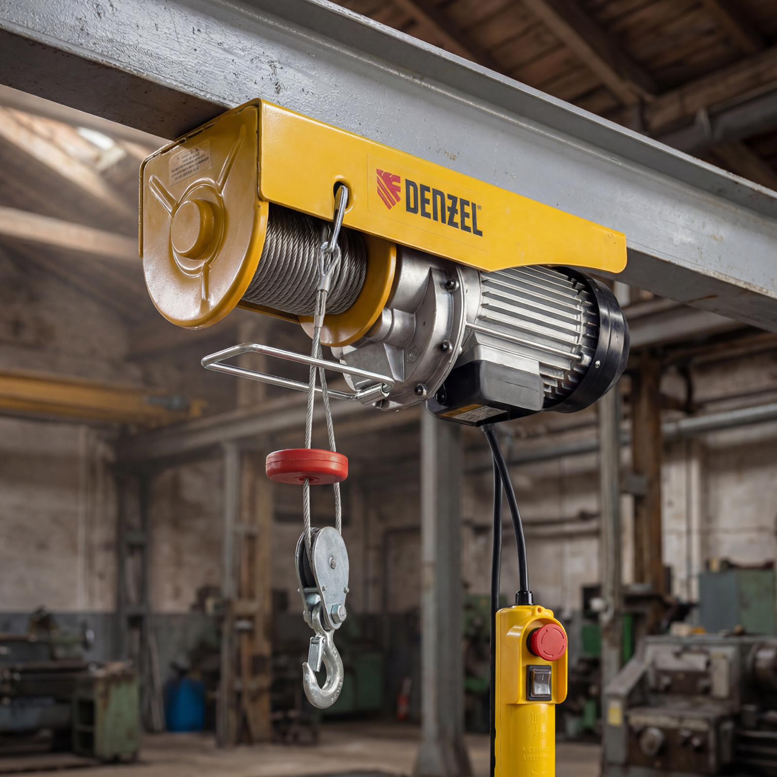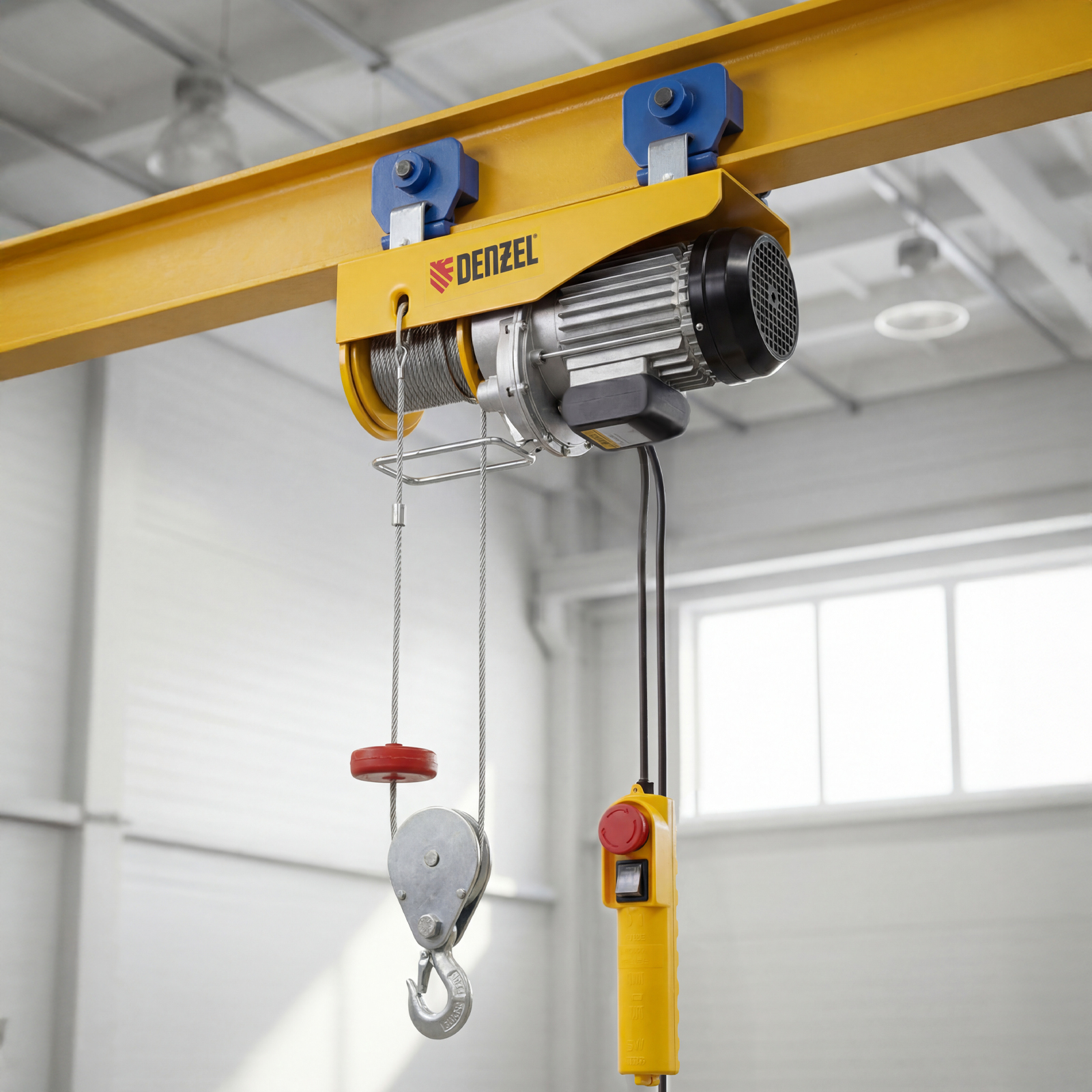 Электрический тельфер Denzel TF-1000 52016 мощностью 1600 Вт способен поднимать автомобильные двигатели, строительные материалы и другие грузы массой до 0,5 т напрямую и до 1 т с помощью блока полиспаста. Высота подъема составляет 6 м при использовании полиспаста и 12 м без него, скорость — 4 и 8 м/мин соответственно. Устройство пригодится в гараже, автомастерской или на строительной площадке. Полиспаст входит в комплект поставки.