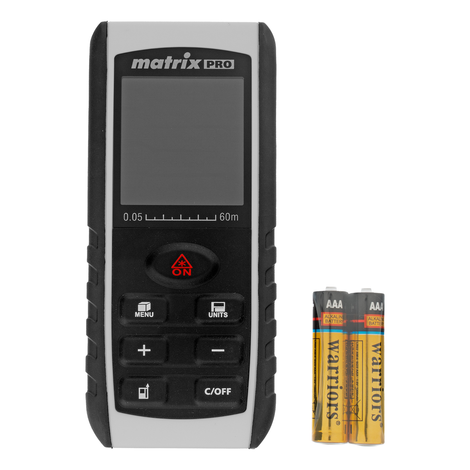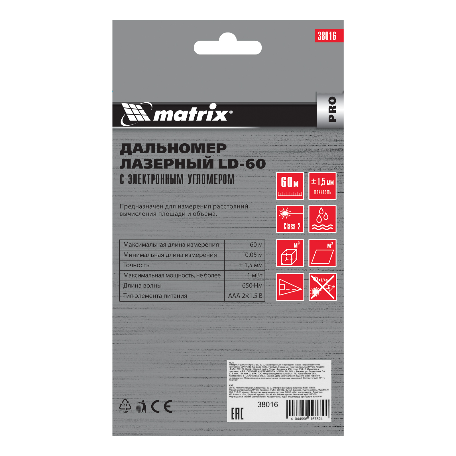 Лазерный дальномер Matrix LD-60 38016 с электронным угломером позволяет измерять длину на расстоянии от 0,05 до 60 м, вычислять площадь и объем помещения, а также измерять углы. Функция складывания и вычитания полученных результатов существенно облегчает и ускоряет работу. Дальномер будет полезен для выполнения работ по укладке плитки, установке натяжных потолков и напольных конструкций, монтаже окон и дверей, проектированию пространства.