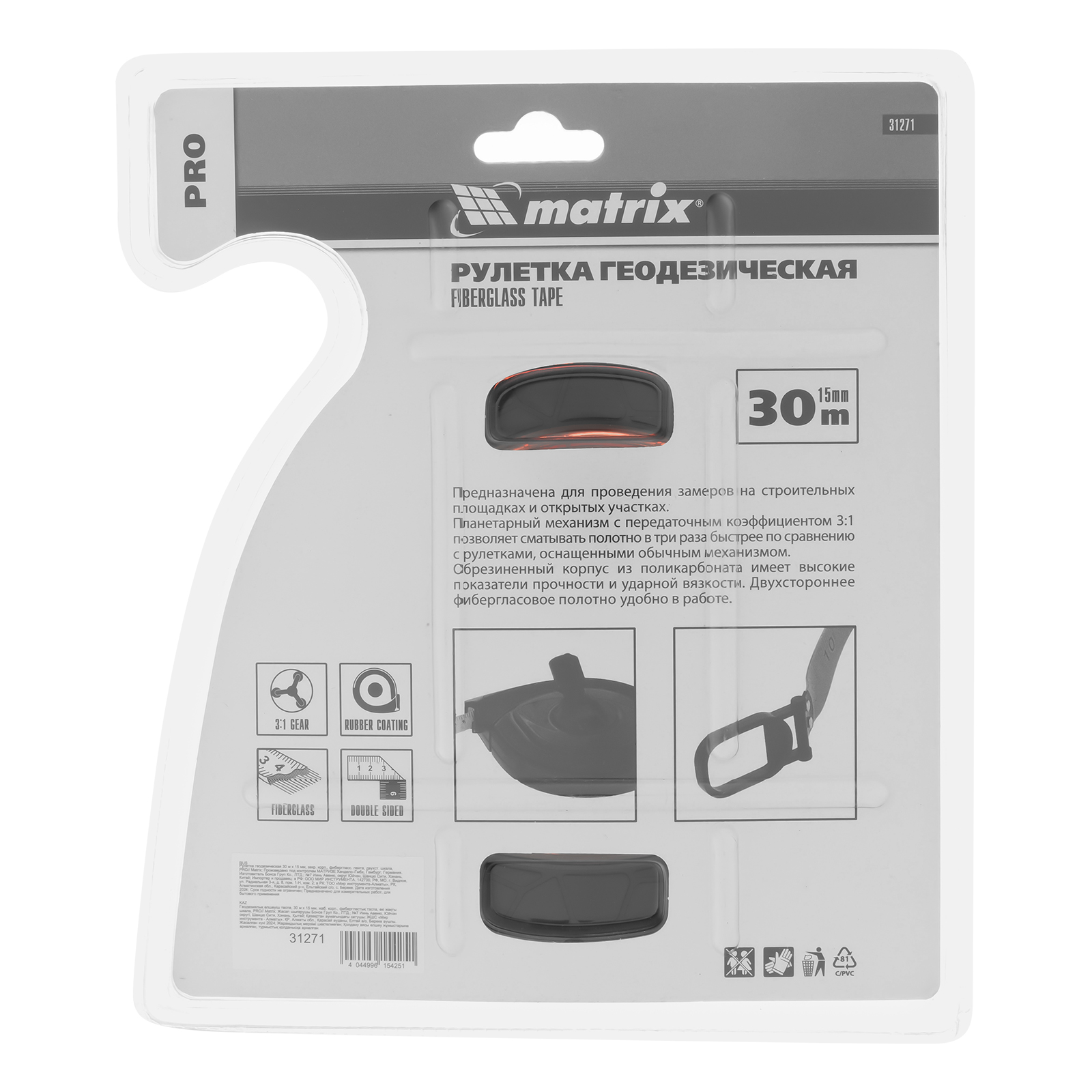 Геодезическая рулетка Matrix PRO 31271 в закрытом корпусе, 30 м х 15 мм, с фибергласовой лентой и двусторонней шкалой, используется при проведении замеров на открытых участках и строительных объектах. Будет полезна во время картографических исследований и работ по созданию ландшафтного дизайна. Двухкомпонентный корпус из поликарбоната с резиновыми вставками устойчив к повреждениям и не боится ударов и падений. Кольцо-зацеп фиксируется на поверхности, избавляя от необходимости придерживать конец ленты рукой.