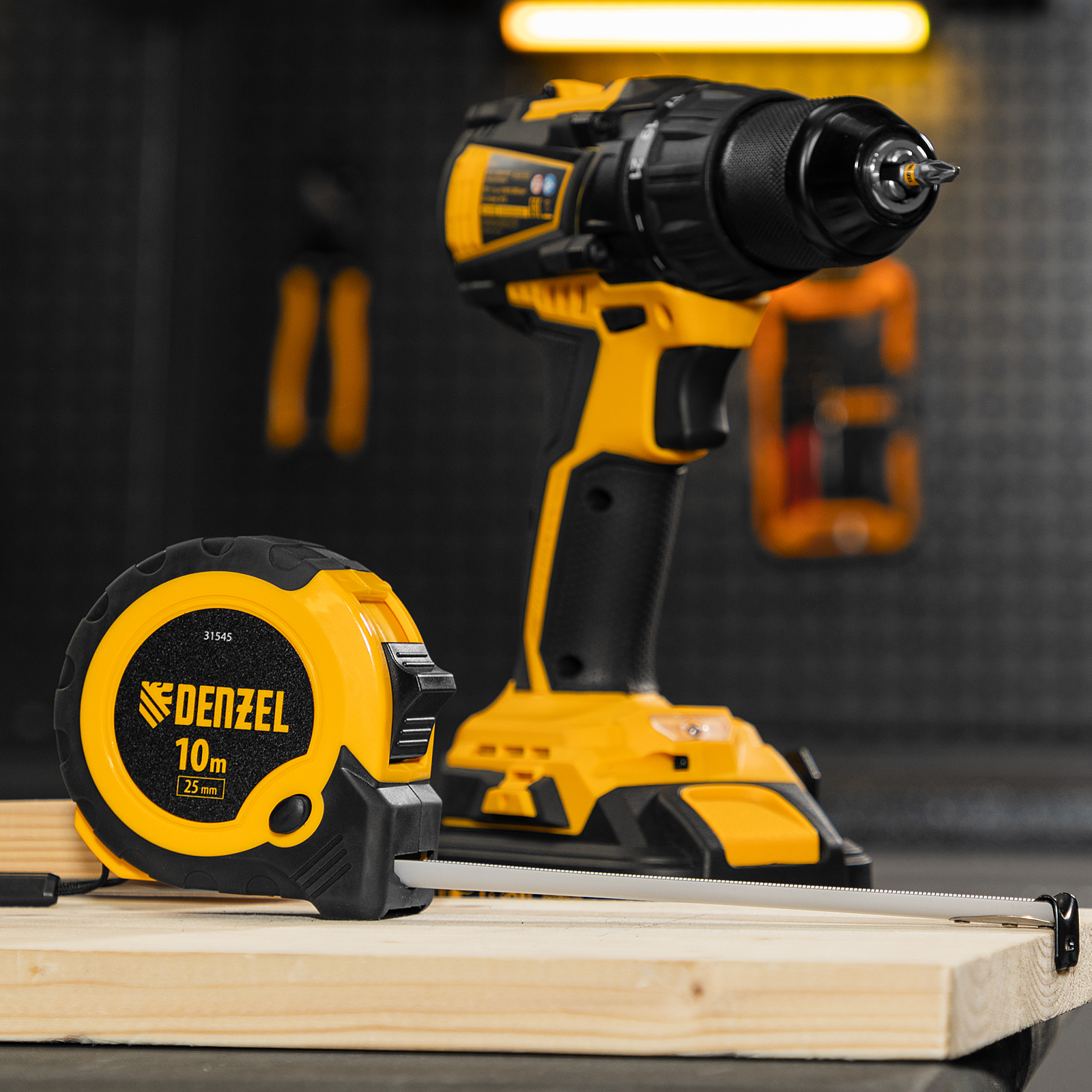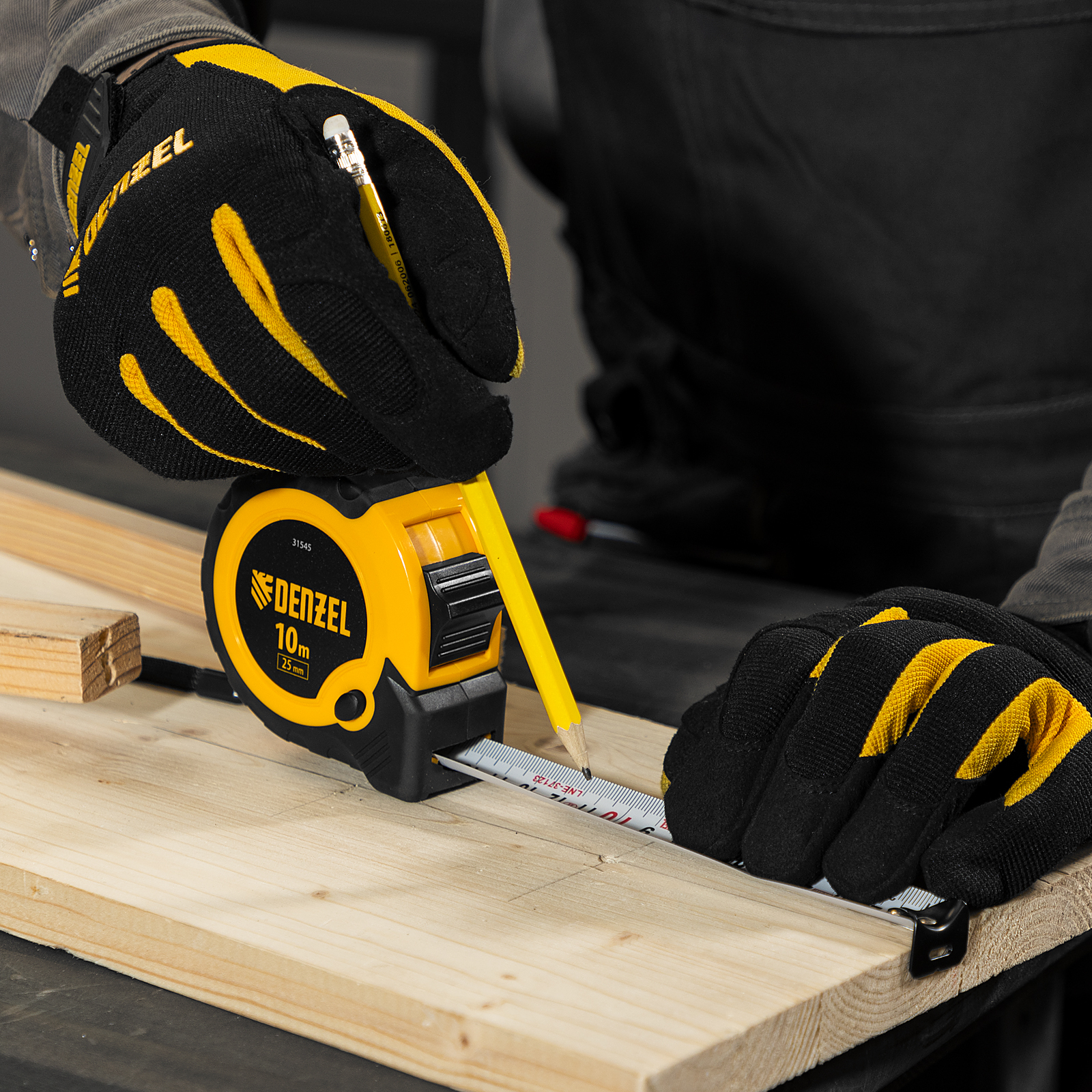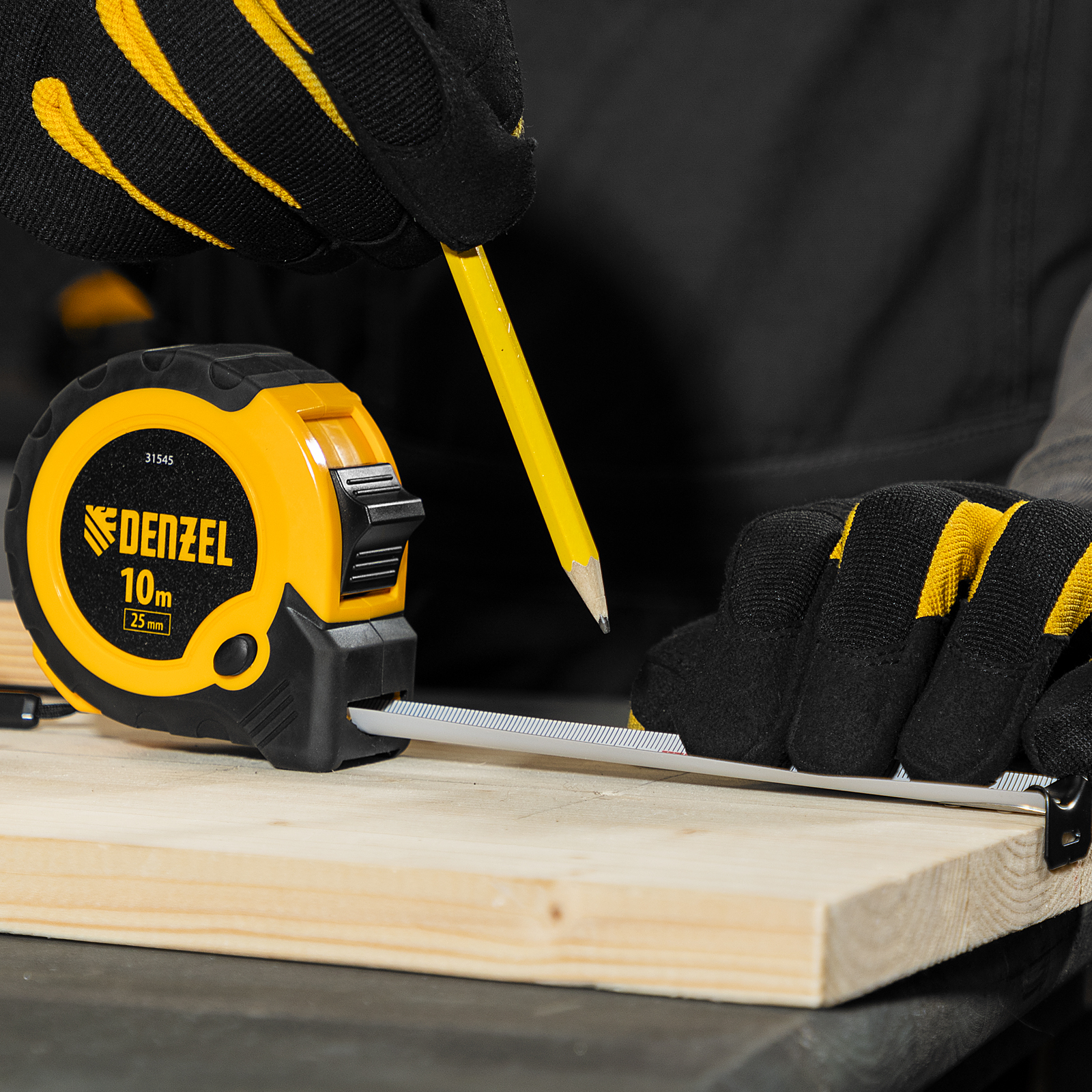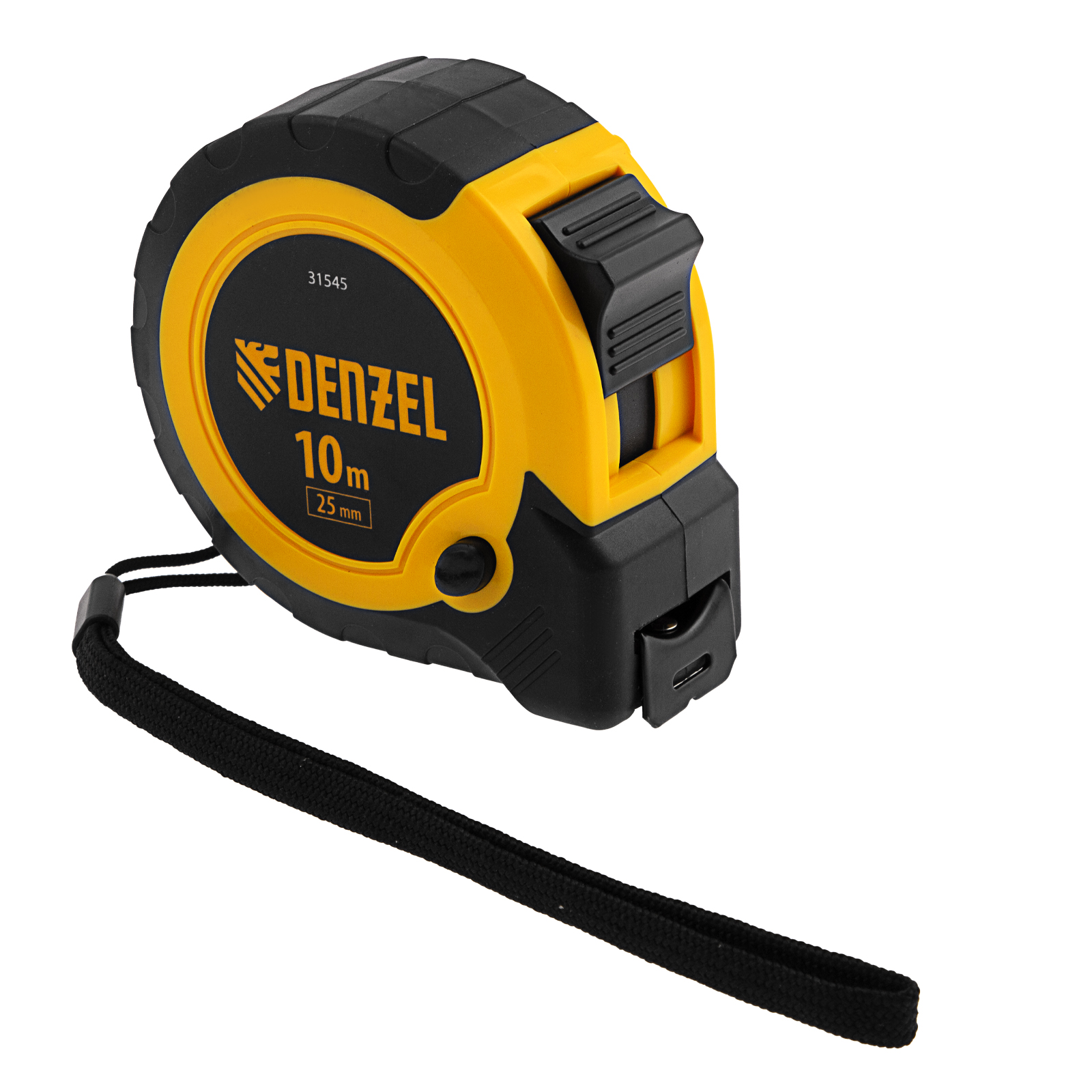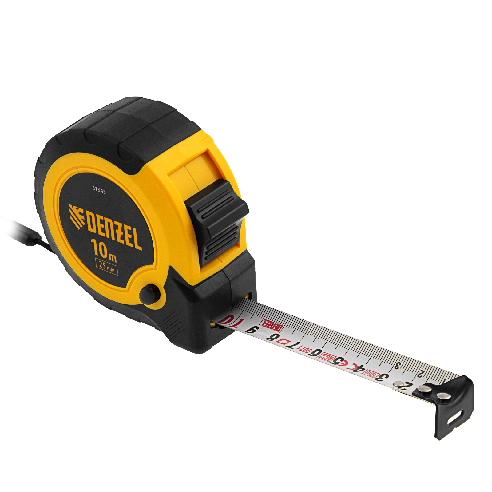 Рулетка Denzel 31545 в двухкомпонентном корпусе, с кнопкой-паузой, с полотном шириной 25 мм и длиной 10 м, используется для измерения расстояний и размеров предметов. Удобна для работы в труднодоступных местах. Стальная лента с эмалевым покрытием и защитной пластиной в месте крепления зацепа рассчитана на долгий срок службы. Рулетка будет полезна во время строительства и ремонта, а также пригодится в быту.