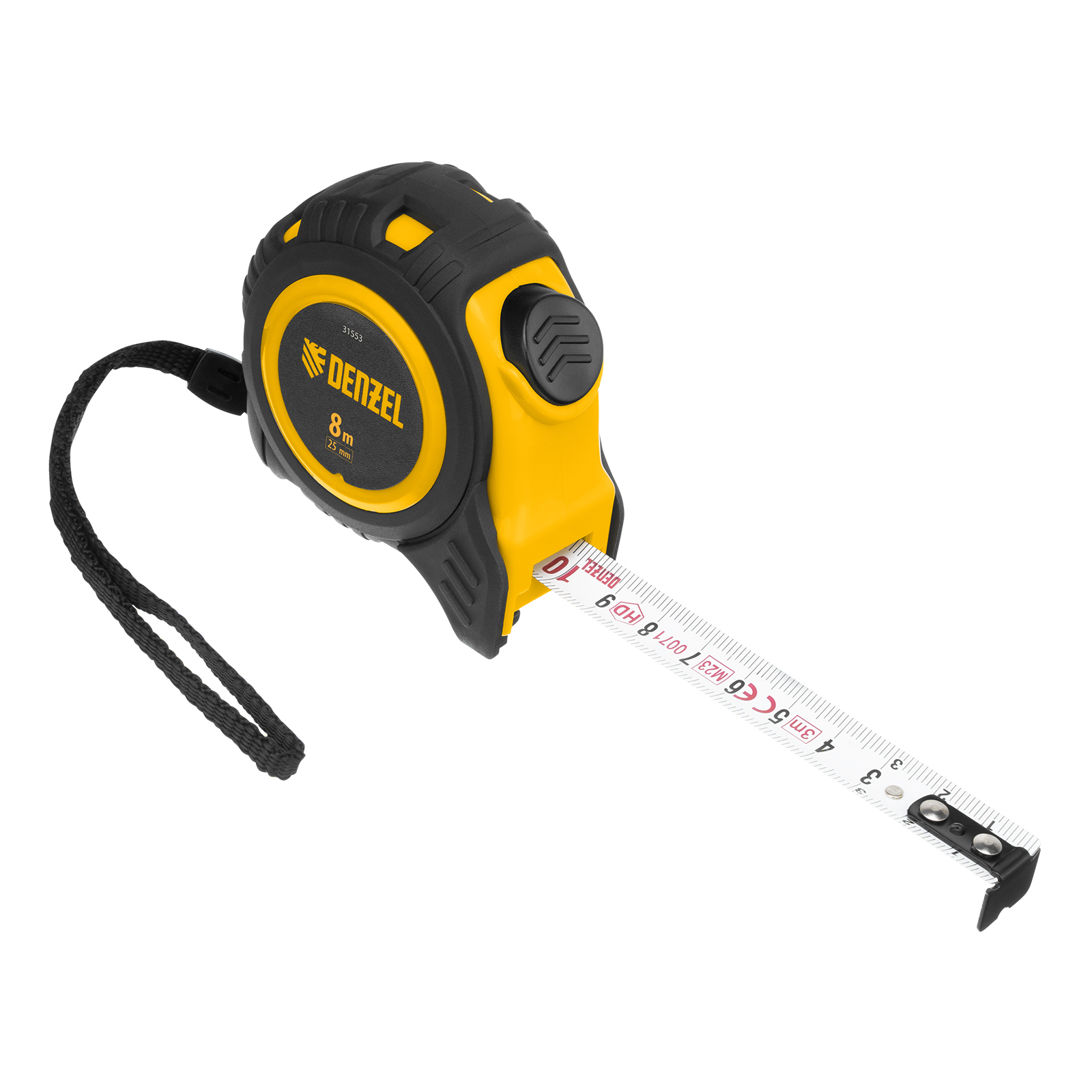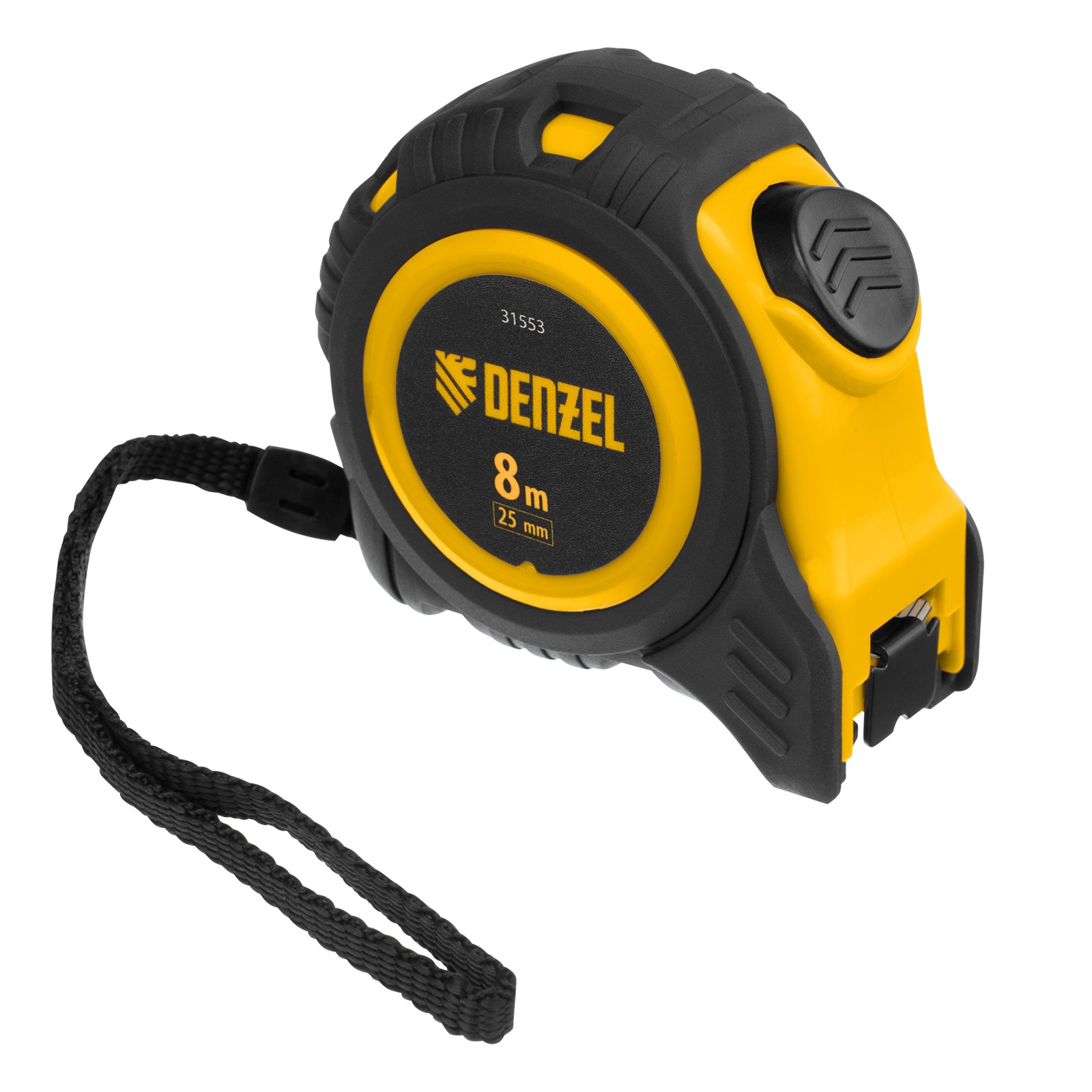 Рулетка Denzel 31553 в обрезиненном корпусе, с автоматической фиксацией, с полотном шириной 25 мм и длиной 8 м, используется для измерения расстояний и размеров предметов. Стальная лента с эмалевым покрытием и защитной пластиной в месте крепления зацепа рассчитана на долгий срок службы. Рулетка будет полезна во время строительства и ремонта, а также пригодится в быту.