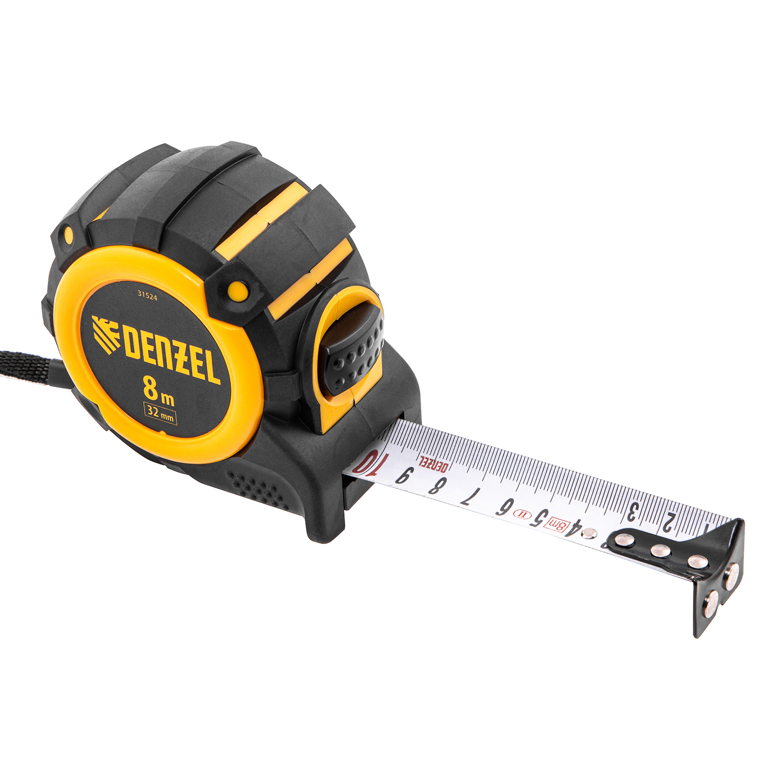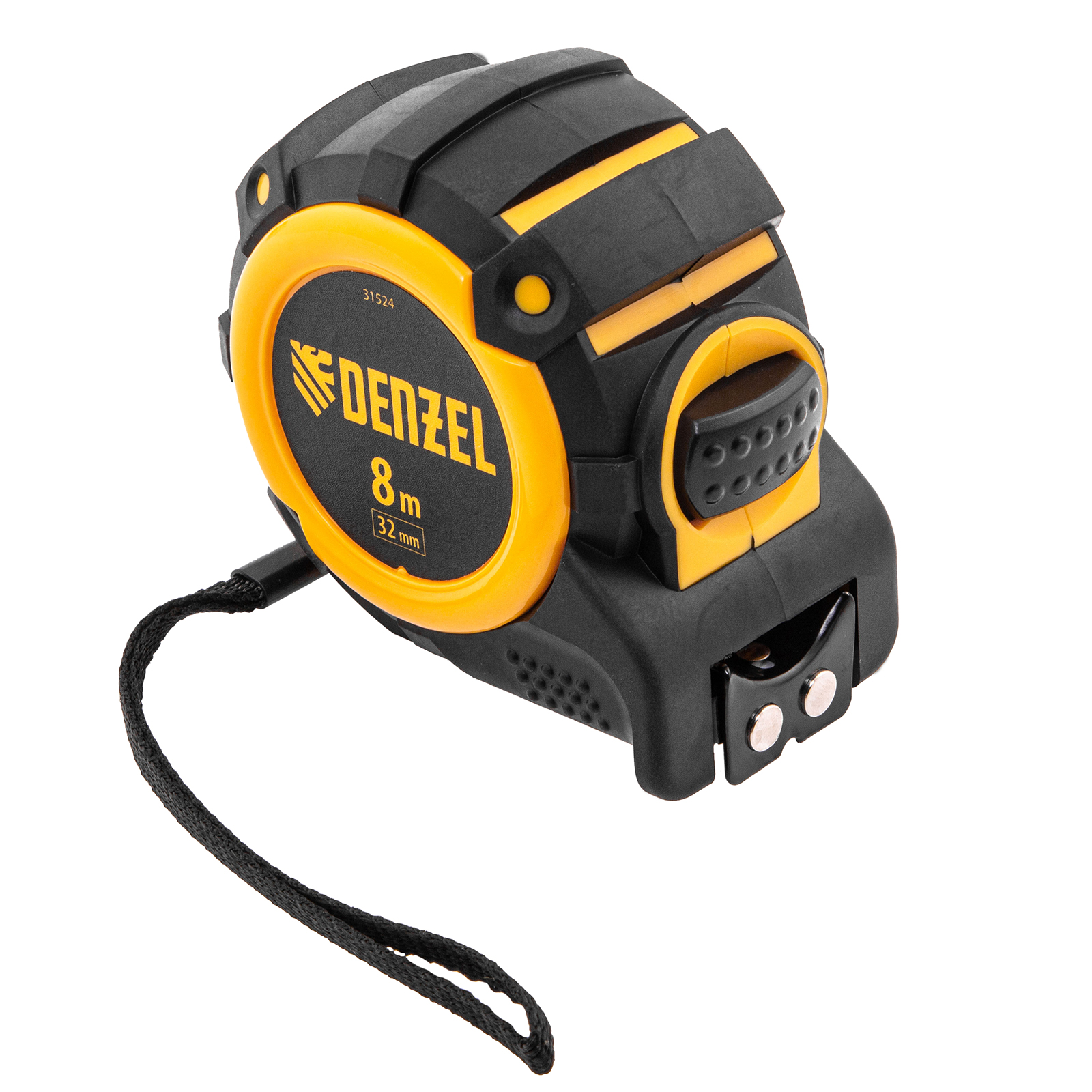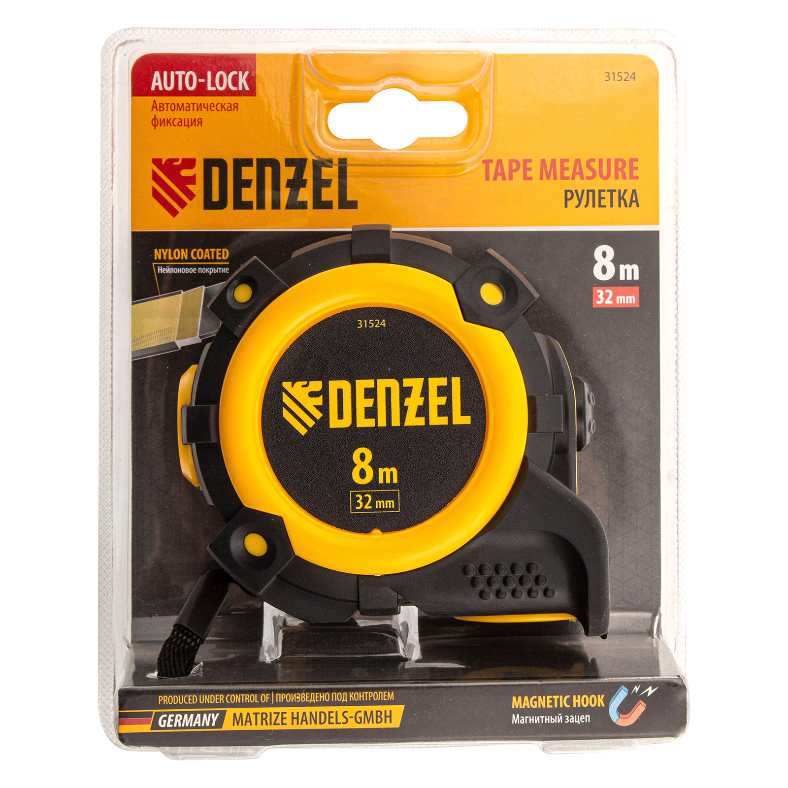 Рулетка Denzel 31524 с автоматической фиксацией полотна размером 8 м х 32 мм, с нейлоновым покрытием, магнитным зацепом и двухсторонней разметкой, предназначена для измерения расстояний и определения габаритов различных предметов. Лента автоматически фиксируется в вытянутом положении, что упрощает работу. Рулетка удобна для работы в труднодоступных местах, будет полезна во время строительных и ремонтных работ.