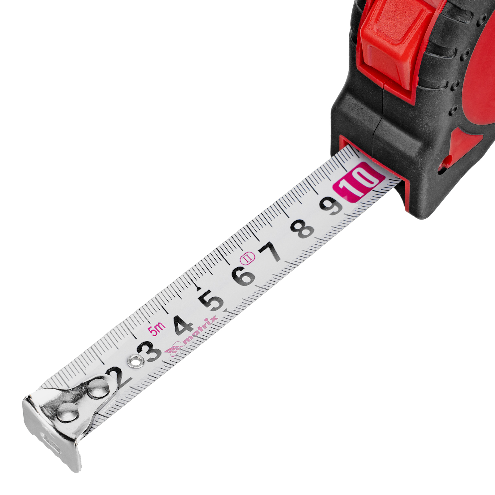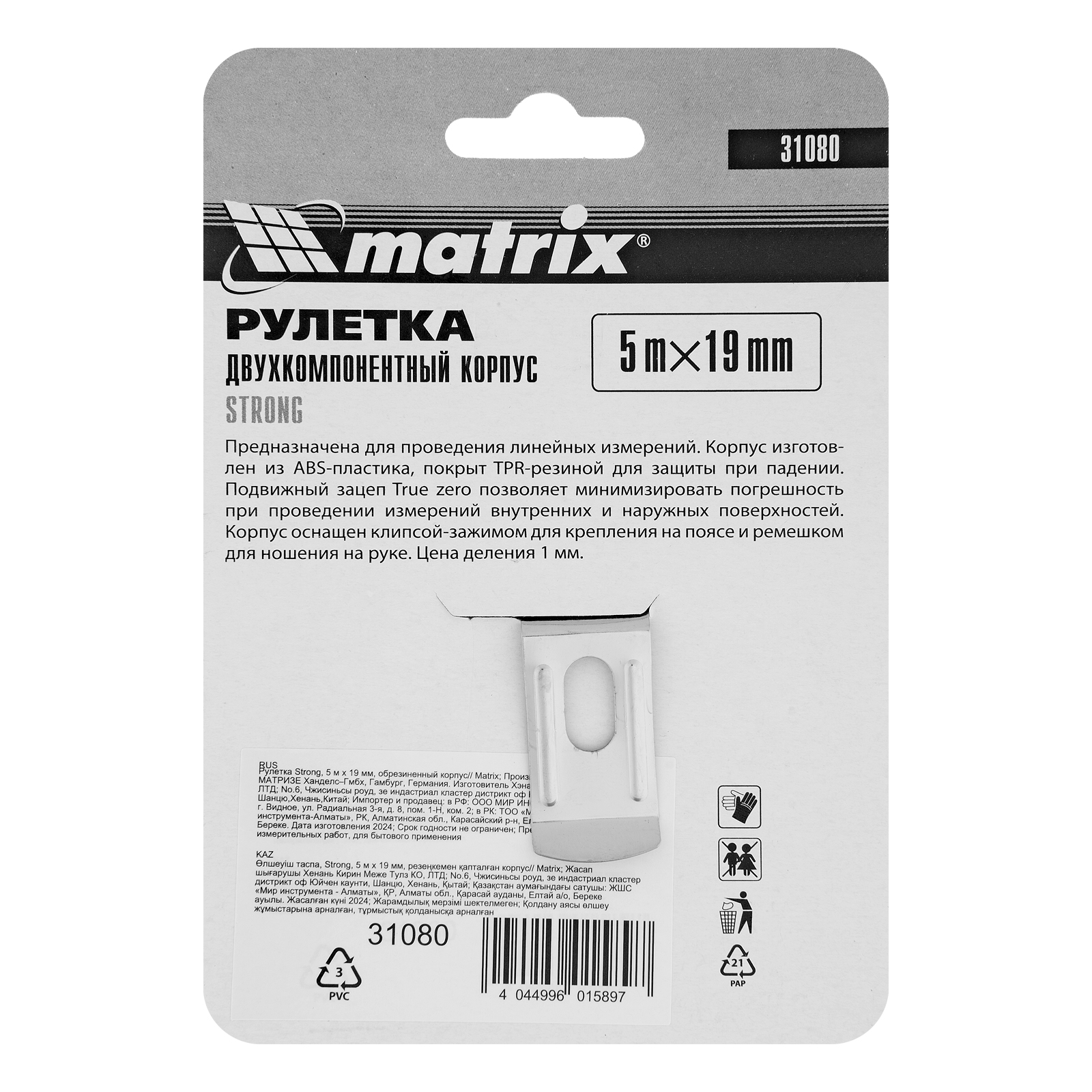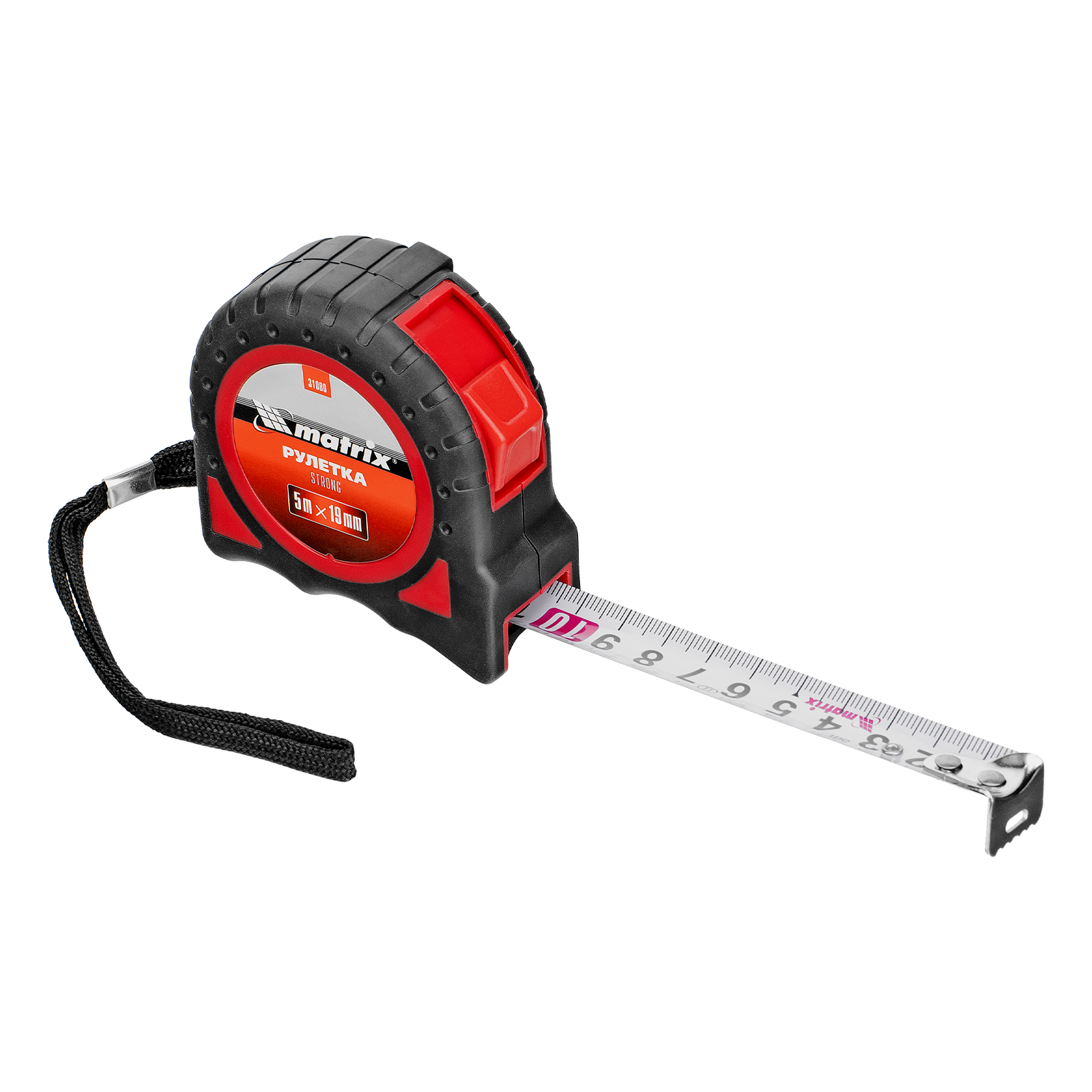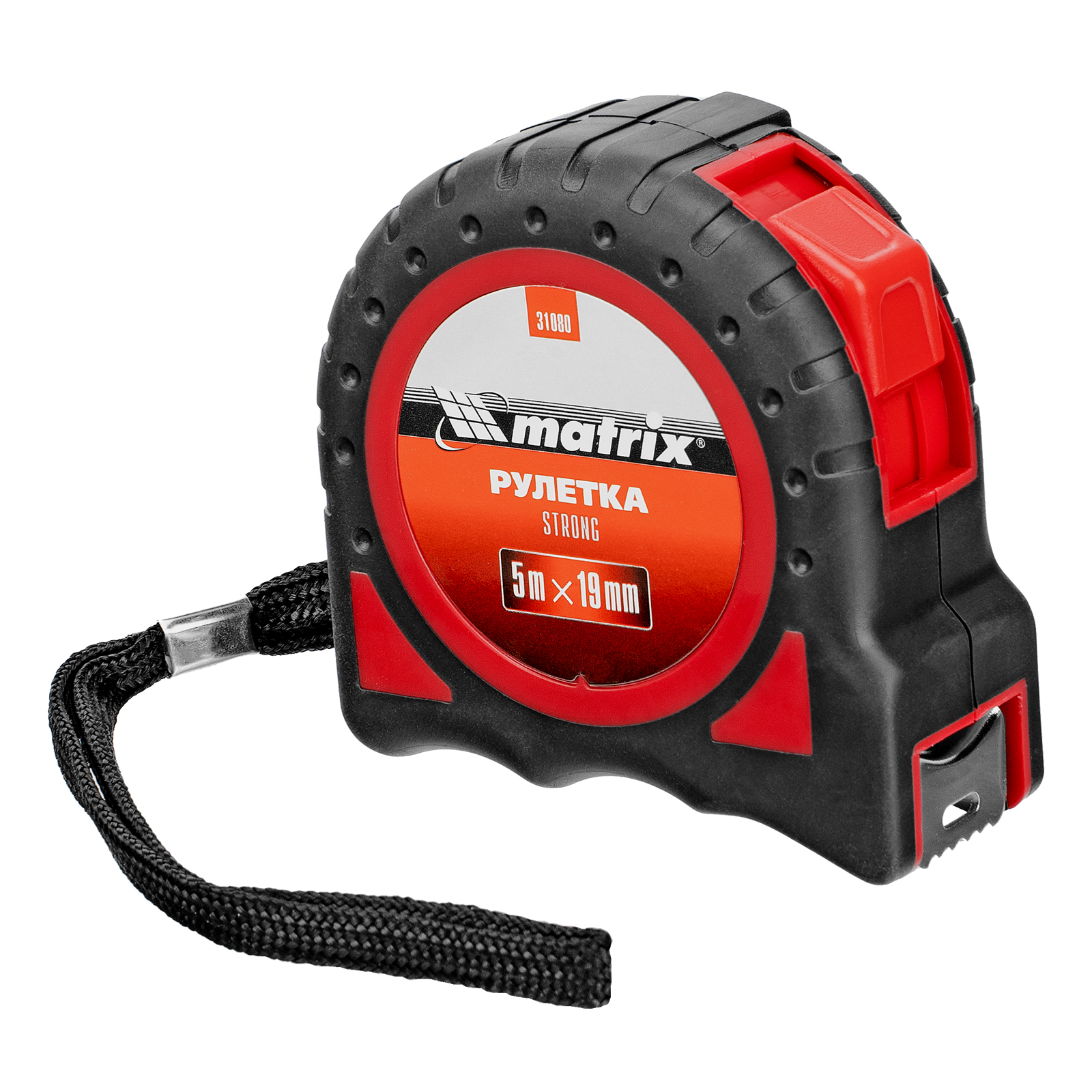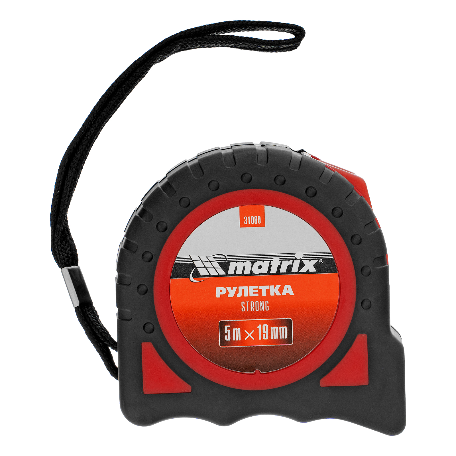 Рулетка Matrix Strong 31080 с измерительной лентой длиной 5 м и шириной 19 мм, в обрезиненном корпусе, предназначена для определения размеров и расстояний. Частично обрезиненный корпус из ударопрочного ABS-пластика устойчив к повреждениям, что уменьшает риск его поломки в случае падения или удара. Стальная лента с зацепом, прикрепленным заклепками, рассчитана на длительное использование. Рулетка пригодится на строительной площадке, во время ремонта, а также дома или на даче.