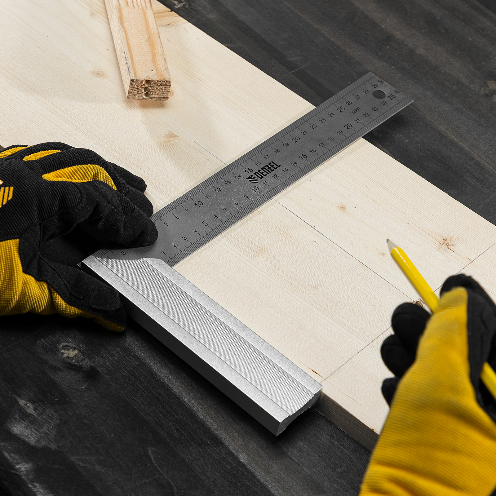Стальной угольник Denzel 32397 длиной 300 мм, с градуировкой, алюминиевым основанием и полотном из нержавеющей стали, используется для построения и контроля углов. Будет полезен для выполнения столярных и строительных работ.