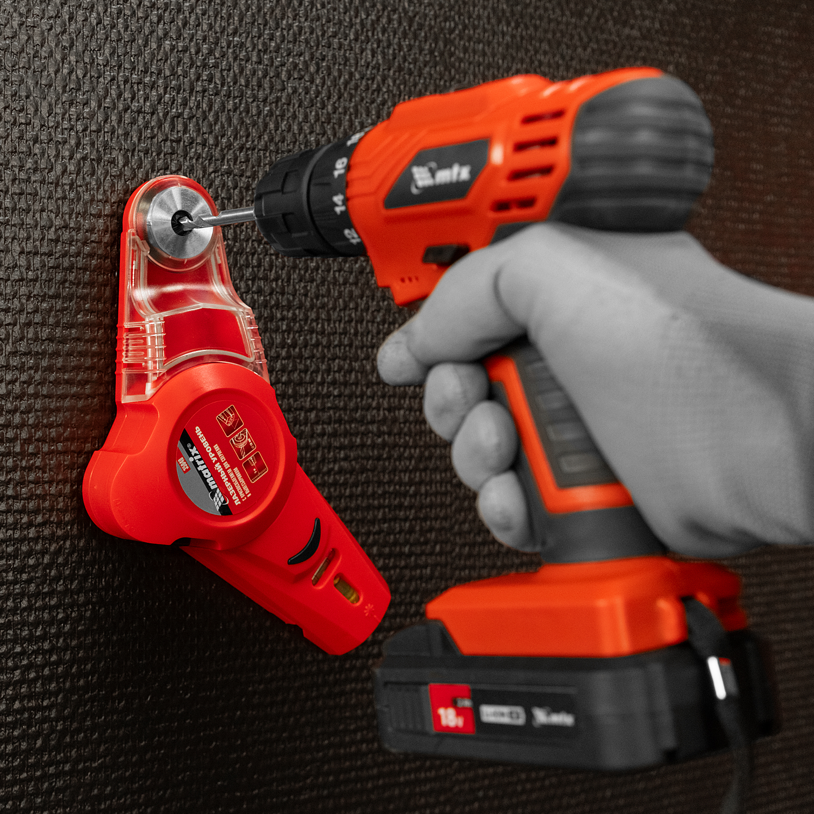 Отверстие для сверления совместимо со сверлами диаметром 10 мм. Благодаря встроенному компрессору не нужно удерживать уровень в руках — он надежно «присасывается» к рабочей поверхности, например, к стене. Инструмент очень прост в применении, с ним справится пользователь с любым уровнем подготовки.