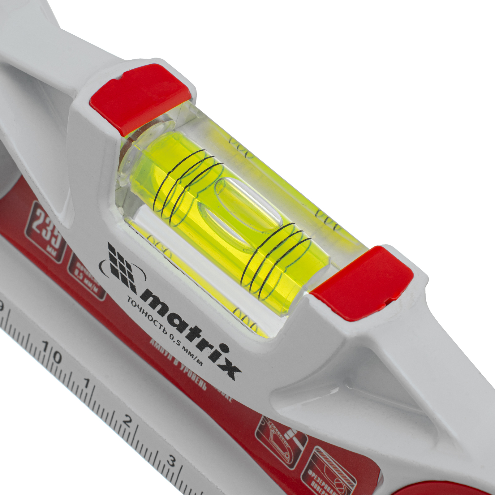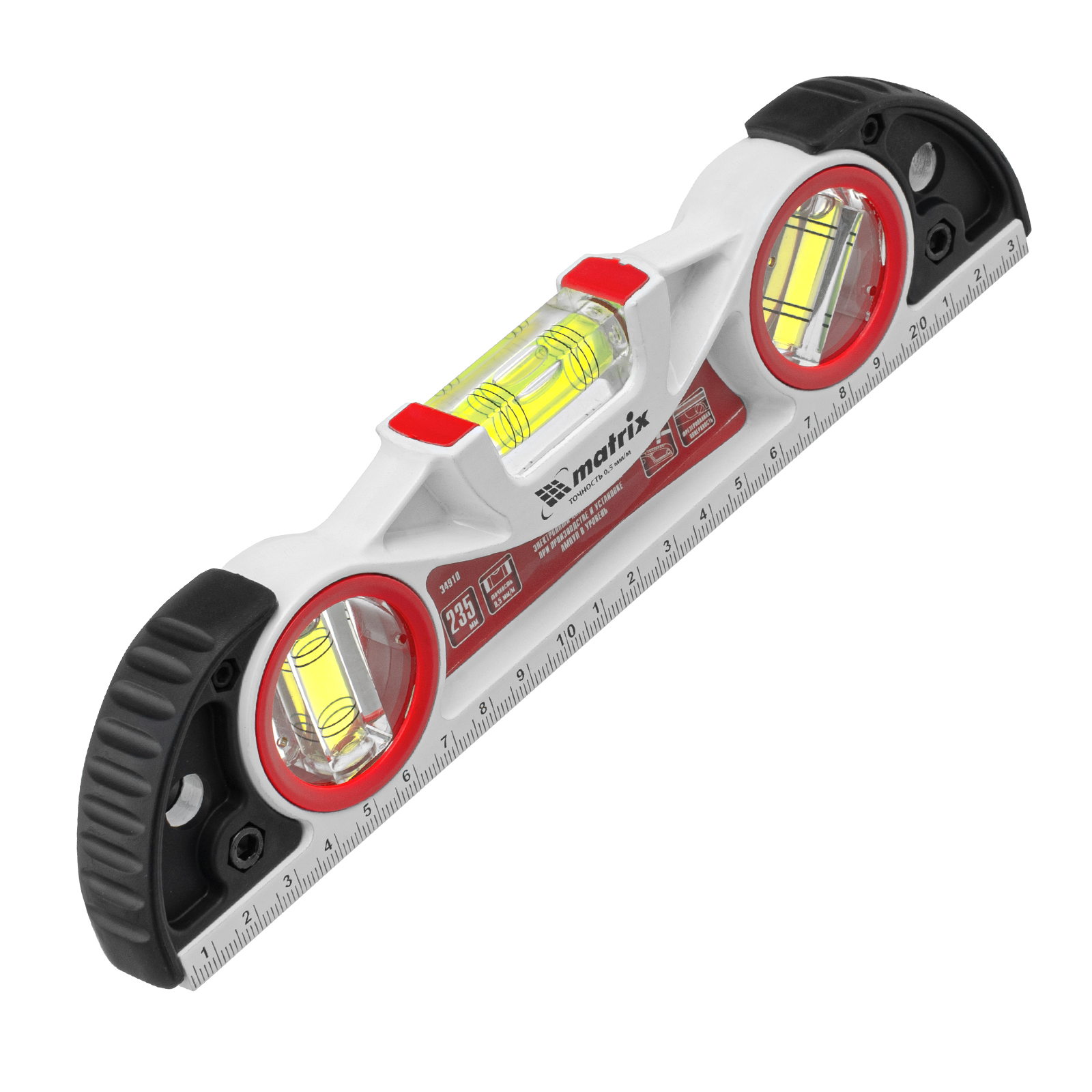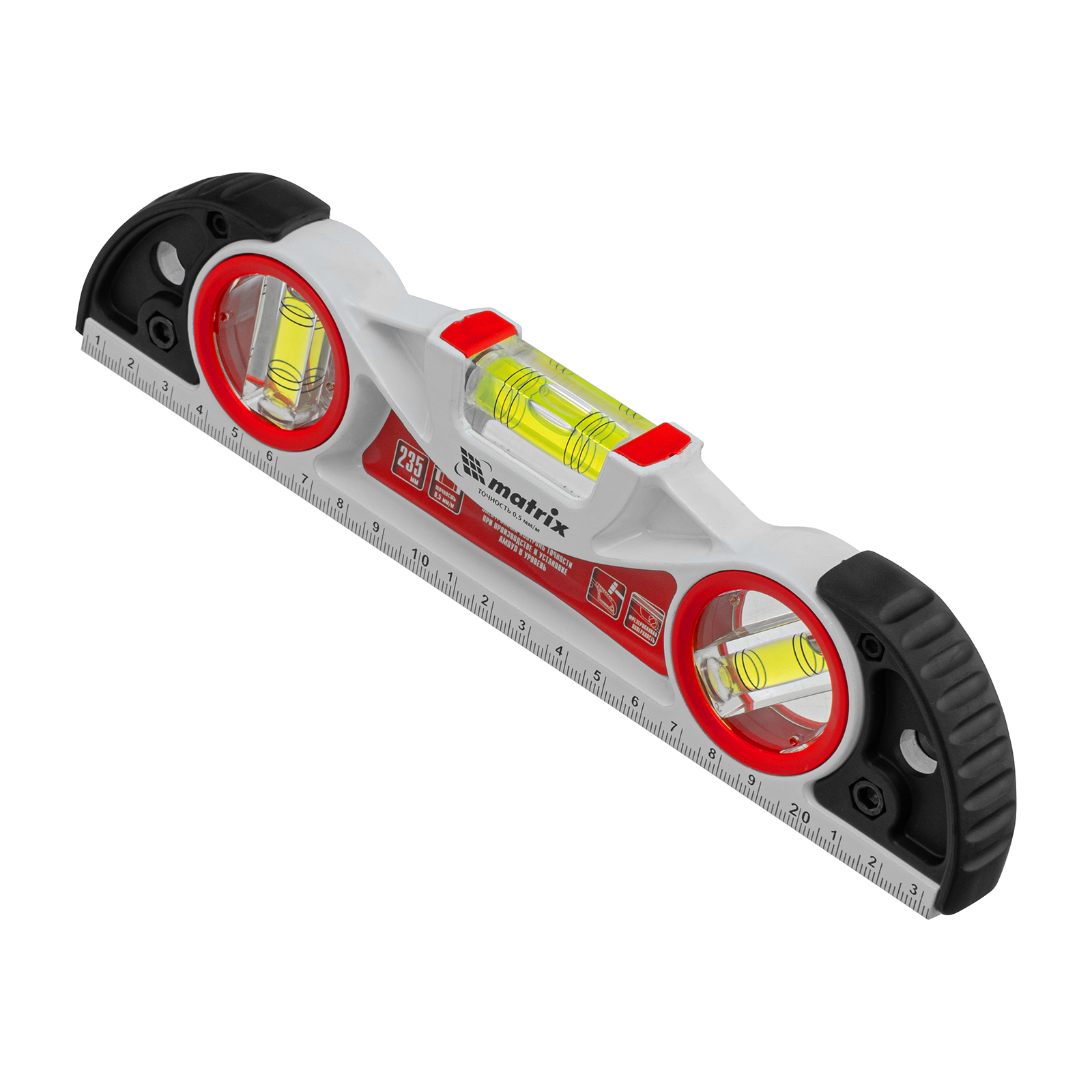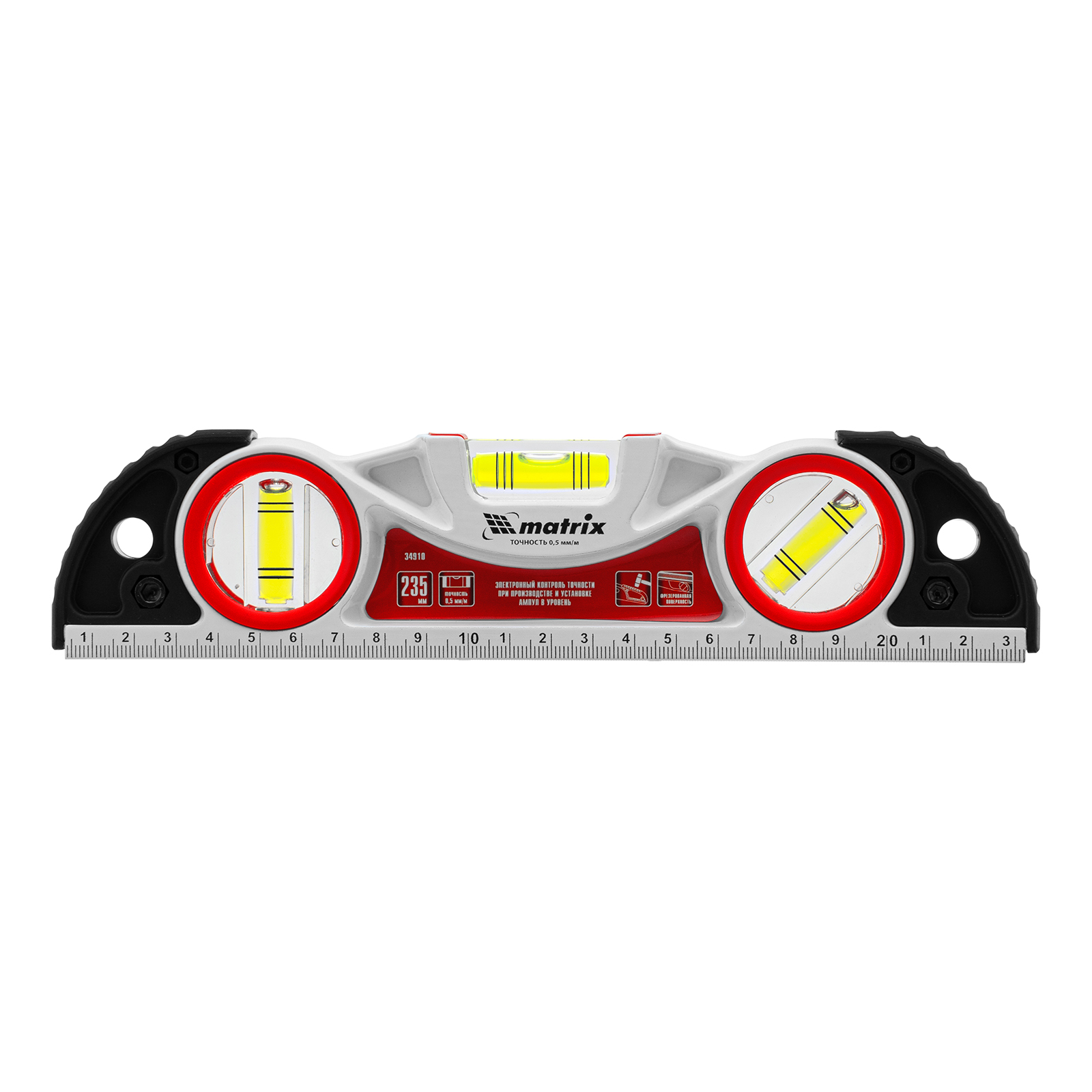 Уровень алюминиевый литой Matrix 34910 длиной 235 мм, с фрезерованной рабочей частью, 3 глазками и двумя ударными площадками, предназначен для проверки поверхностей на отклонение от горизонтали, вертикали и угла 45°. Инструмент значительно повышает точность проводимых работ, пригодится частному мастеру и профессионалу на строительной площадке, во время ремонта и для проведения монтажных работ.