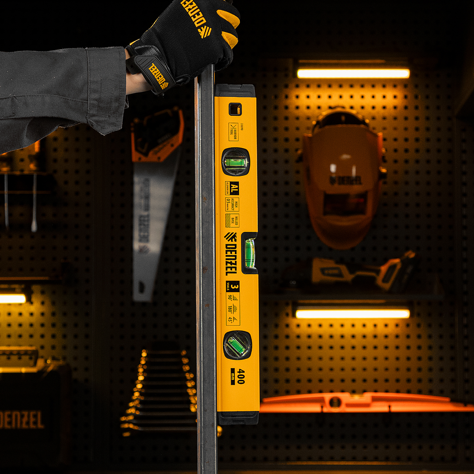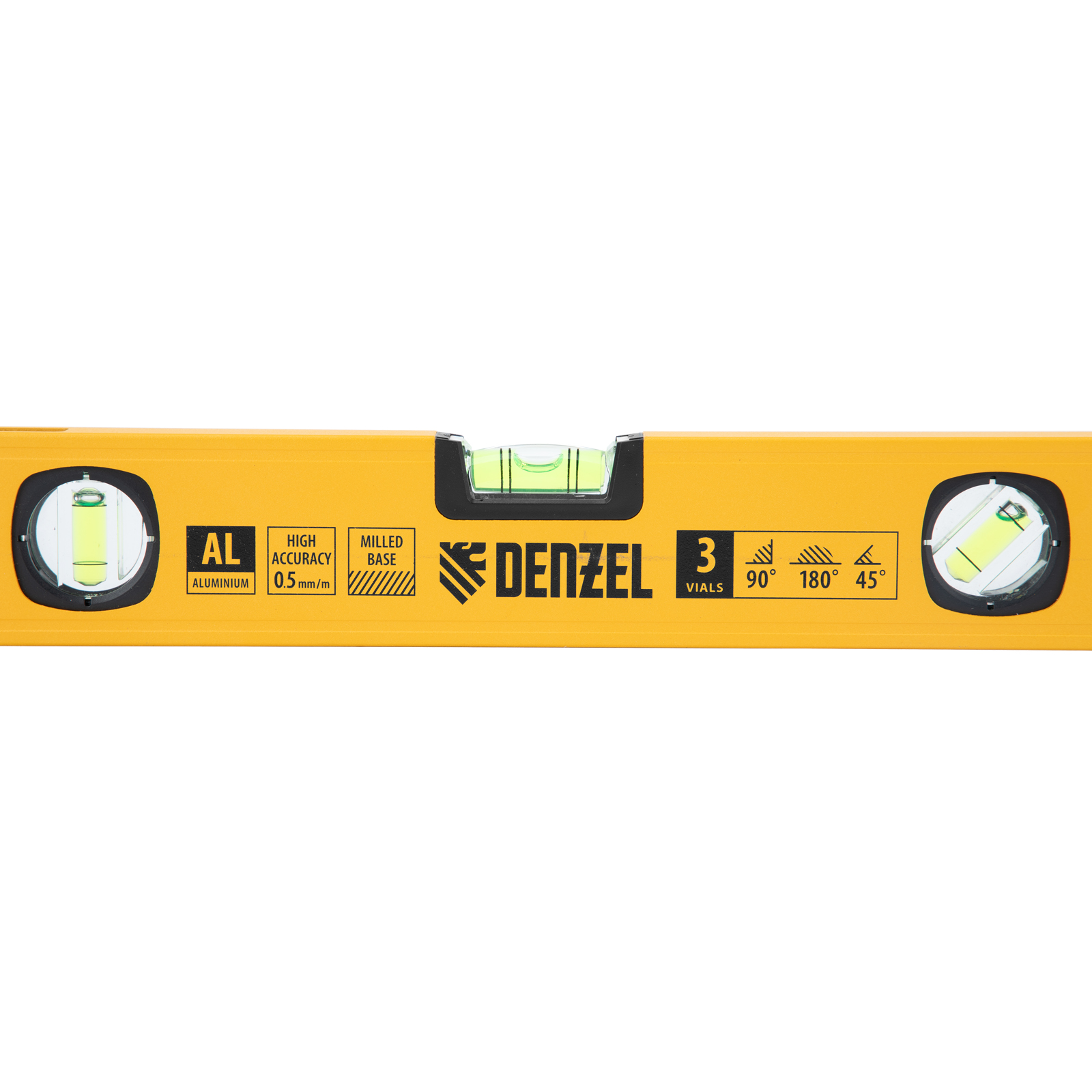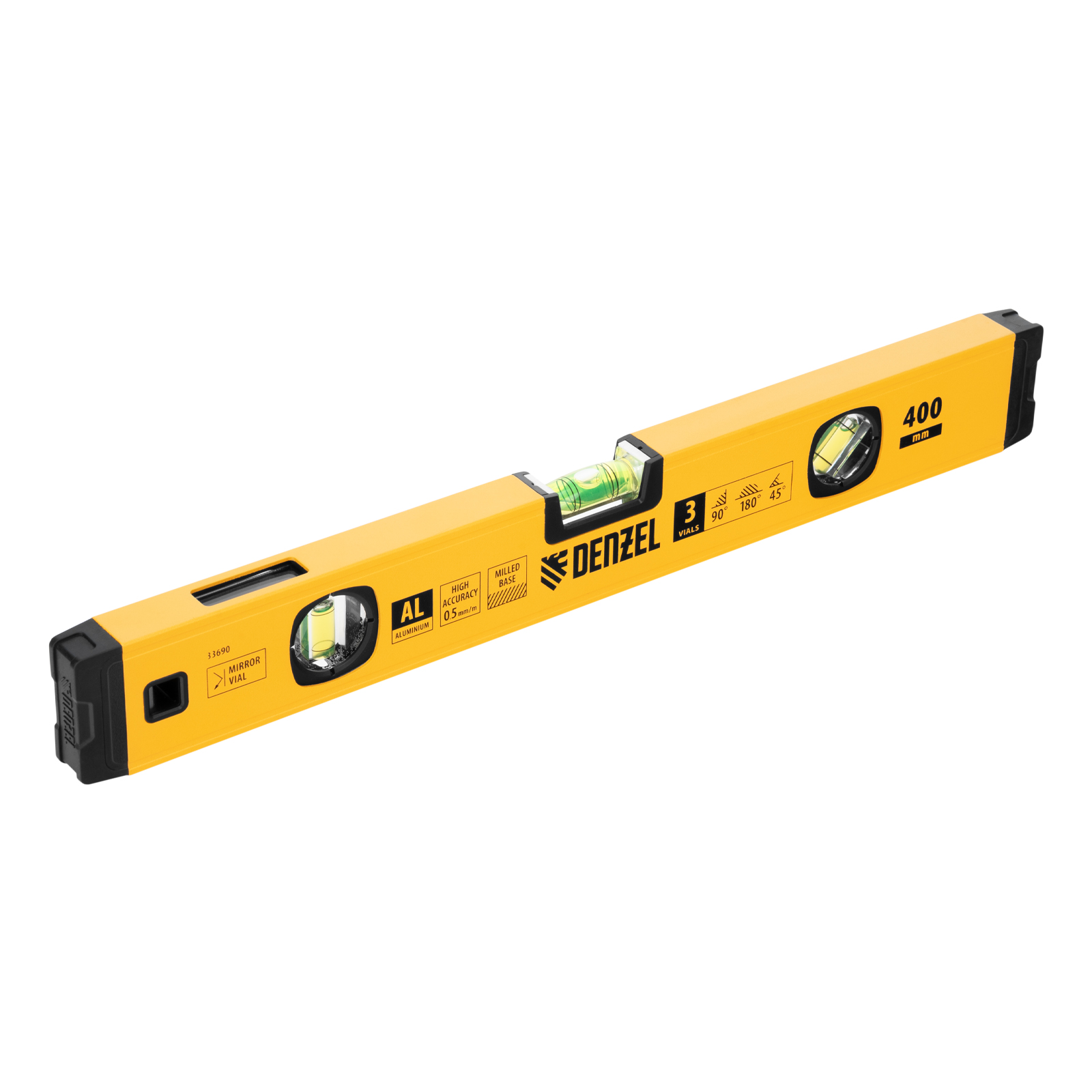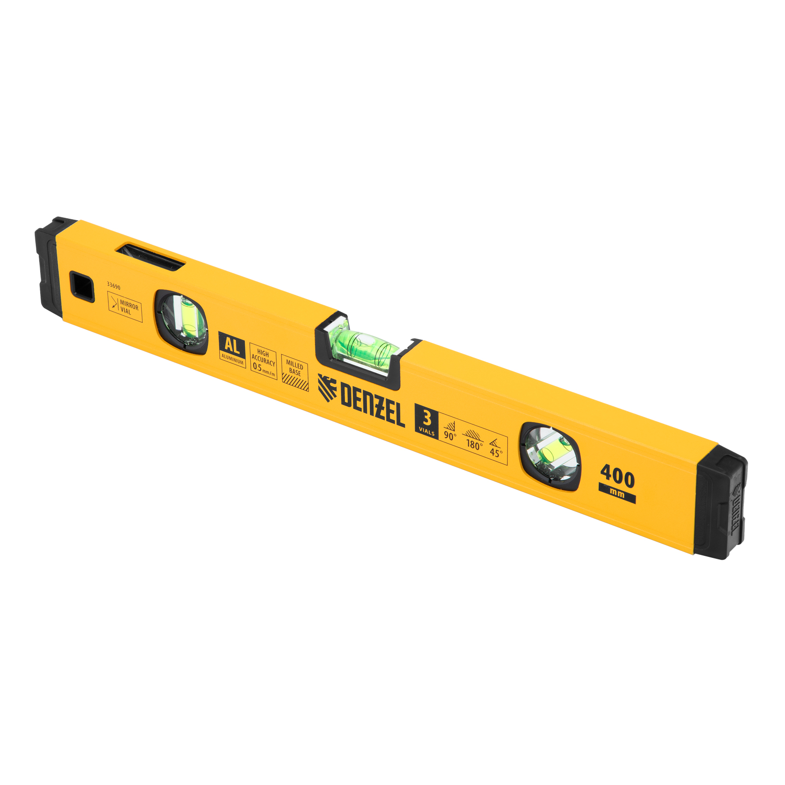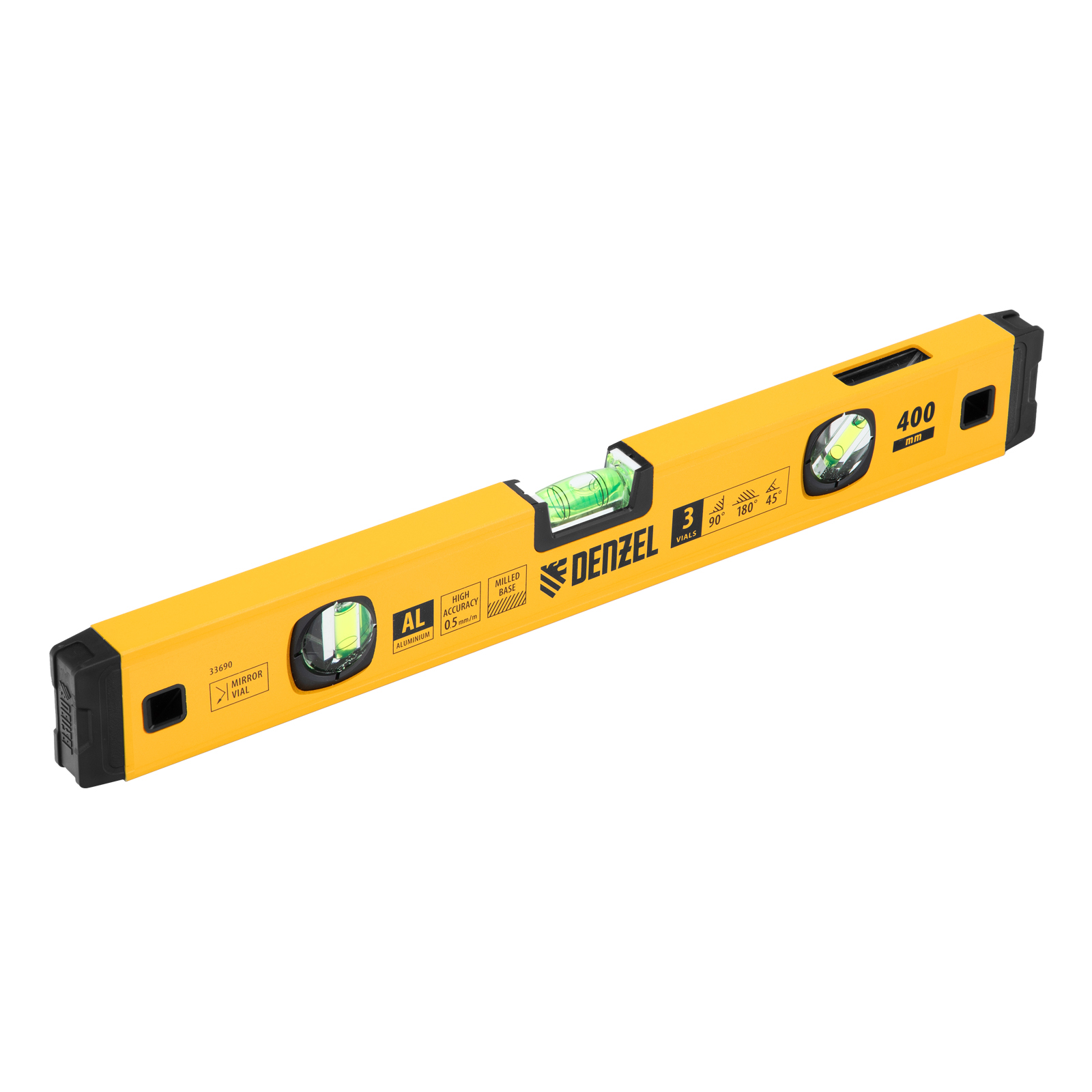 Алюминиевый фрезерованный уровень Denzel 33690 длиной 400 мм, с магнитом и 3 глазками, из которых 1 зеркальный, предназначен для контроля отклонений от горизонтальной, вертикальной и поверхности под углом 45° с точностью 0,5 мм/м. 3 пузырьковые камеры 90°, 180° и 45° позволяют быстро проверить правильность разметки. Инструмент незаменим при проведении строительных, ремонтных, сантехнических работ.