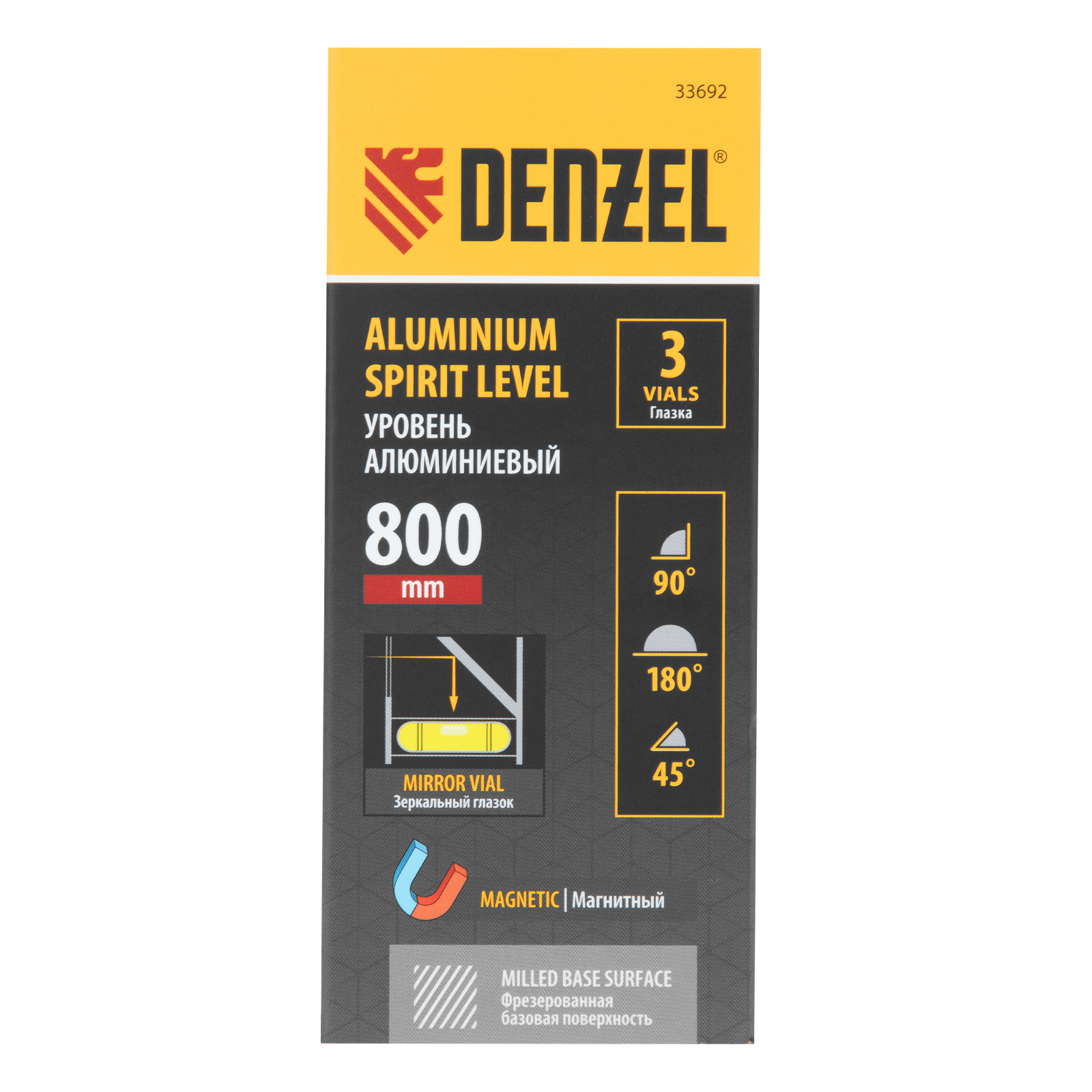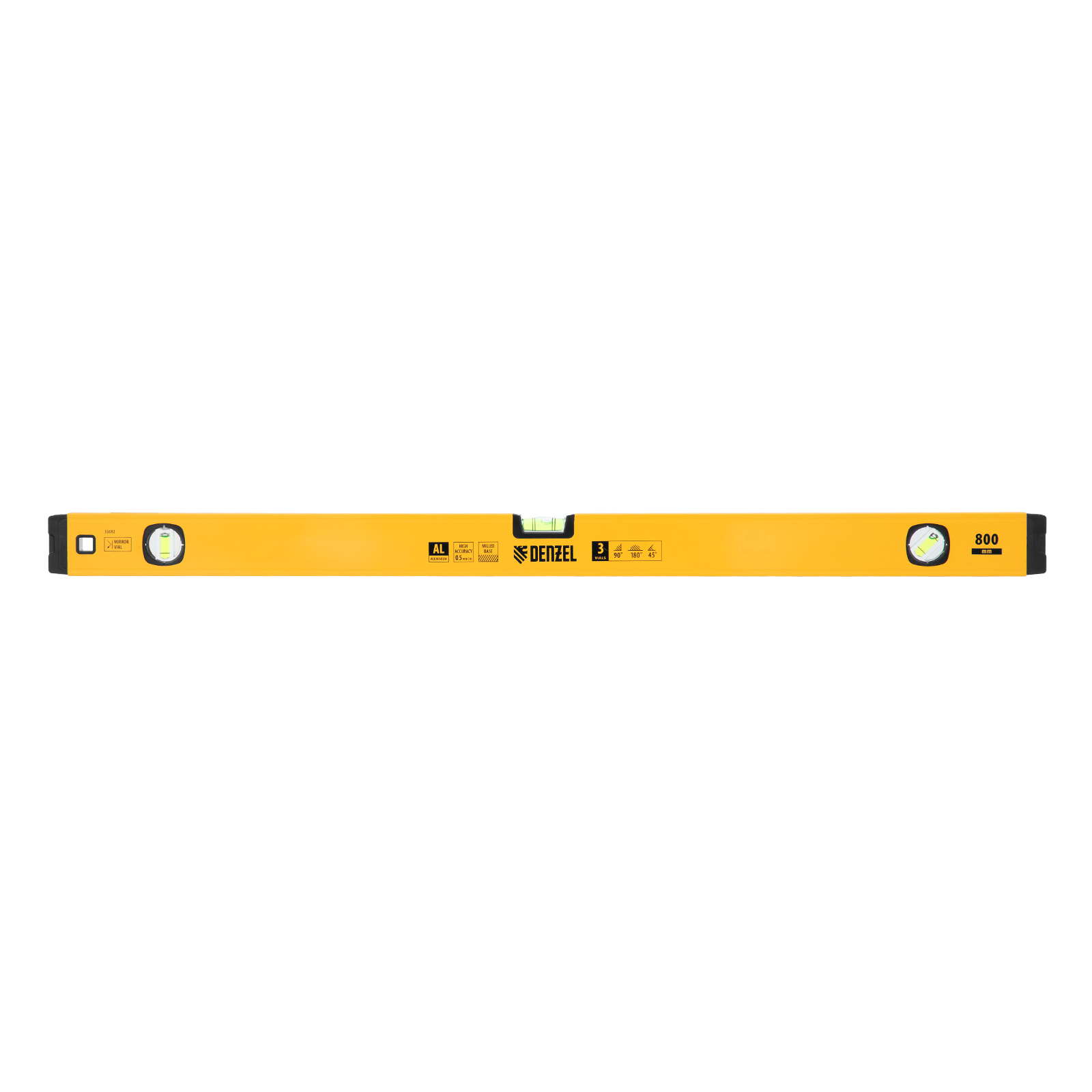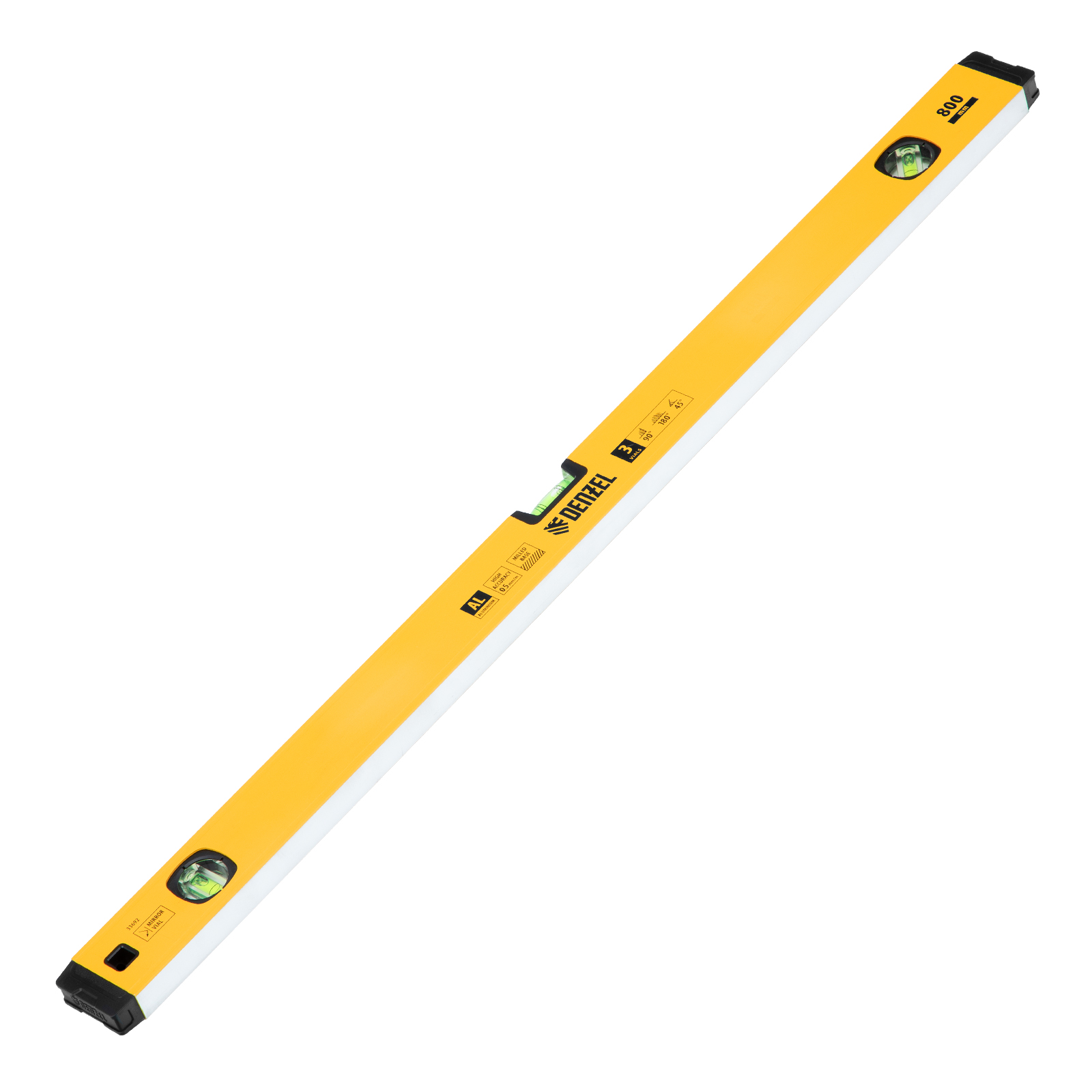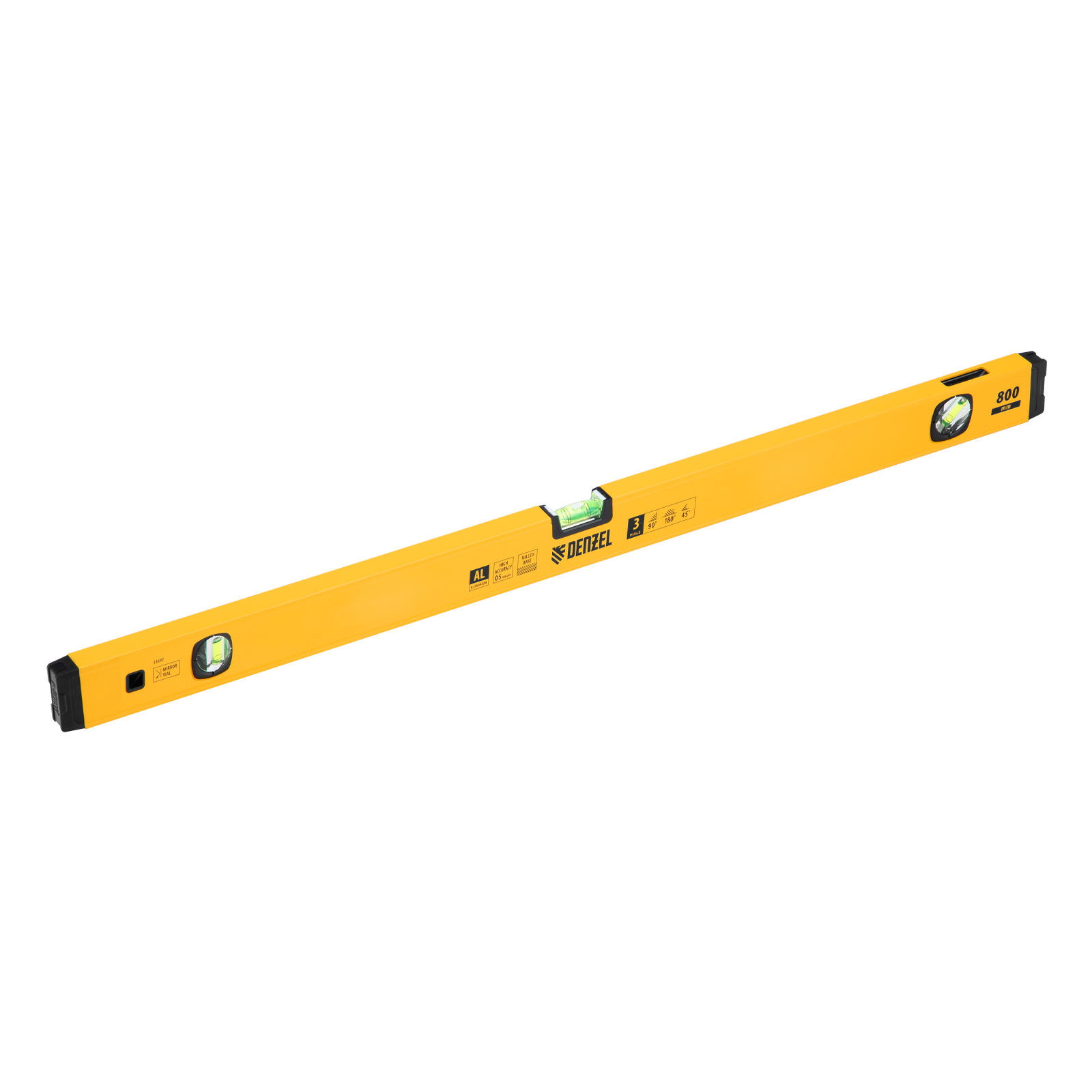Алюминиевый фрезерованный уровень Denzel 33692 длиной 800 мм, с магнитом и 3 глазками, из которых 1 зеркальный, предназначен для контроля отклонений от горизонтальной, вертикальной и поверхности под углом 45° с точностью 0,5 мм/м. 3 пузырьковые камеры 90°, 180° и 45° позволяют быстро проверить правильность разметки. Инструмент незаменим при проведении строительных, ремонтных, сантехнических работ.