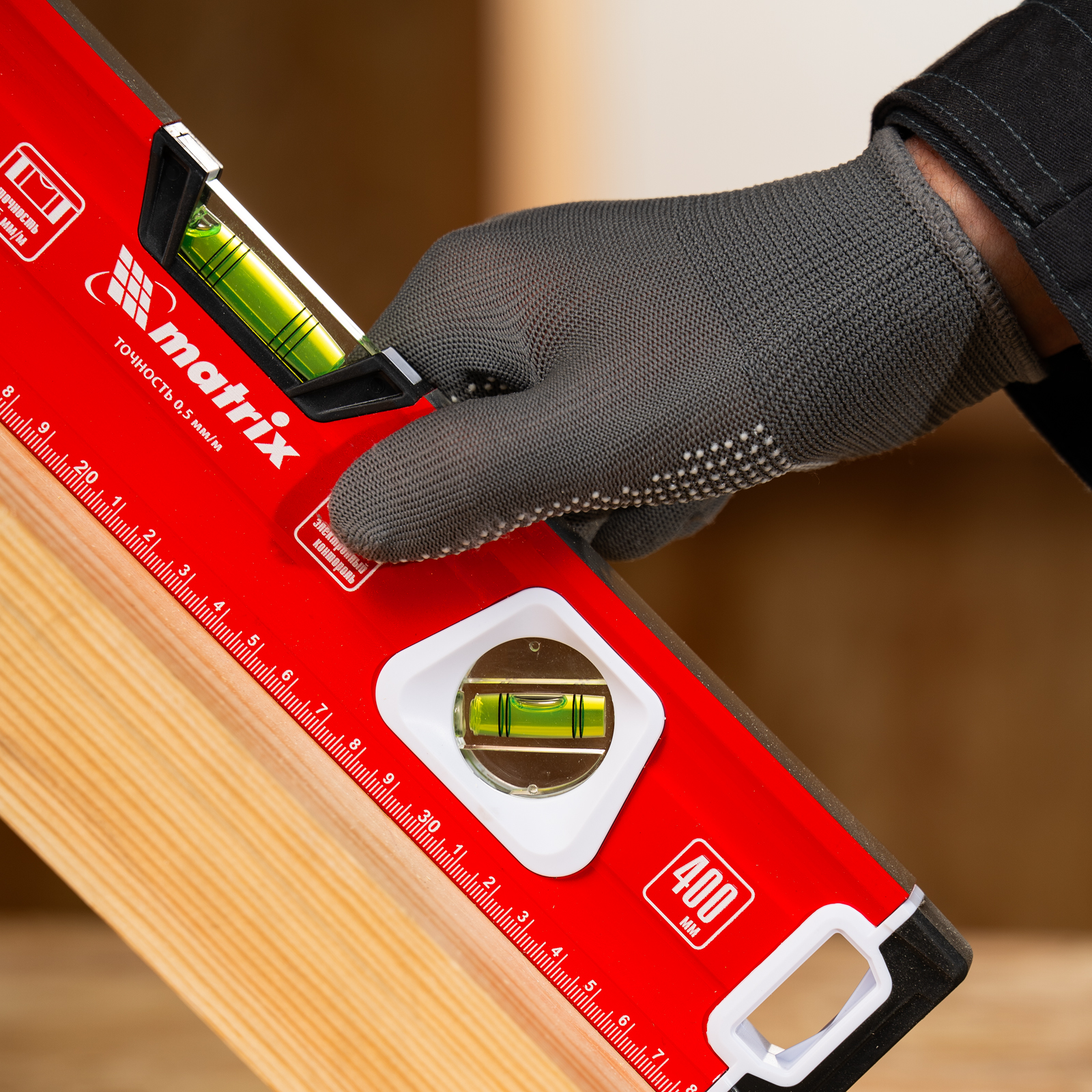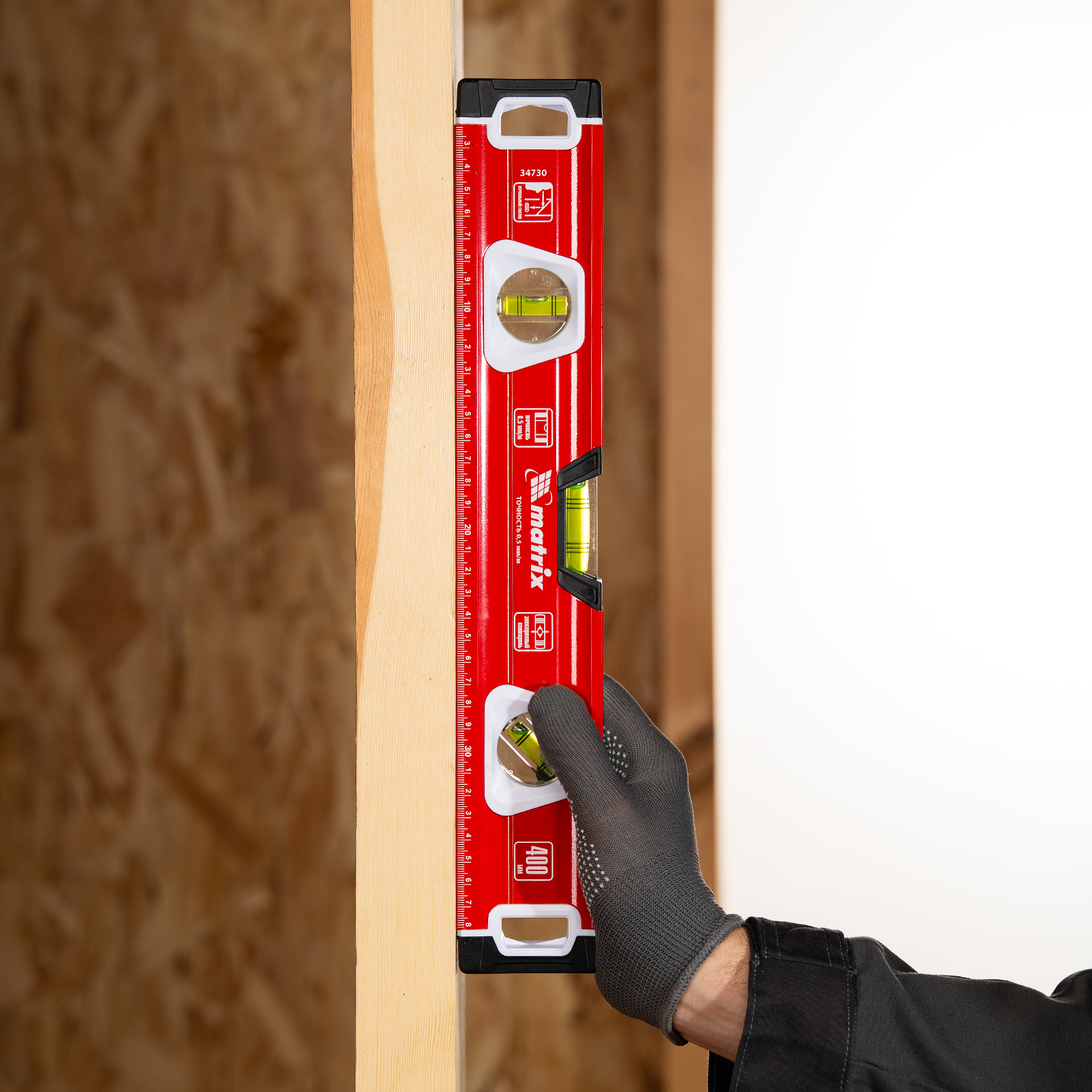Уровень алюминиевый фрезерованный Matrix 34730 длиной 400 мм используется при монтаже конструкций и материалов. Позволяет обнаружить отклонения от вертикали, горизонтали и угла 45°, что повышает точность строительных и ремонтных работ.
