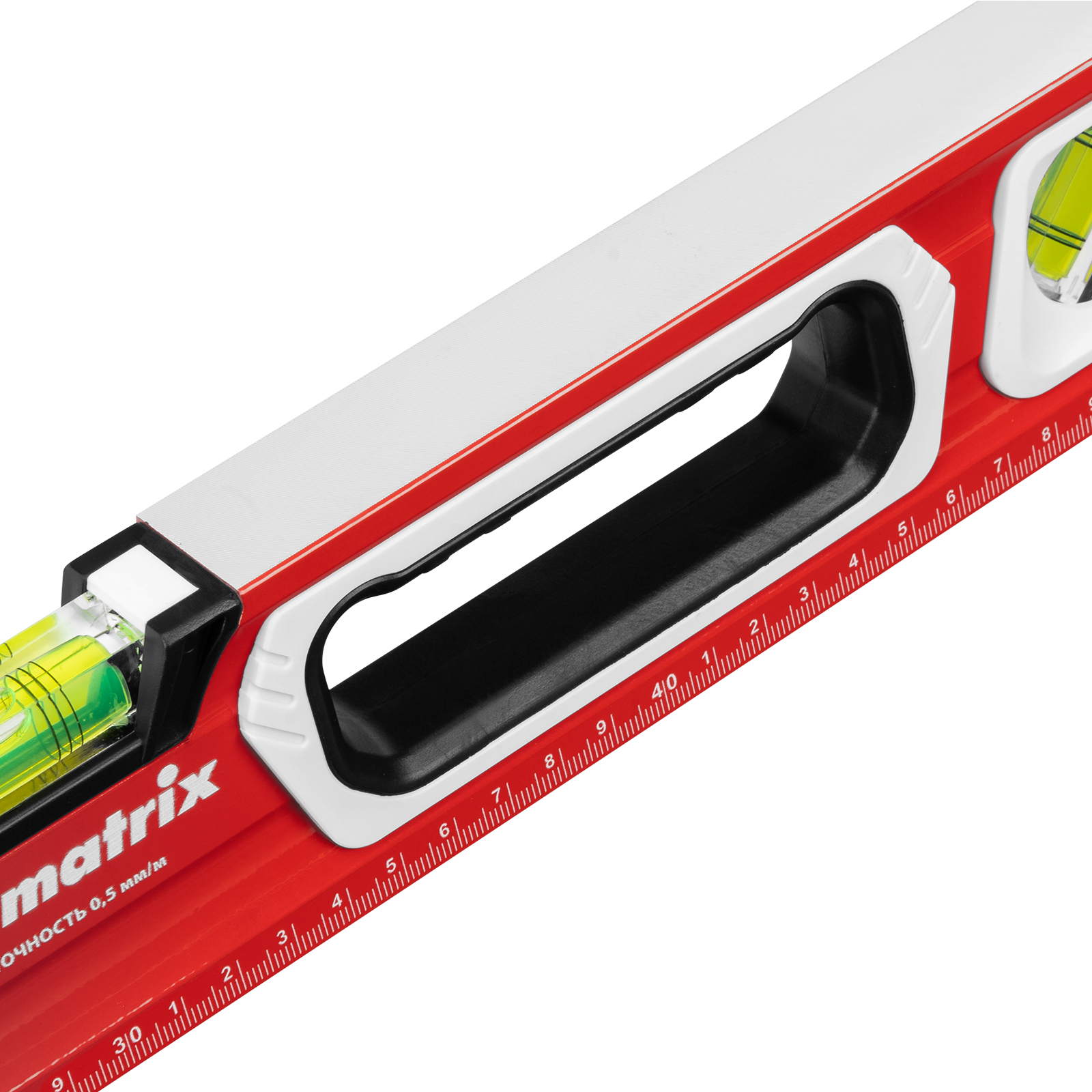 Алюминиевый уровень Matrix 34731 длиной 600 мм, магнитный, фрезерованный, с двухкомпонентными рукоятками, 3 глазками и 1 зеркальным отражателем, относится к категории измерительных инструментов. Служит для контроля отклонений поверхностей от горизонтали, вертикали и угла 45 градусов. Инструмент понадобится при осуществлении работ, требующих высокой точности.,Для определения отклонения вертикали 90 градусов необходимо использовать пузырьковую ампулу только в верхнем положении уровня. Только базовая поверхность является рабочей (противоположная ампуле 180 градусов).