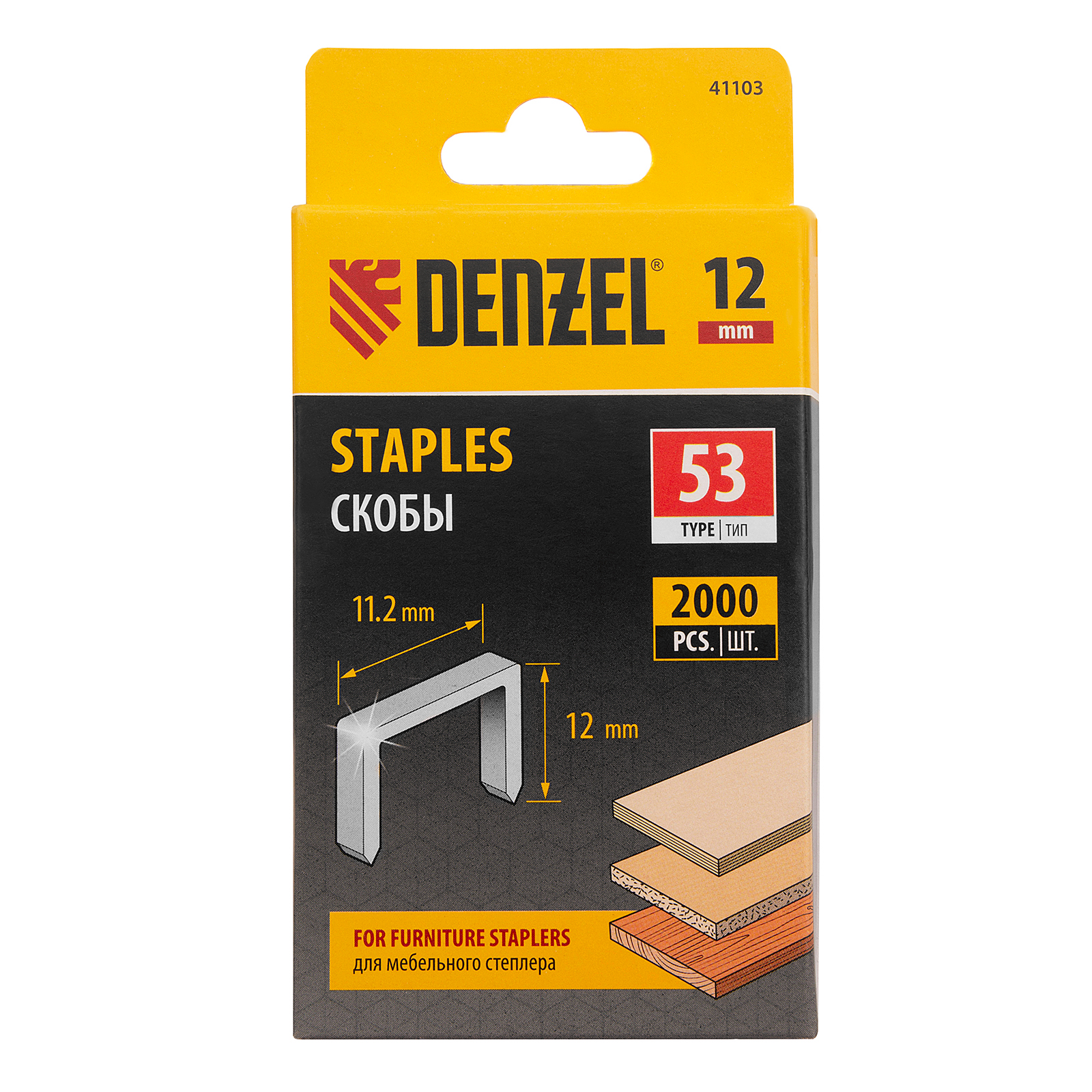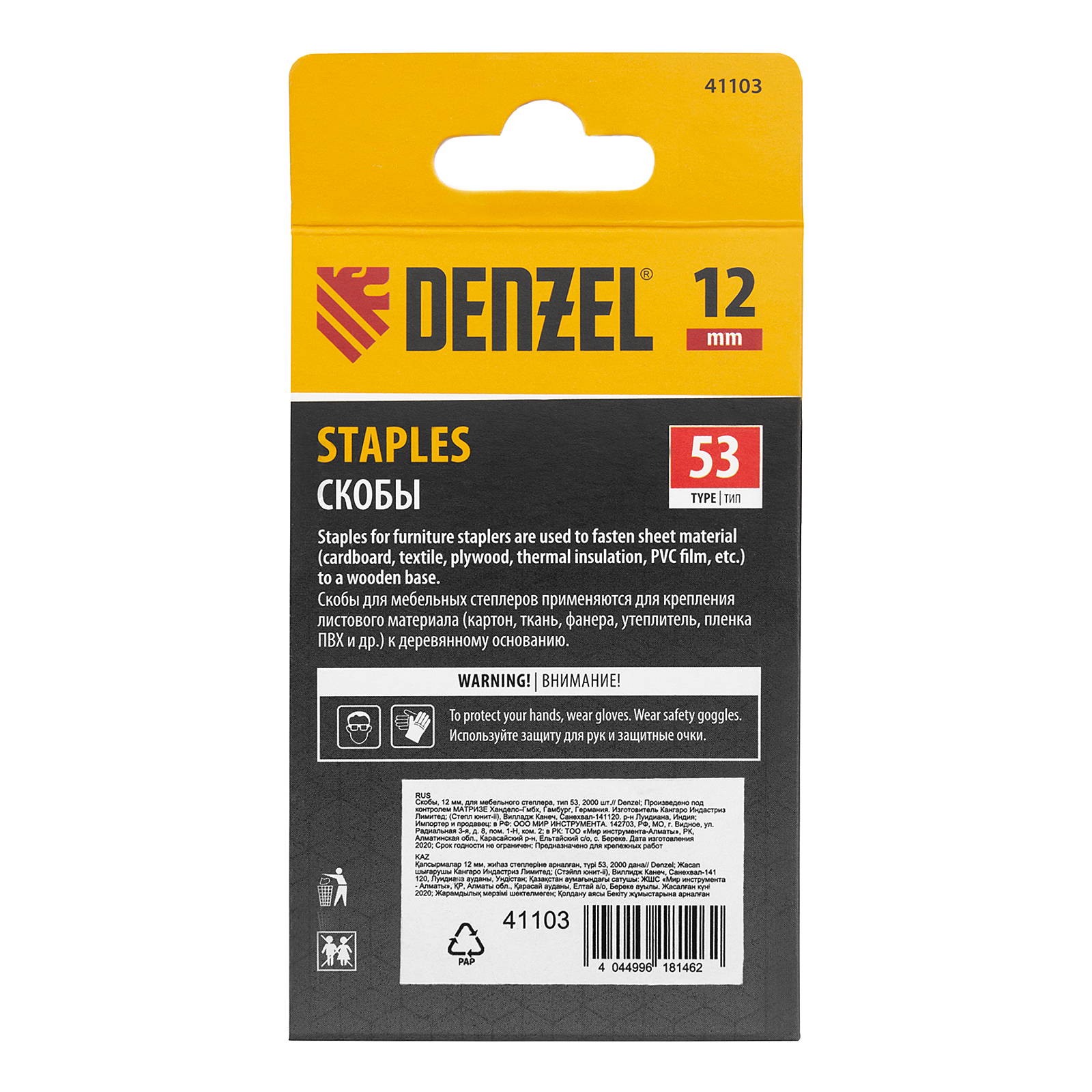 Скобы Denzel 41103 типа 53, высотой 12 мм, 2000 шт. в упаковке, — расходные материалы для мебельного степлера. Универсальные П-образные скобы подходят для фиксации картона, фанеры, ткани, пленки ПВХ, утеплителя и других материалов. Пригодятся для обшивки мебели, укладки утеплителя и выполнения других работ.