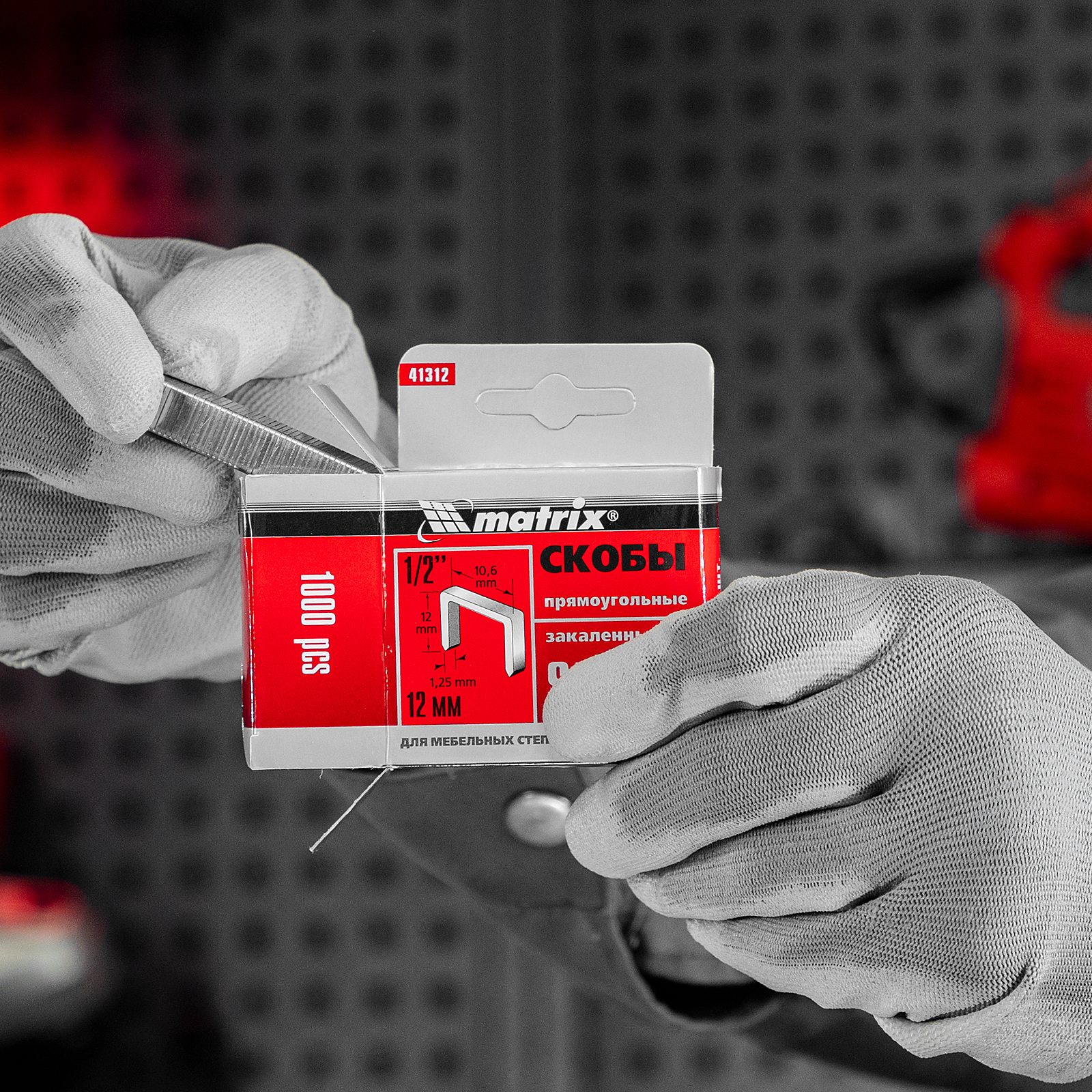 Закаленные скобы Matrix 41312 для мебельного степлера, тип 140, размером 12 х 10,6 х 1,25 мм, 1000 шт. в коробке, помогут обить мебель, зафиксировать утеплитель, а также выполнить другие отделочные и ремонтные работы. Скобы крепко соединяют различные материалы: древесину, фанеру, картон, ДСП.