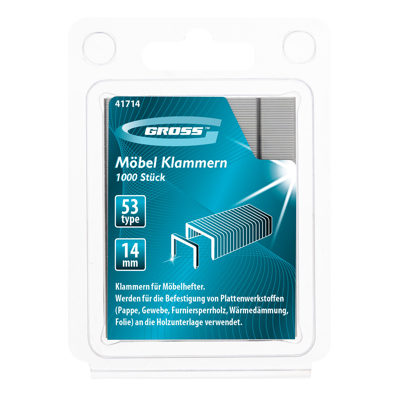 Усиленные скобы Gross 41714 размером 14 х 11,4 х 0,75 мм, тип 53, 1000 шт. в упаковке, предназначены для скрепления листовых материалов с помощью мебельного степлера. Позволяют зафиксировать картон, фанеру, ткань в ходе проведения облицовочных или ремонтных работ.