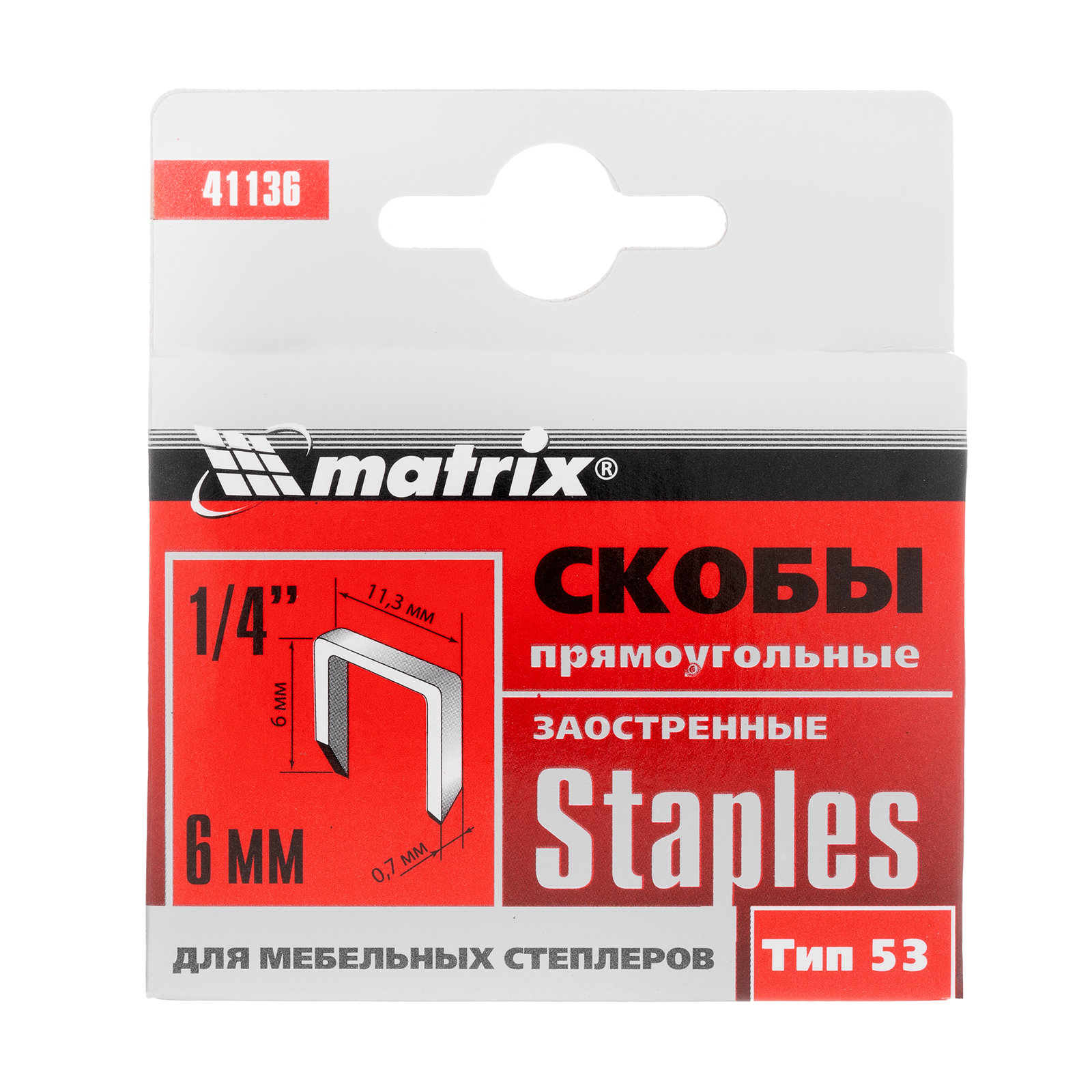 Заостренные скобы Matrix 41136 для мебельного степлера, тип 53, размером 6 х 11,3 х 1 мм, 1000 шт. в коробке, помогут обить мебель, зафиксировать утеплитель, а также выполнить другие отделочные и ремонтные работы. Скобы крепко соединяют различные материалы: древесину, фанеру, картон, ДСП.