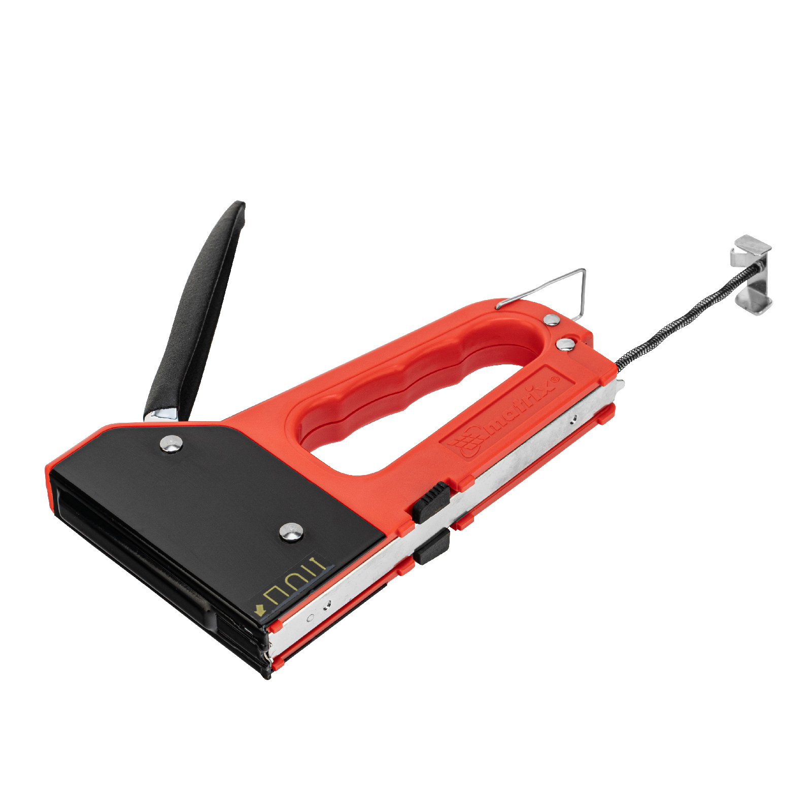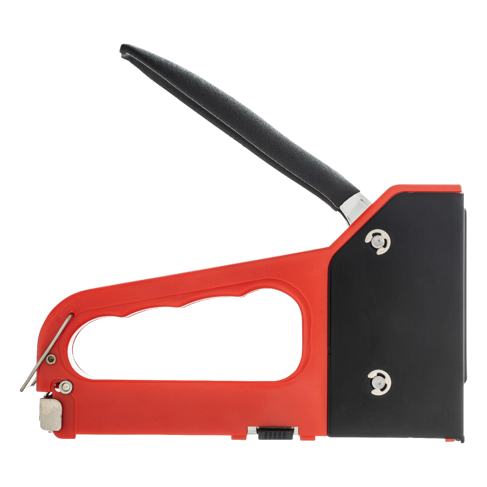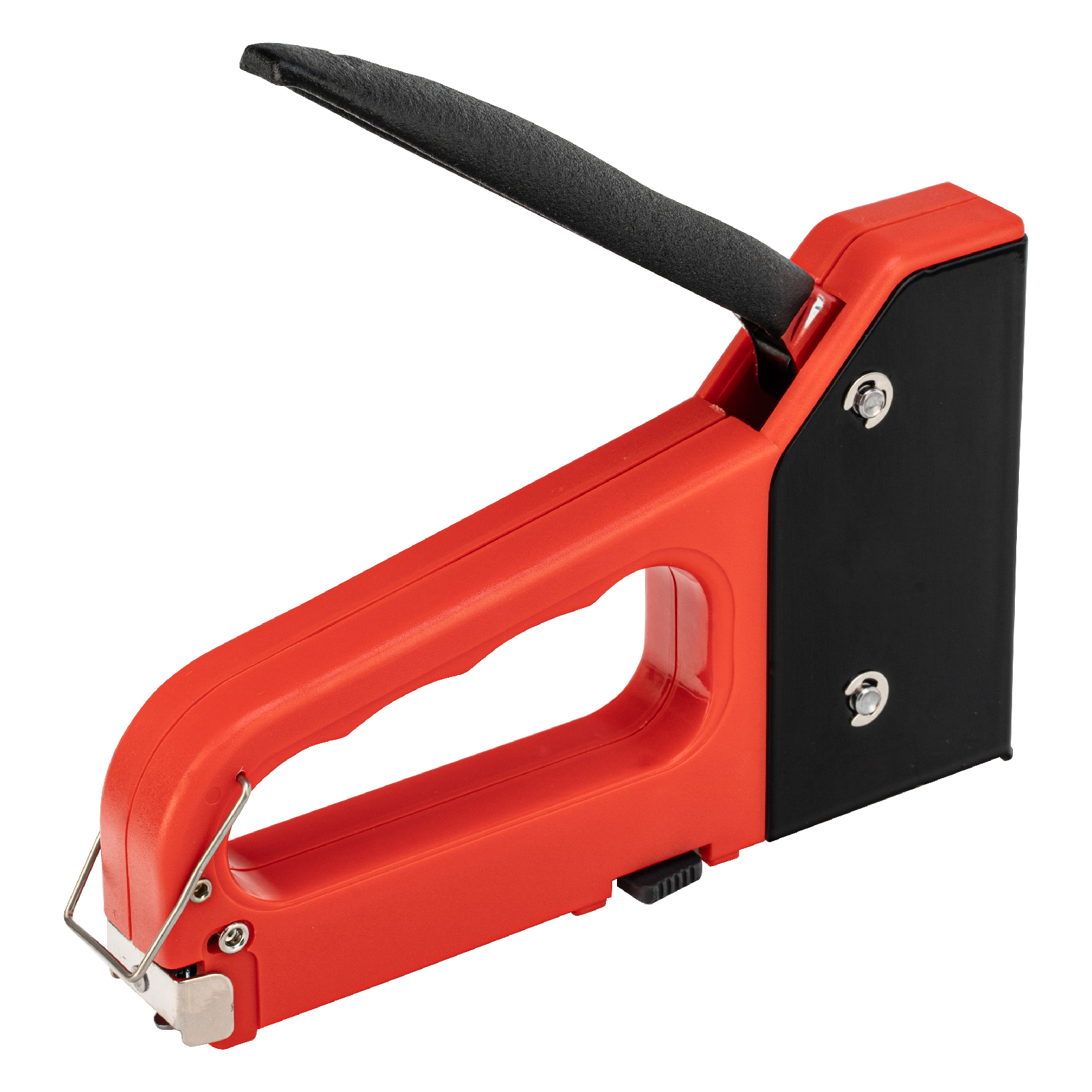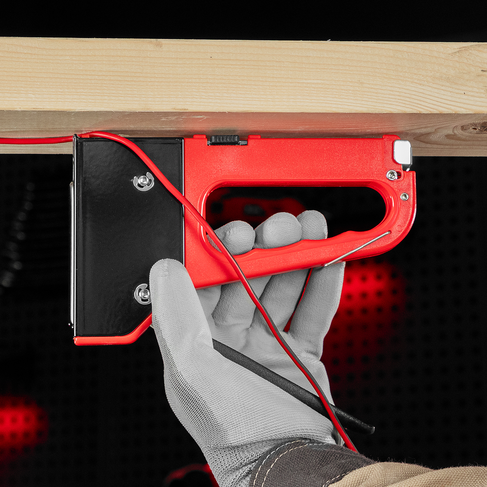 - Безопасное хранение и транспортировка — металлическая скоба фиксирует рукоятку, предотвращая случайное срабатывание степлера.