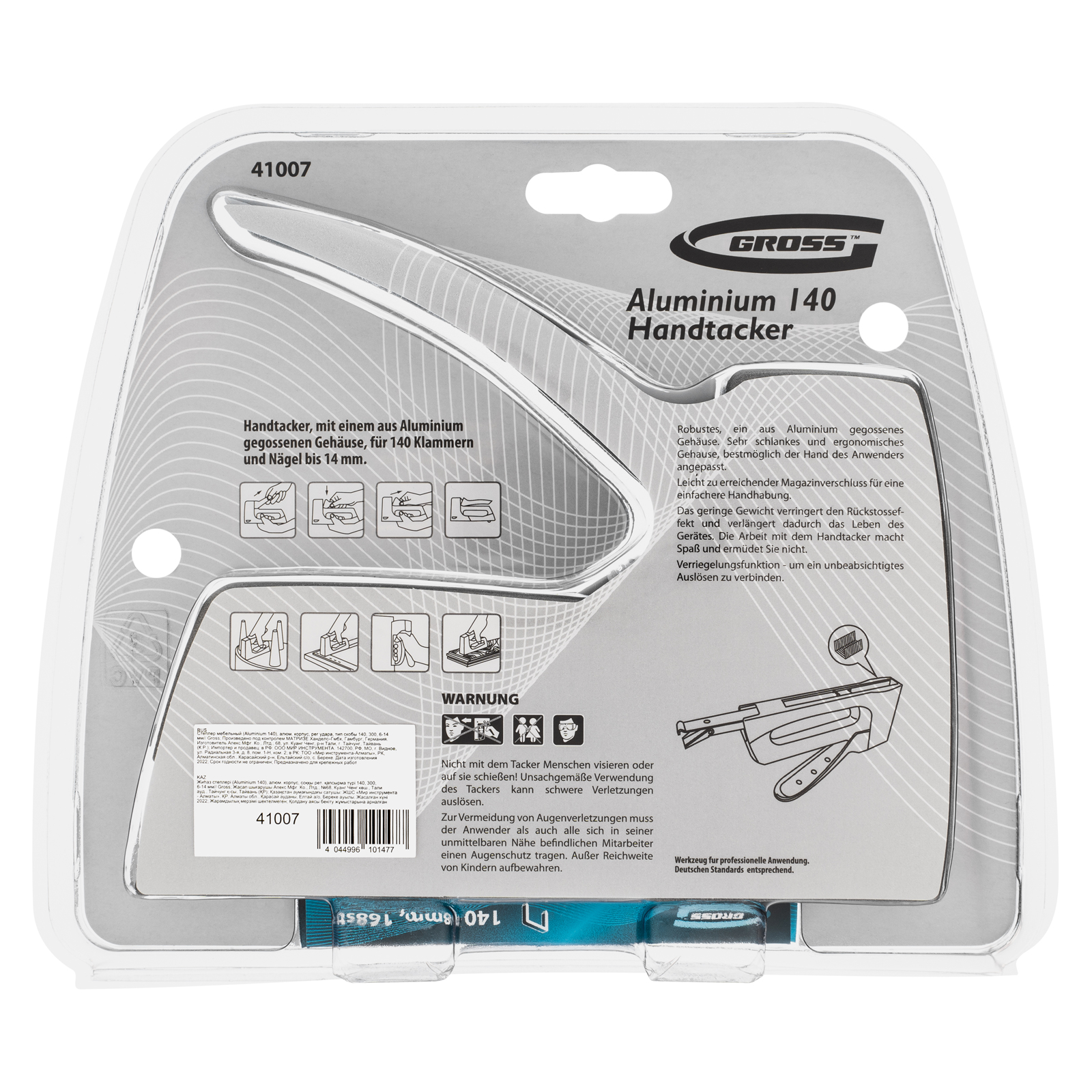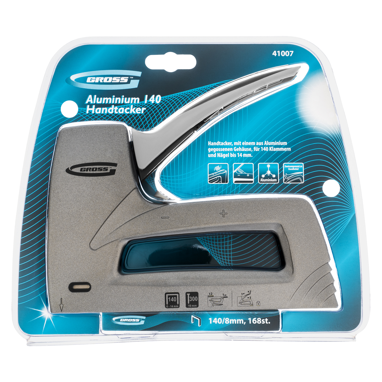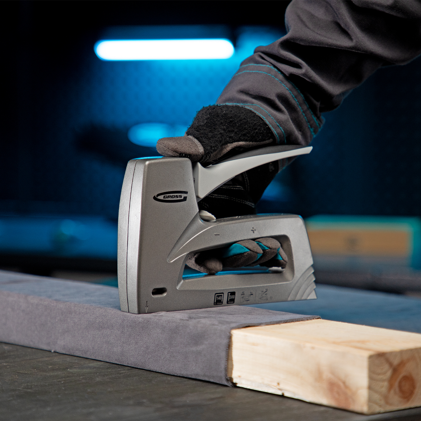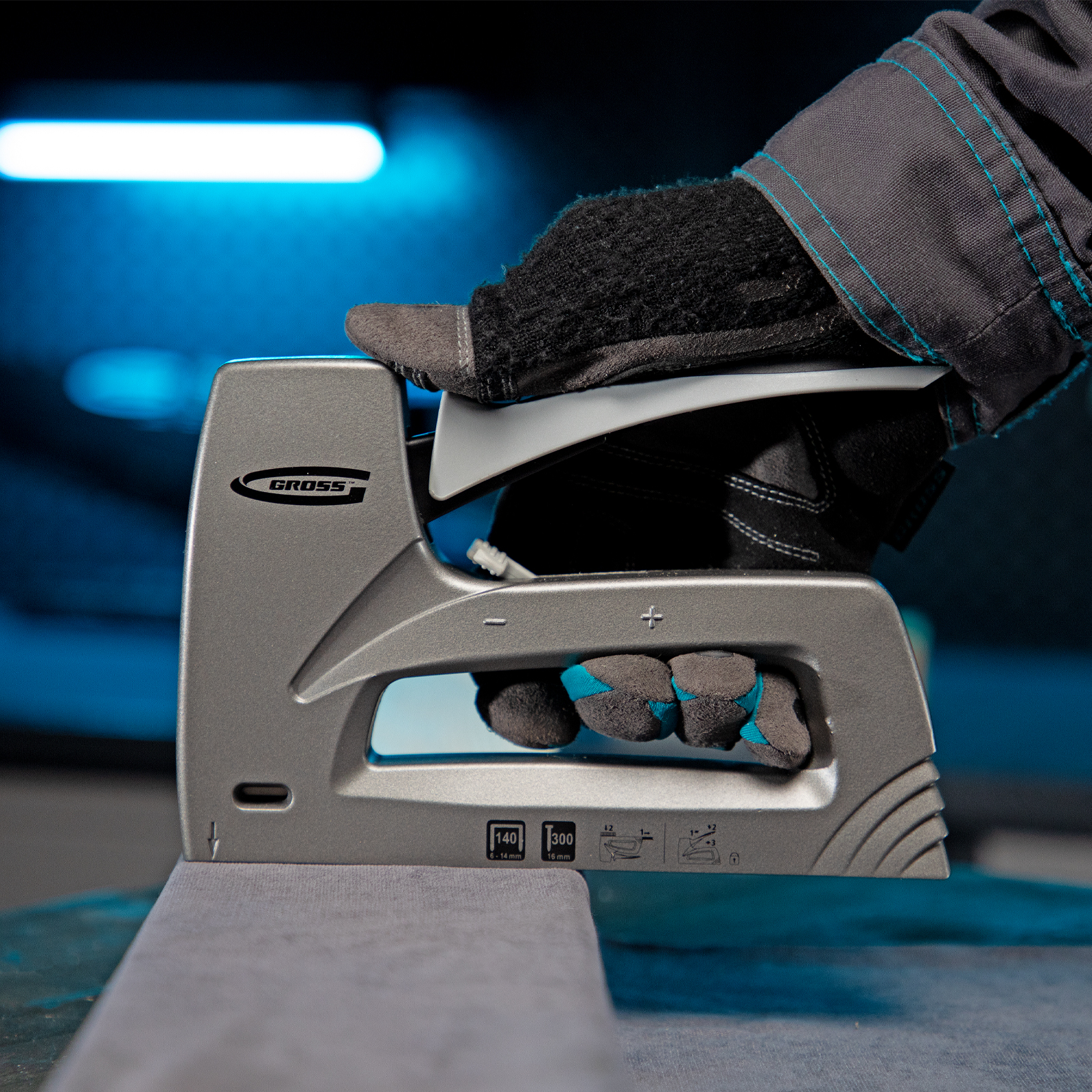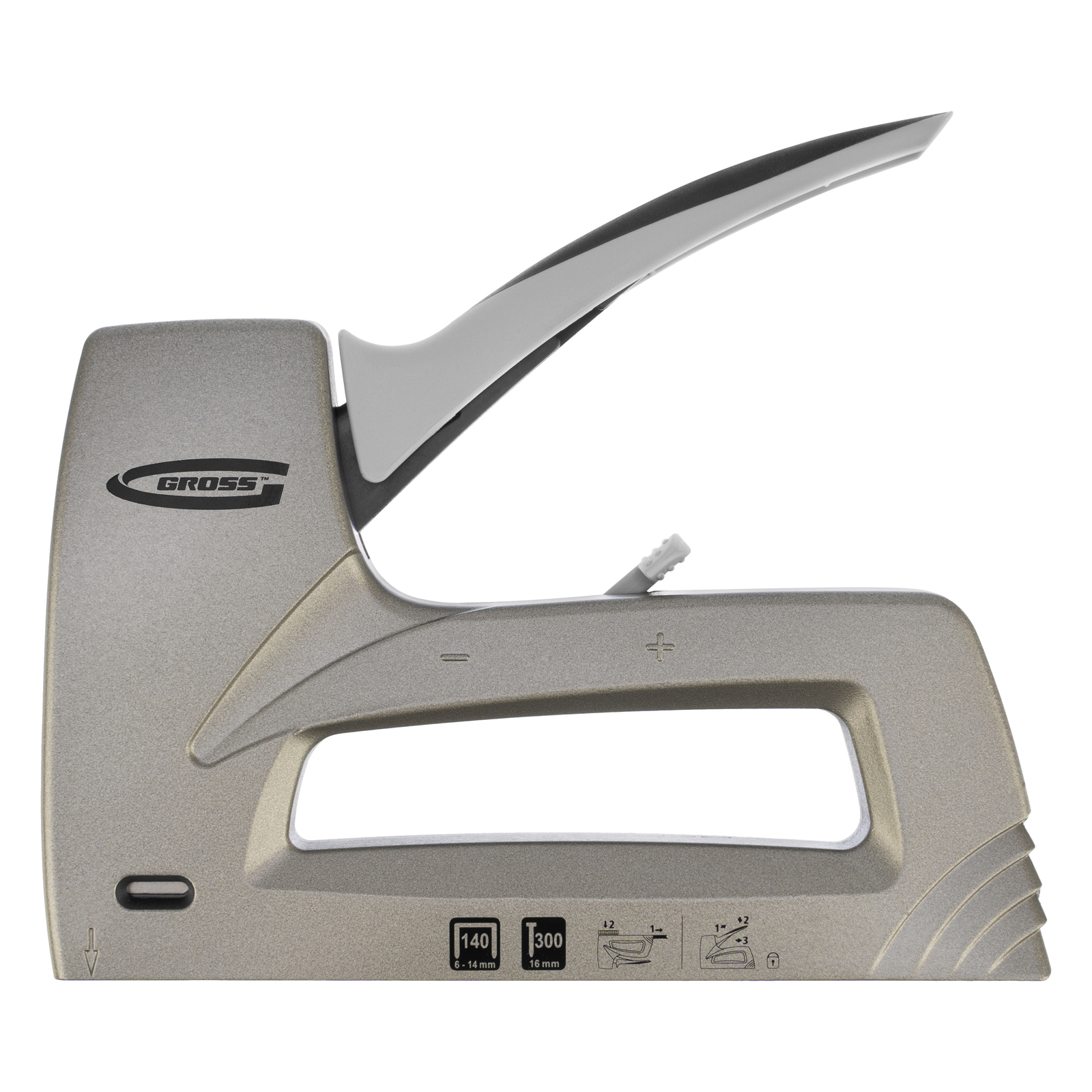 Мебельный степлер Gross Aluminium 140 41007 в литом алюминиевом корпусе работает со скобами типа 140 размером 6-14 мм и гвоздями типа 300 размером 16 мм, оснащен двухпозиционным регулятором силы удара и эффективен при работе с тканями, ПВХ-пленкой, а также фанерой, оргалитом, ДВП и ДСП. Инструмент используется для сборки и обивки мебели, укладки ковровых покрытий и проведения багетных работ. Степлер подходит для использования дома и на производстве, поставляется со скобами в количестве 168 штук.