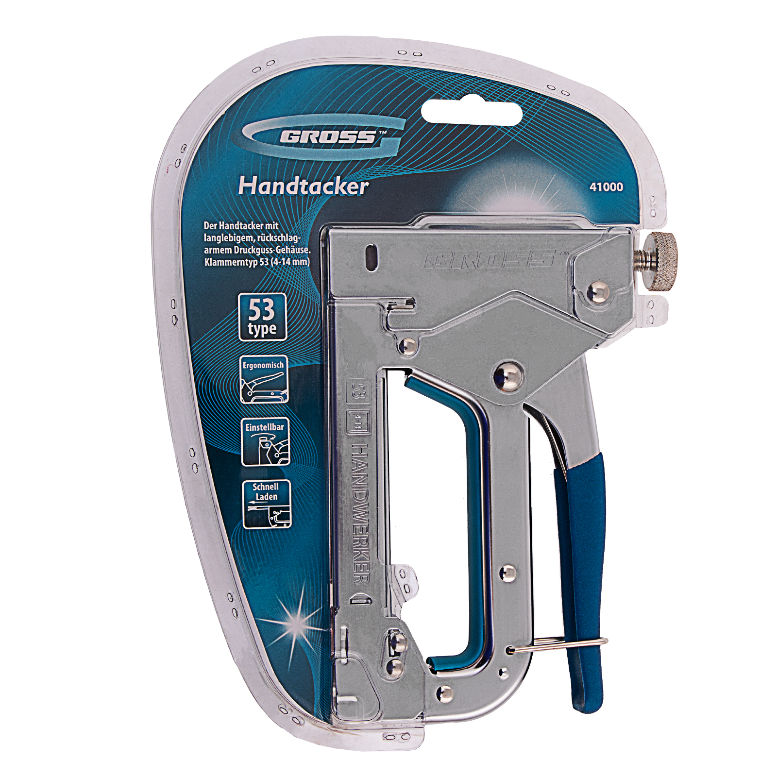 Регулируемый мебельный степлер Gross Handwerker 41000 со стальным корпусом совместим со скобами типа 53 размером 4-14 мм и используется для крепежных работ с листовыми материалами из фанеры, картона, ДВП, ДСП, оргалита, а также с пленкой и теплоизоляционными материалами. Винтовой регулятор позволяет плавно изменять силу удара, что удобно для работы с длинными скобами и твердыми материалами. Инструмент будет полезен при сборке и обивке мебели, укладке ковровых покрытий, проведении ремонтных и отделочных работ.