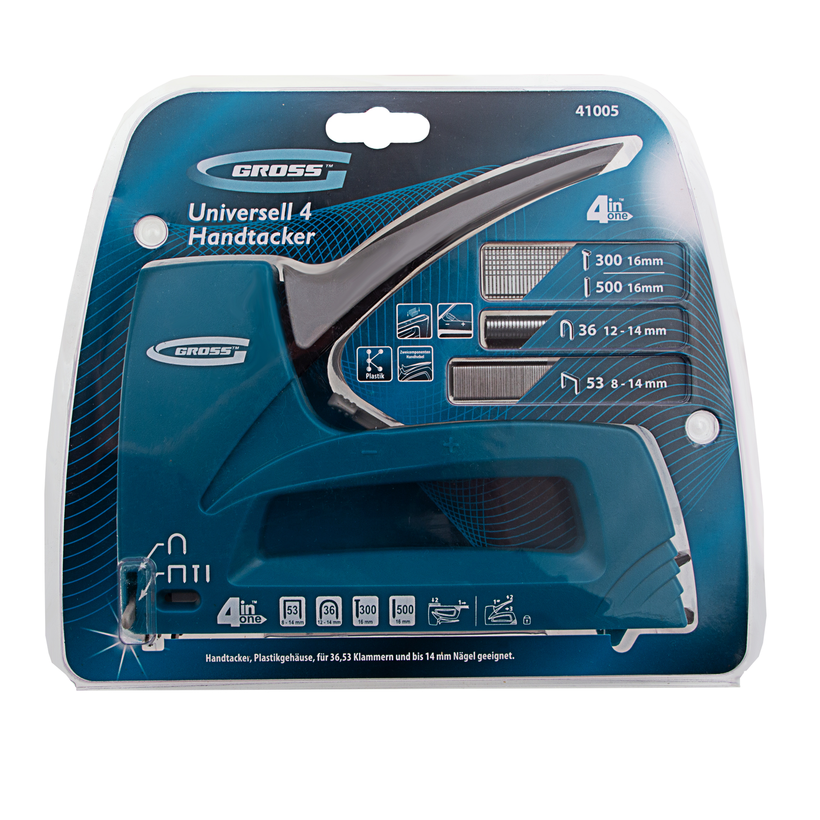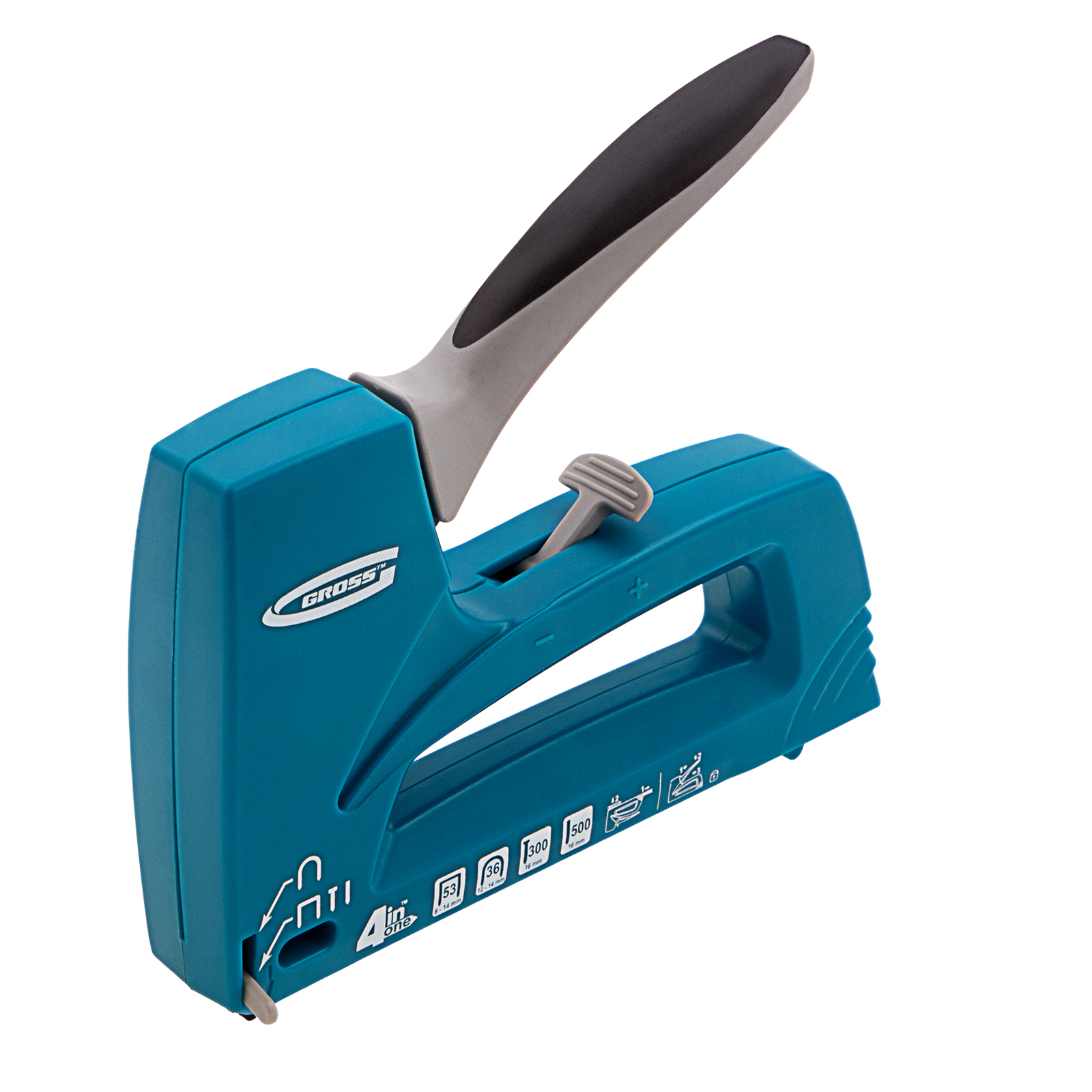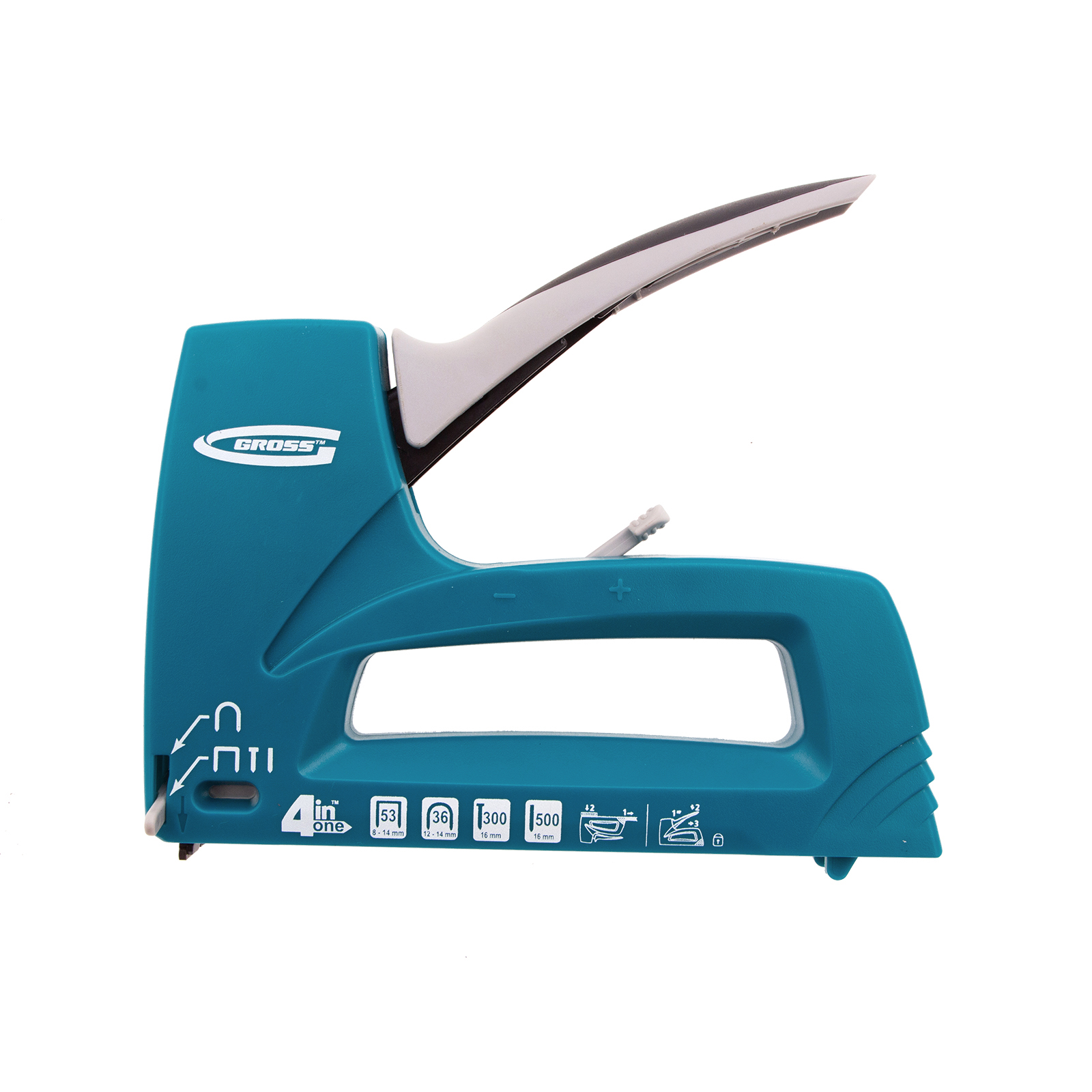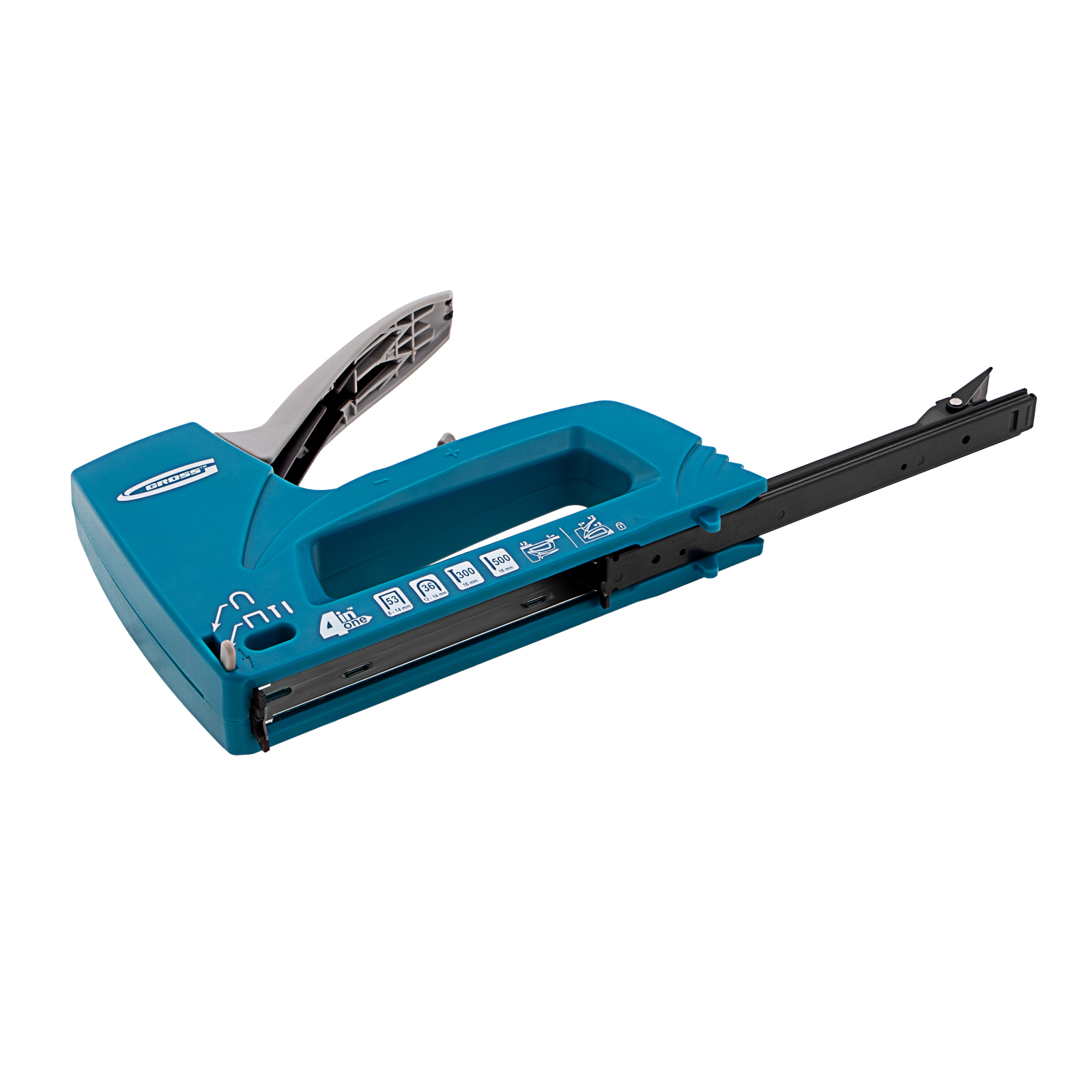 4-функциональный пластиковый мебельный степлер Gross Universell 4 41005 — универсальный инструмент, совместимый со скобами типа 53 размером 8-14 м, 36 размером 12-14 мм, гвоздями типа 300 и штифтами типа 500 размером 16 мм. Предназначен для скрепления с деревянным основанием фанеры, картона, ДСП, ДВП, оргалита, пленки, утеплителя и других листовых материалов. Его используют для обивки мягкой мебели, сборки шкафов, монтажа низковольтных проводов, выполнения багетных и других крепежных работ. Степлер рекомендован для профессионального применения, но будет полезен и в быту. Поставляется со скобами типа 36 в количестве 100 штук, скобами типа 53 (200 штук) и с гвоздями типа 300 и 500 (100 штук).