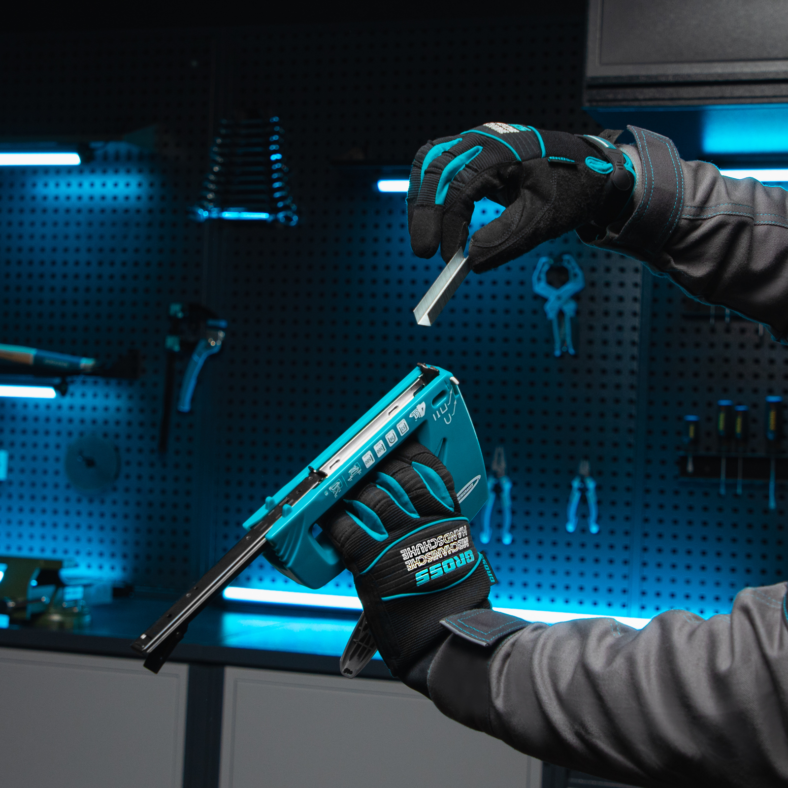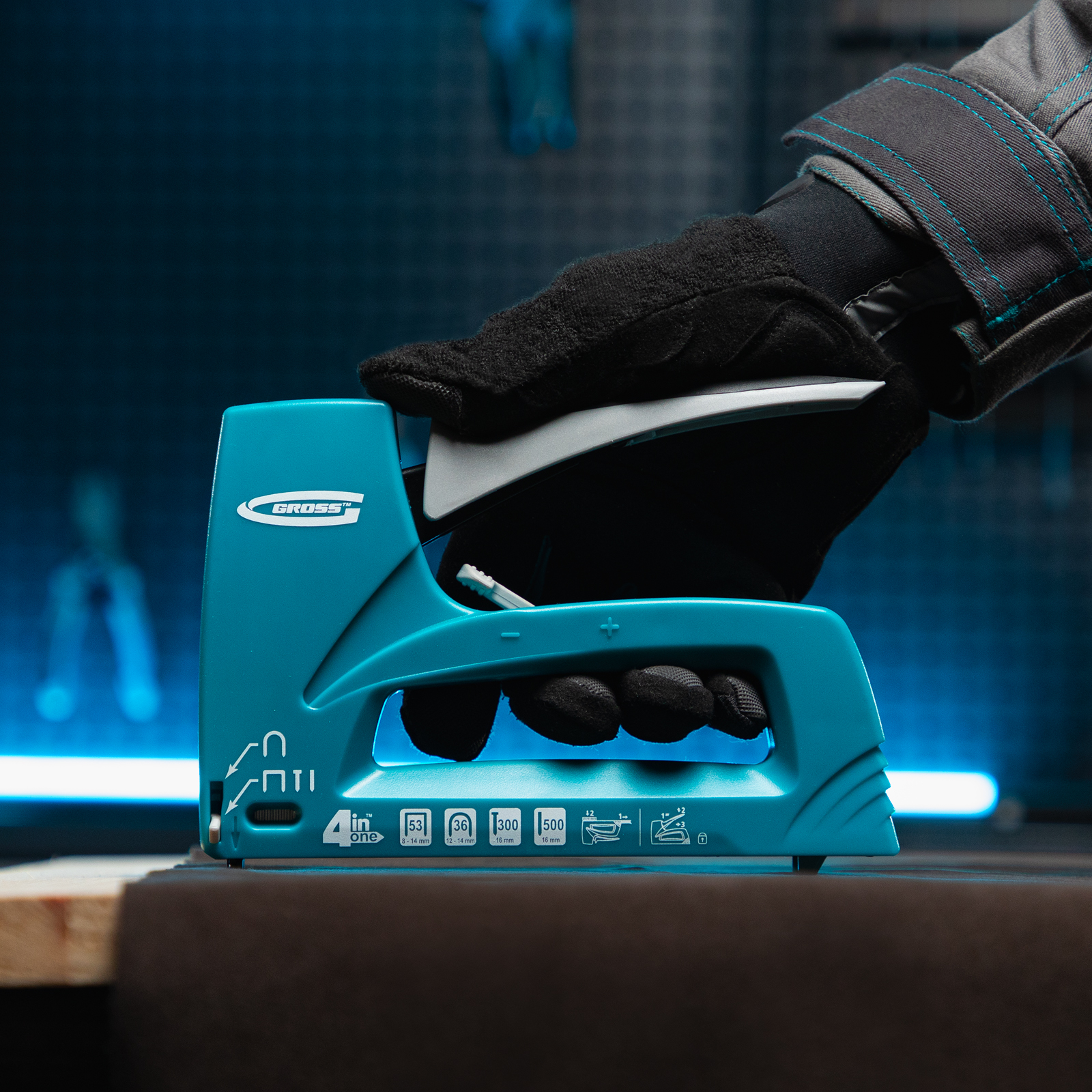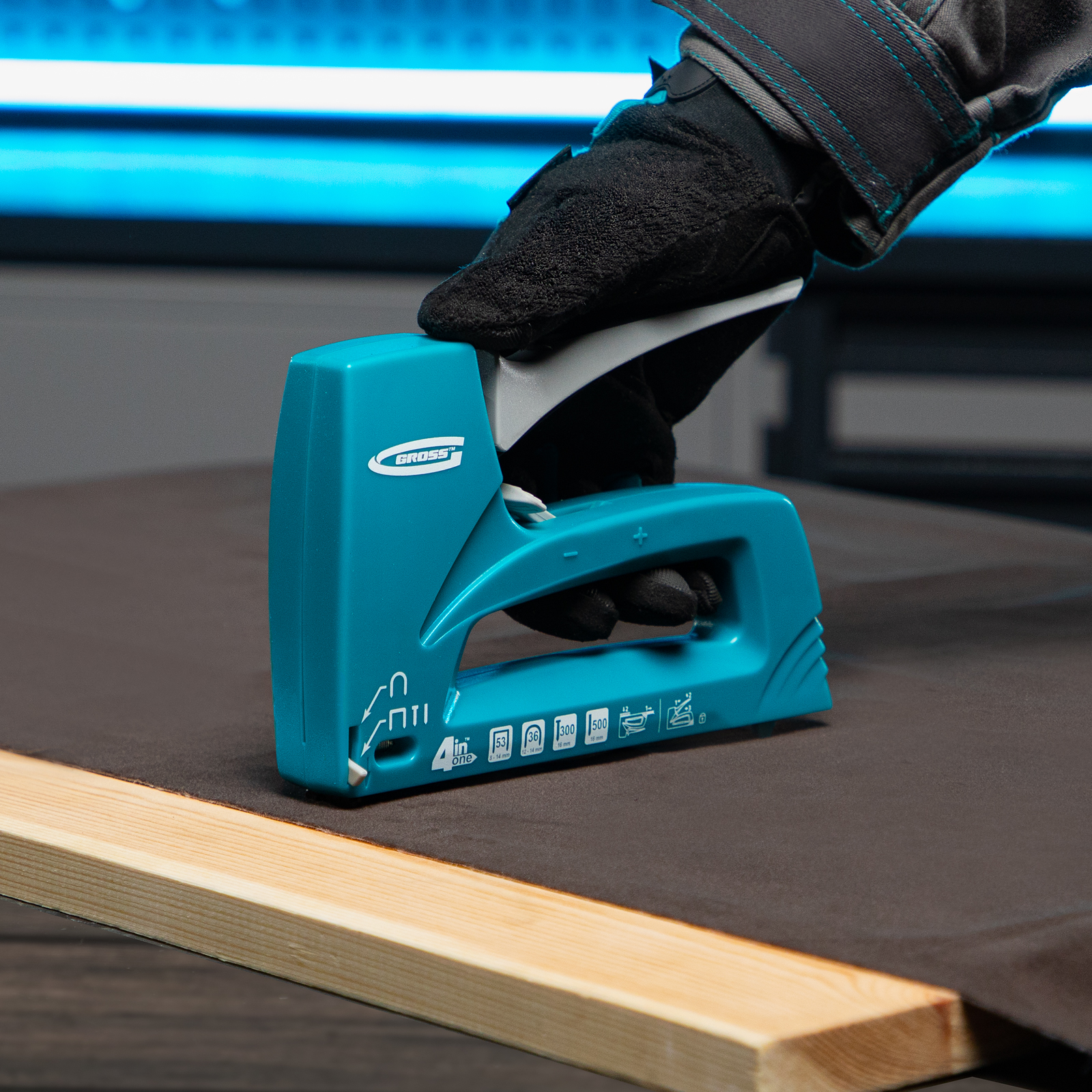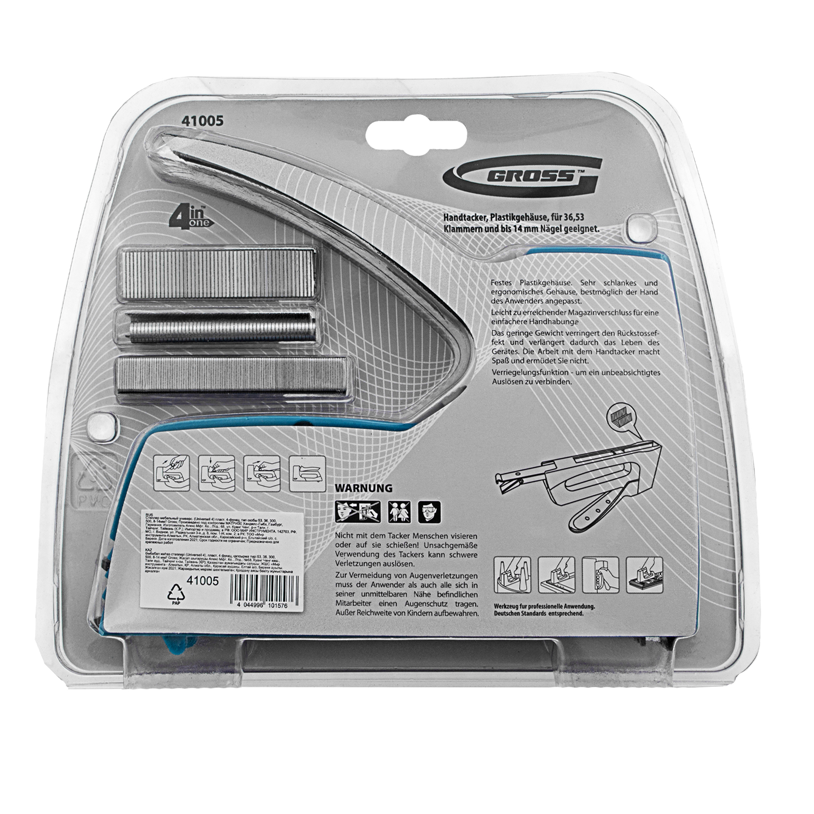 4-функциональный пластиковый мебельный степлер Gross Universell 4 41005 — универсальный инструмент, совместимый со скобами типа 53 размером 8-14 м, 36 размером 12-14 мм, гвоздями типа 300 и штифтами типа 500 размером 16 мм. Предназначен для скрепления с деревянным основанием фанеры, картона, ДСП, ДВП, оргалита, пленки, утеплителя и других листовых материалов. Его используют для обивки мягкой мебели, сборки шкафов, монтажа низковольтных проводов, выполнения багетных и других крепежных работ. Степлер рекомендован для профессионального применения, но будет полезен и в быту. Поставляется со скобами типа 36 в количестве 100 штук, скобами типа 53 (200 штук) и с гвоздями типа 300 и 500 (100 штук).