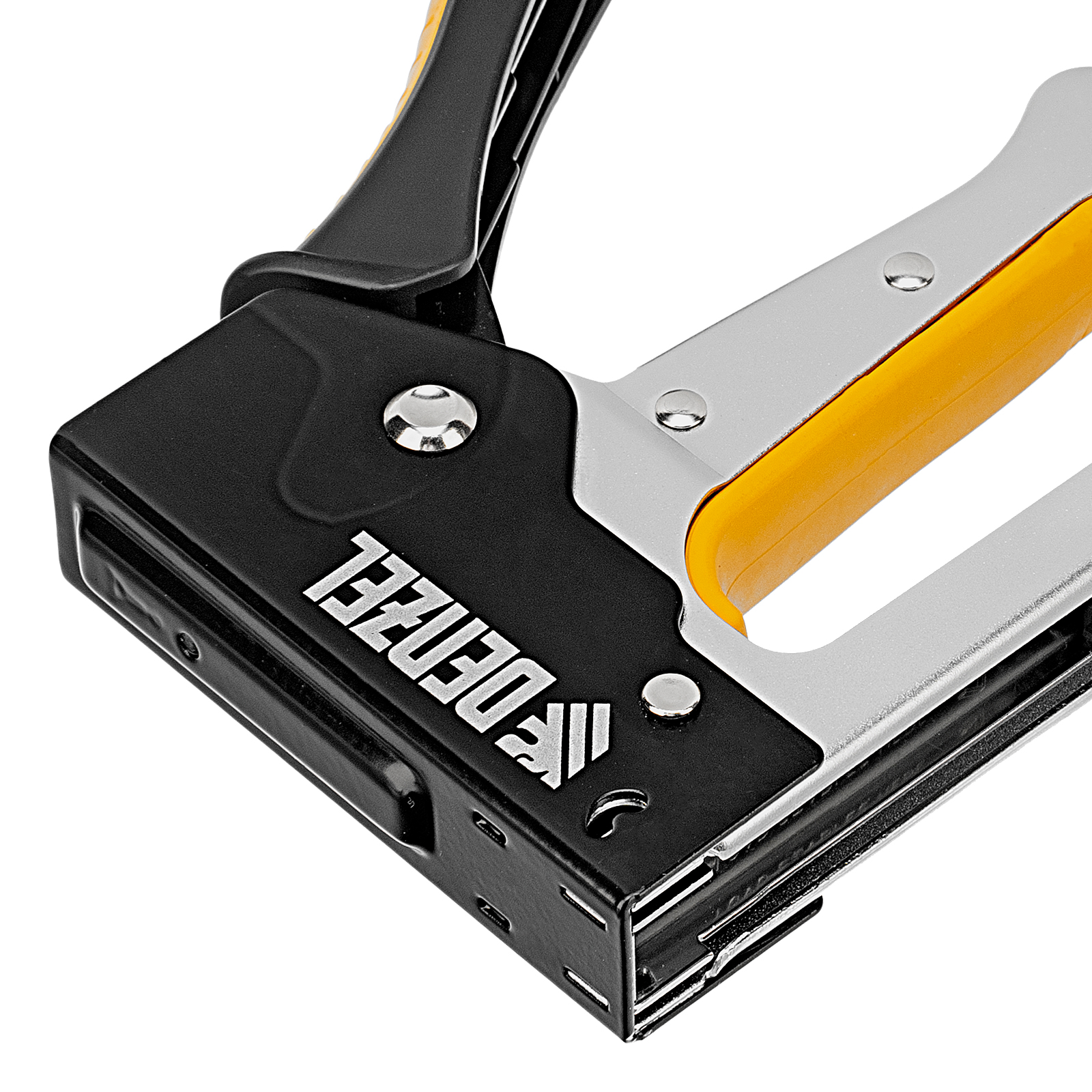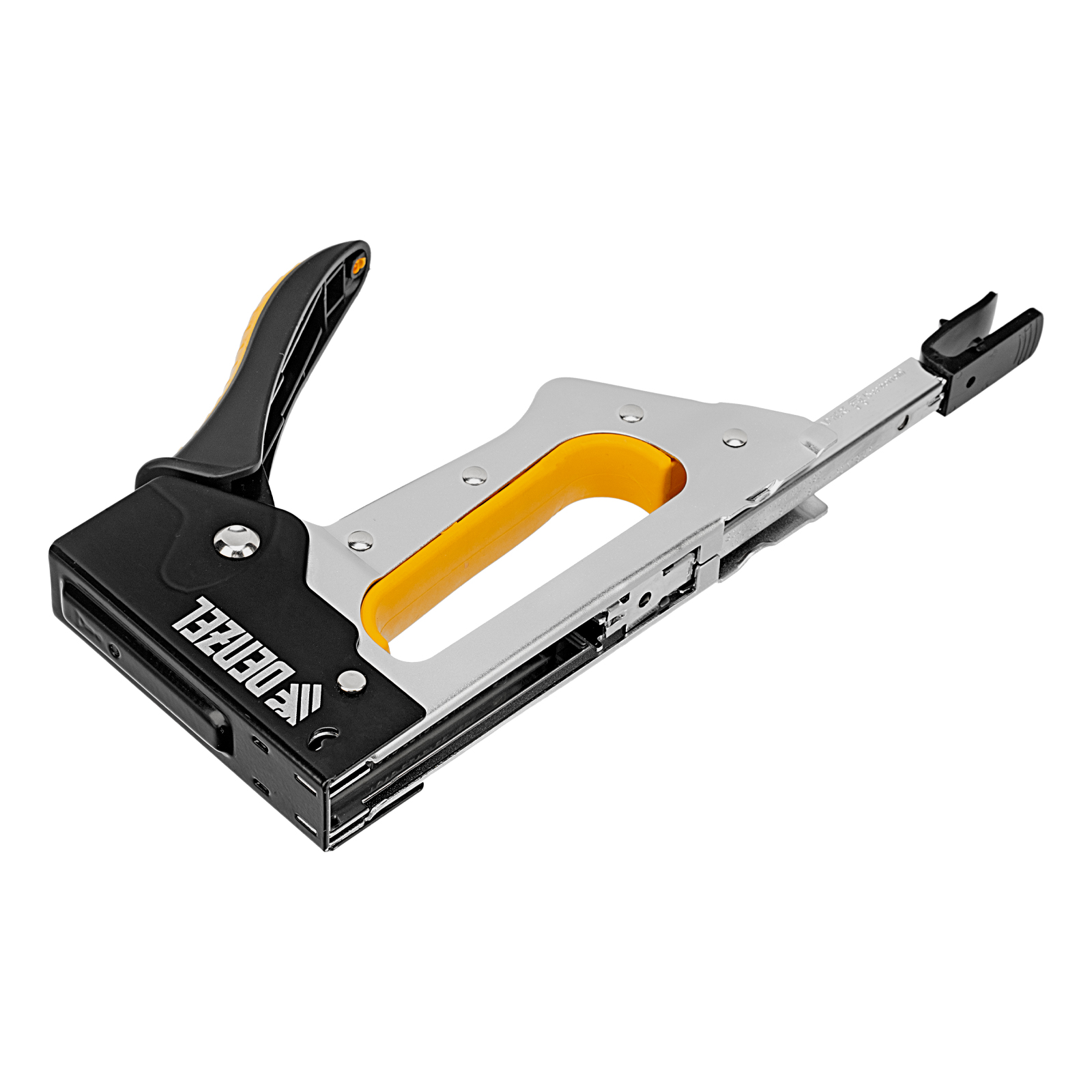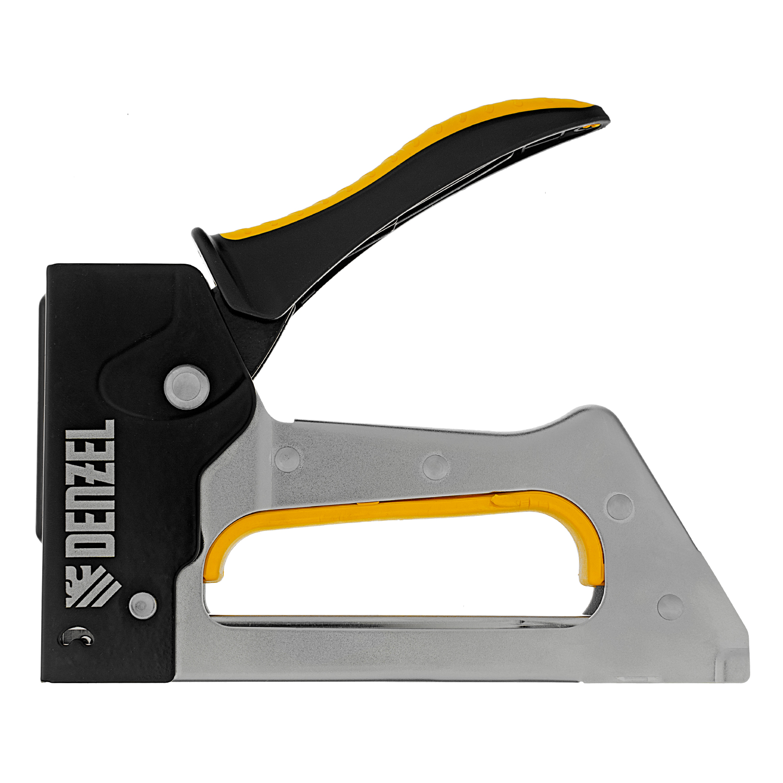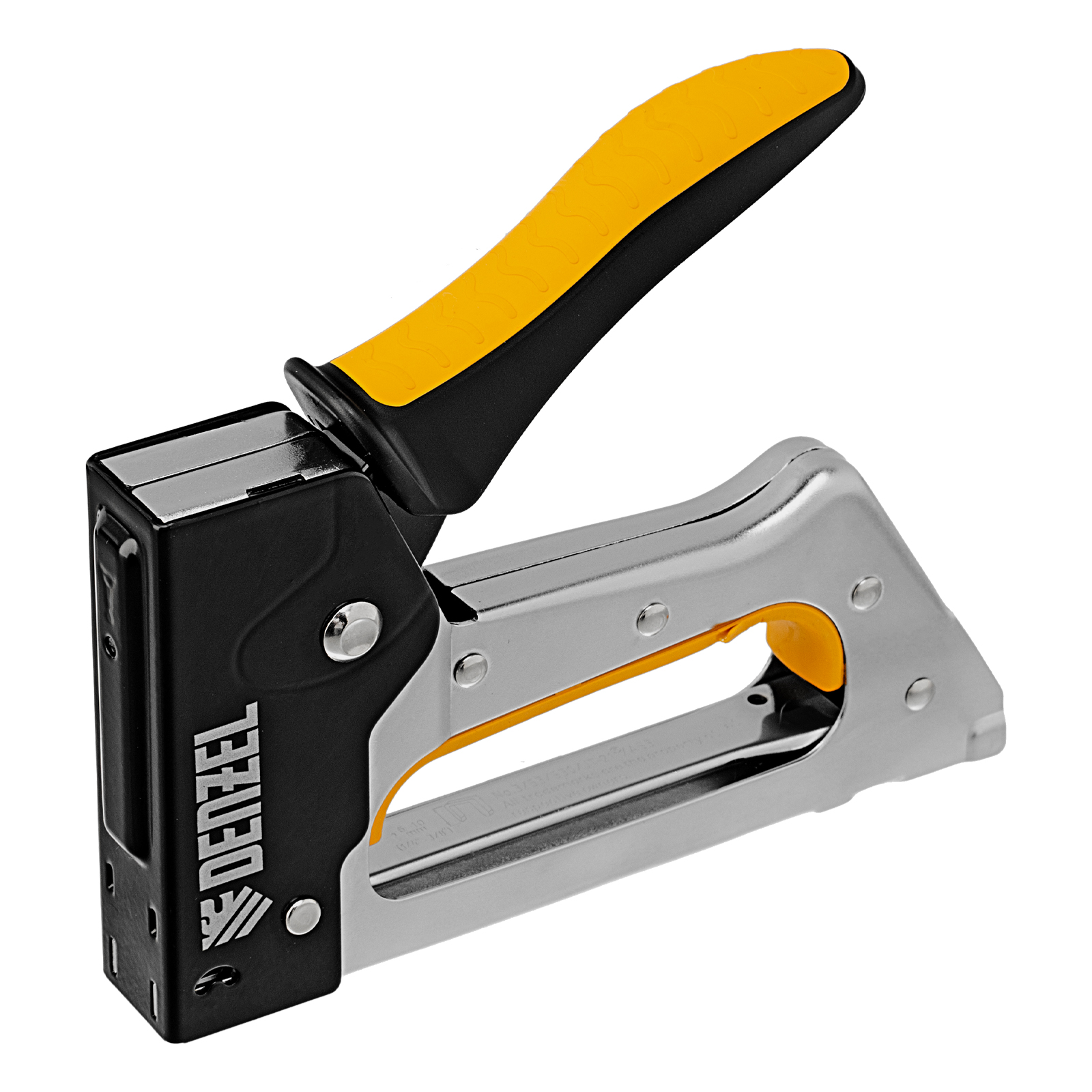 Металлический степлер Denzel 40222 с двухкомпонентной рукояткой используется для сборки и обивки мебели, фиксации изоляционных материалов, а также других монтажных и отделочных работ с помощью скоб типа 53 размером 6-10 мм. Позволяет быстро соединять с деревянным основанием листовые материалы из ДВП, ДСП, картона, оргалита, фанеры, пленки ПВХ. Благодаря рессорному ударному механизму инструмент не требует от пользователя значительных усилий, поэтому подходит для длительной работы.