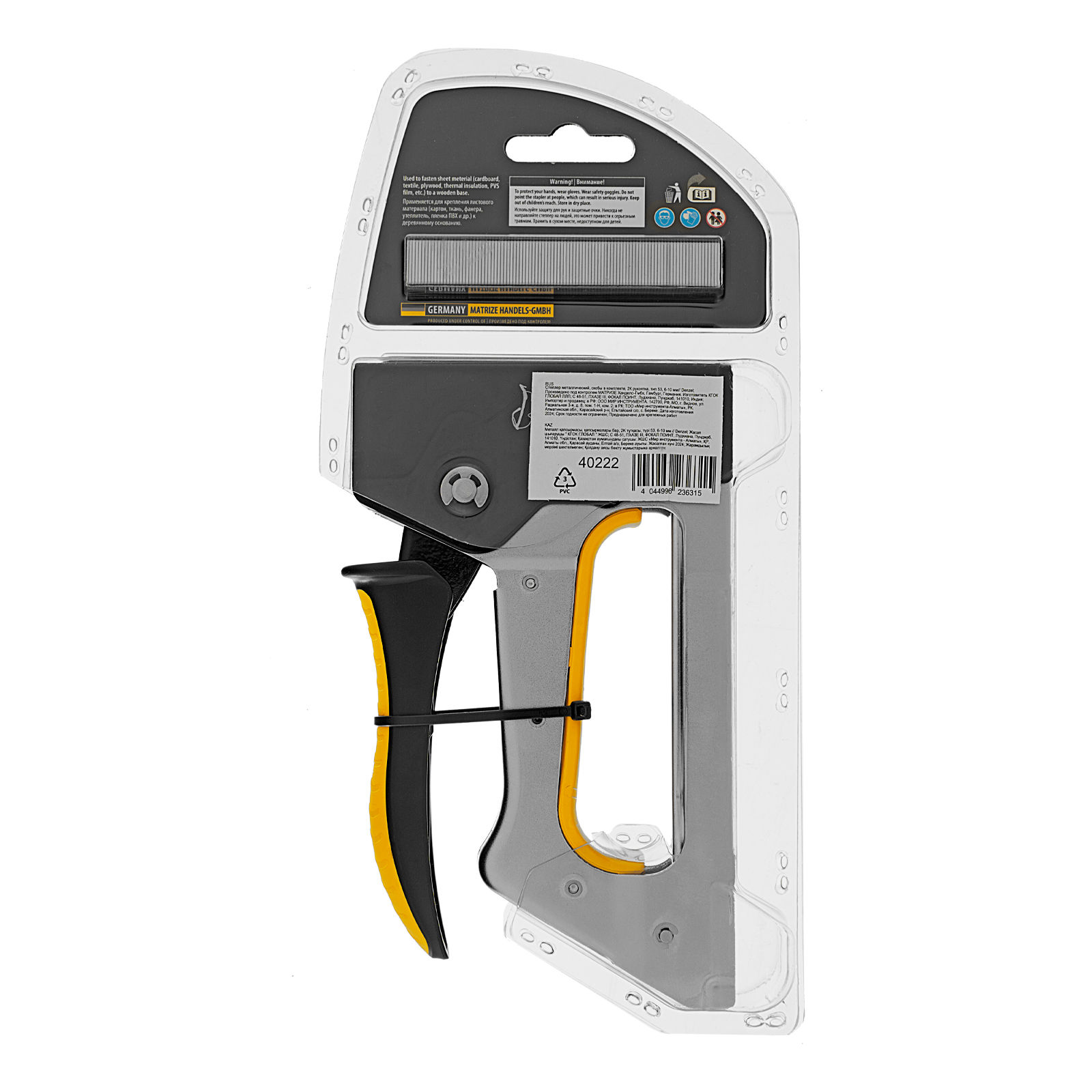 - Расходники в комплекте (200 шт.) — крепеж не нужно приобретать отдельно, степлер полностью готов к работе.