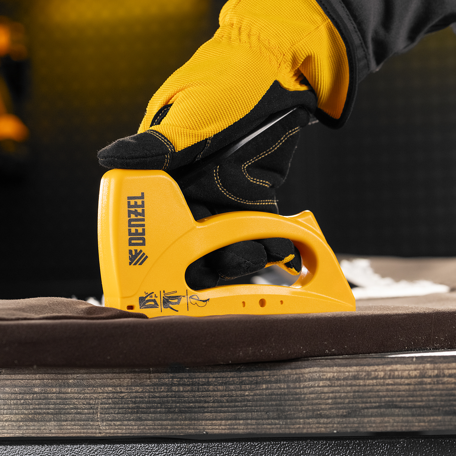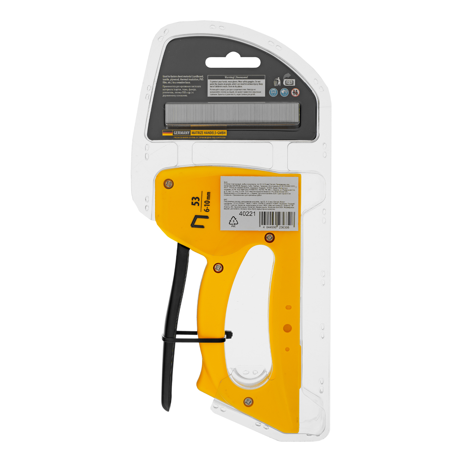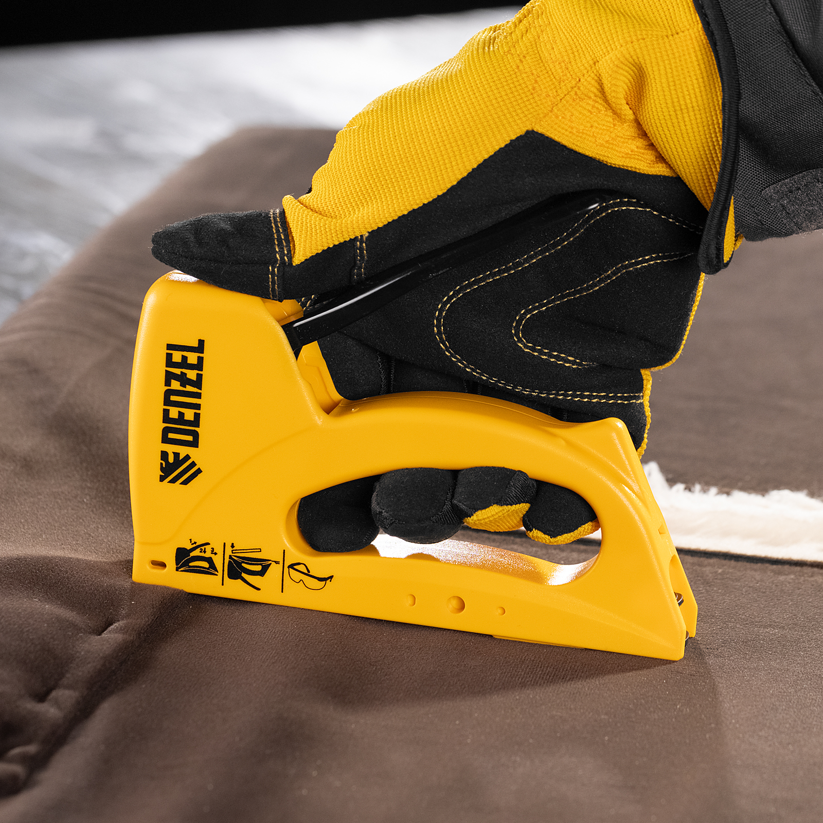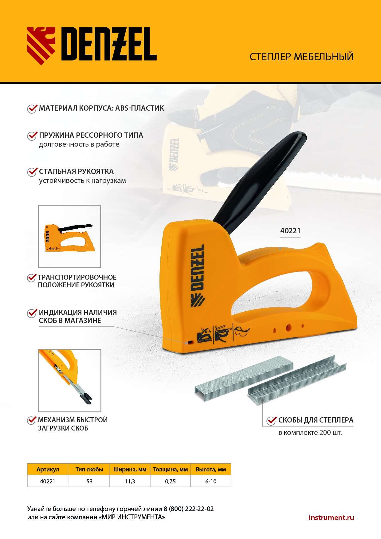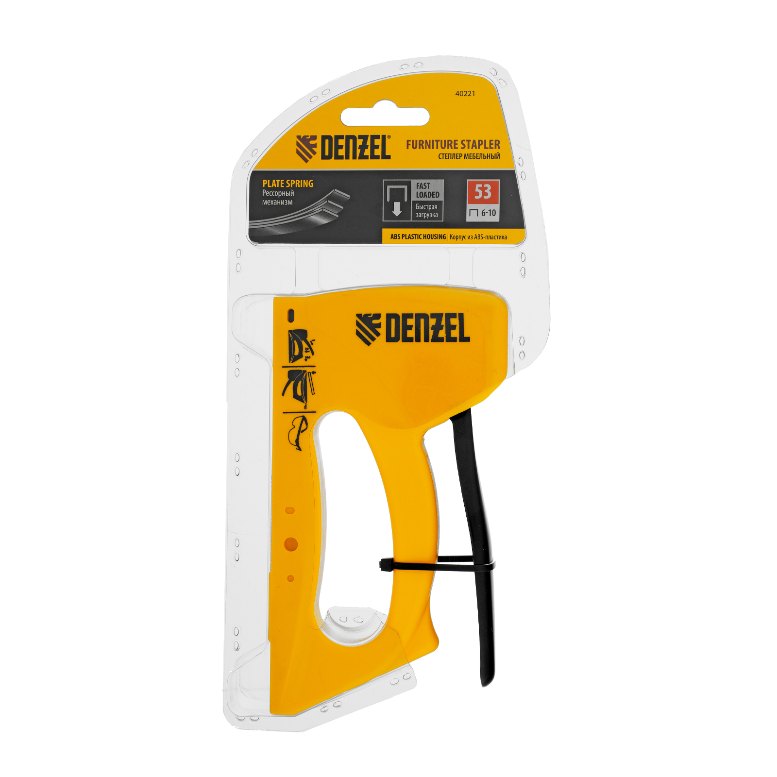 Пластиковый степлер Denzel 40221 работает со скобами типа 53 размером 6-10 мм и предназначен для быстрого крепления листовых материалов к основаниям из древесины, ДВП или ДСП. Используется для сборки и обивки мебели, фиксации изоляционных материалов. Ударный механизм рессорного типа не требует повышенных усилий от пользователя, поэтому продолжительная работа с инструментом не вызывает дискомфорт.