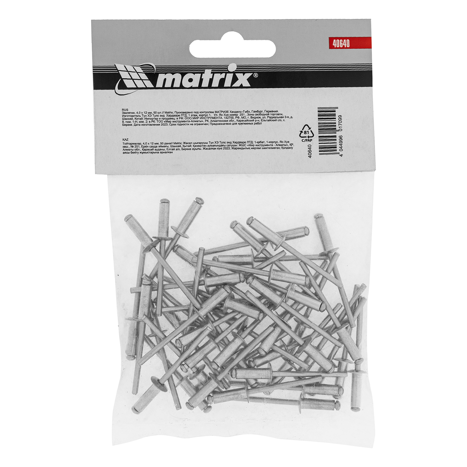 Заклепки Matrix 40640 размером 4,0 х 12 мм, 50 шт. в упаковке, предназначены для соединения листовых заготовок. Обеспечивают надежную фиксацию материалов даже при наличии доступа только с одной стороны. Используются в строительстве домов, для возведения заборов из профлиста, при производстве оборудования, будут полезны в домашней мастерской.