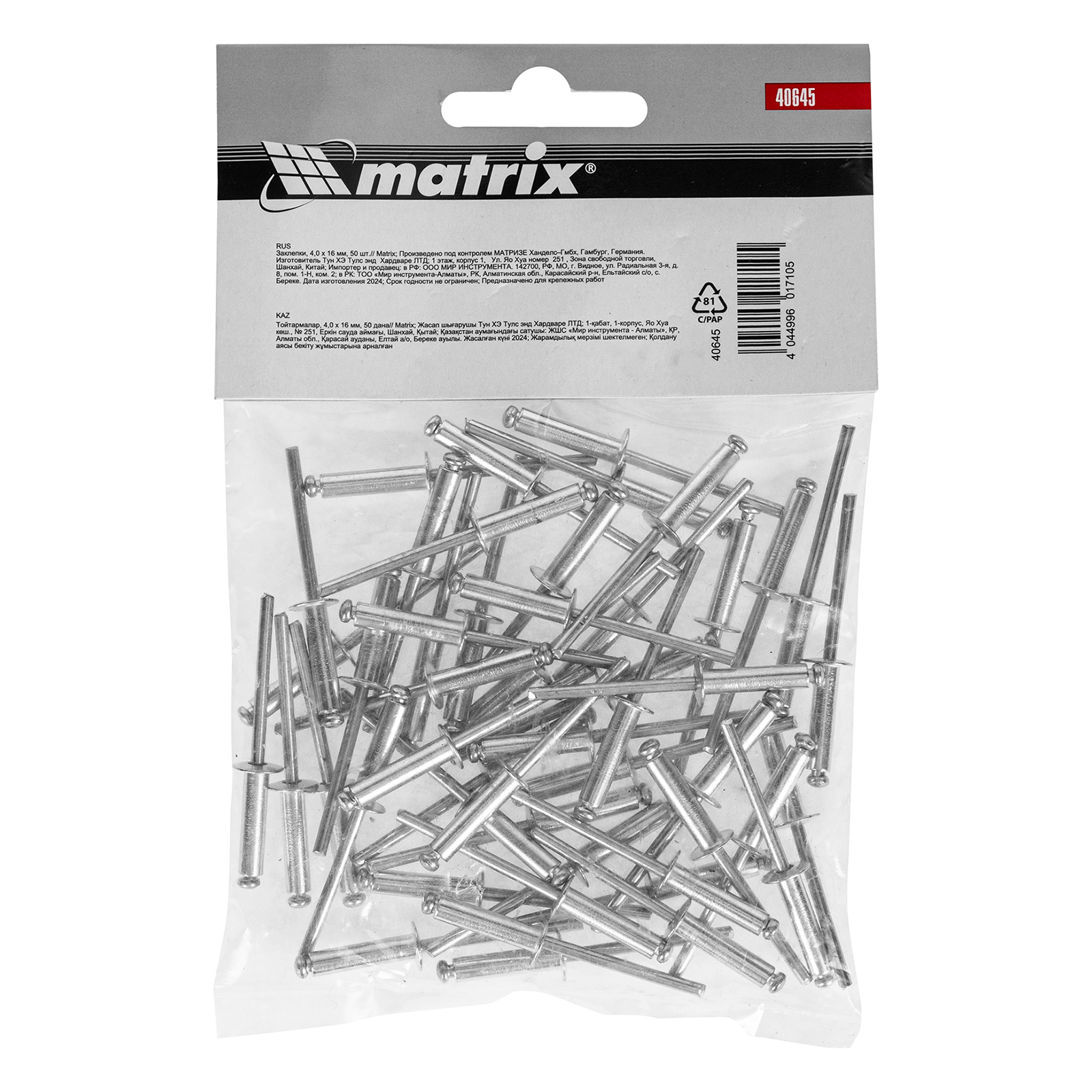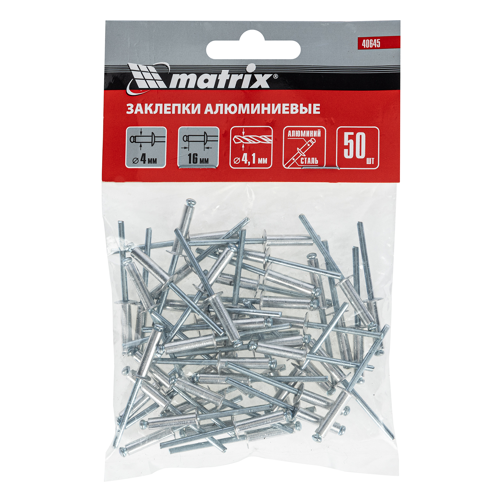 Заклепки Matrix 40645 размером 4,0 х 16 мм, 50 шт. в упаковке, предназначены для соединения листовых заготовок. Обеспечивают надежную фиксацию материалов даже при наличии доступа только с одной стороны. Используются в строительстве домов, для возведения заборов из профлиста, при производстве оборудования, будут полезны в домашней мастерской.