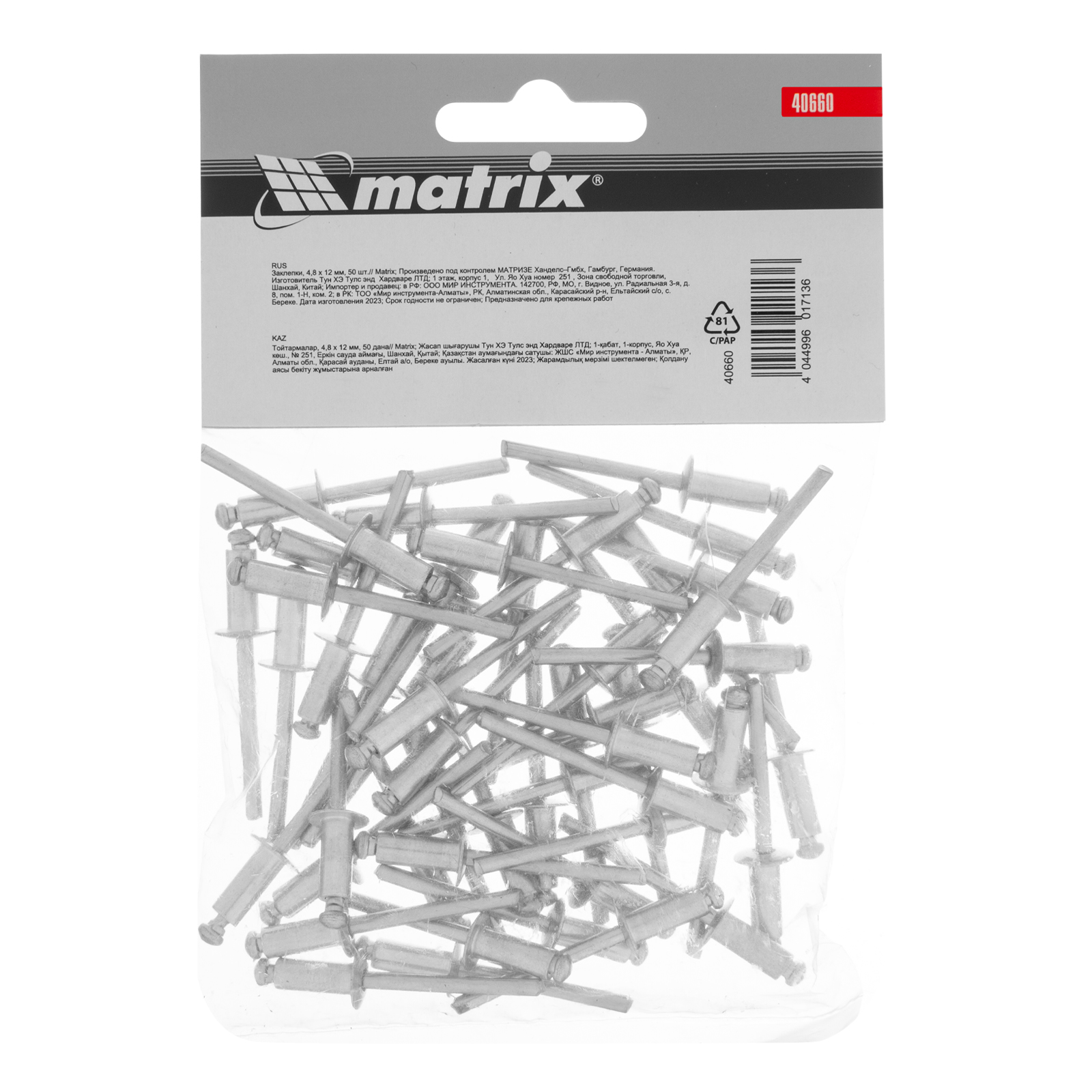Заклепки Matrix 40660 размером 4,8 х 12 мм, 50 шт. в упаковке, предназначены для соединения листовых заготовок. Обеспечивают надежную фиксацию материалов даже при наличии доступа только с одной стороны. Используются в строительстве домов, для возведения заборов из профлиста, при производстве оборудования, будут полезны в домашней мастерской.