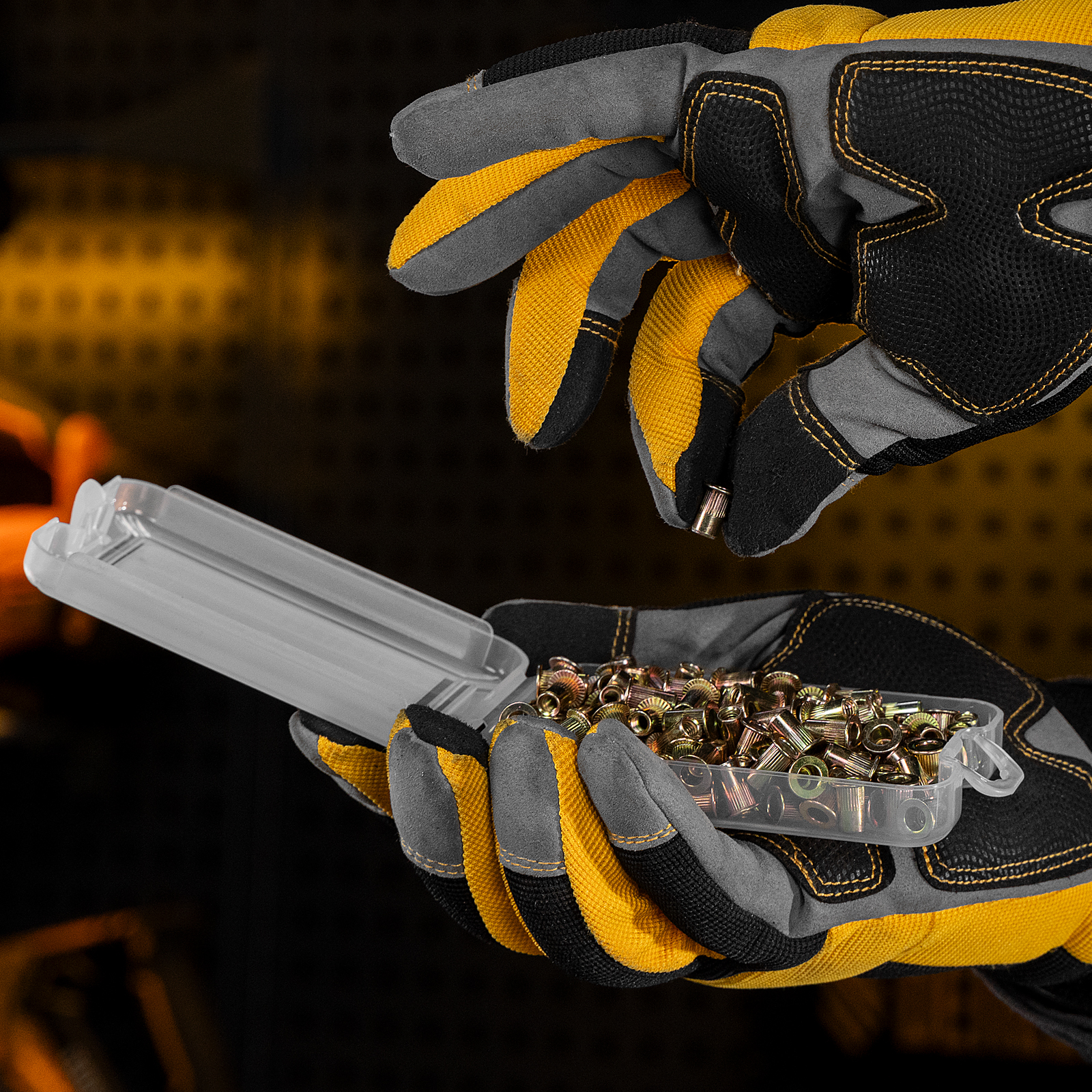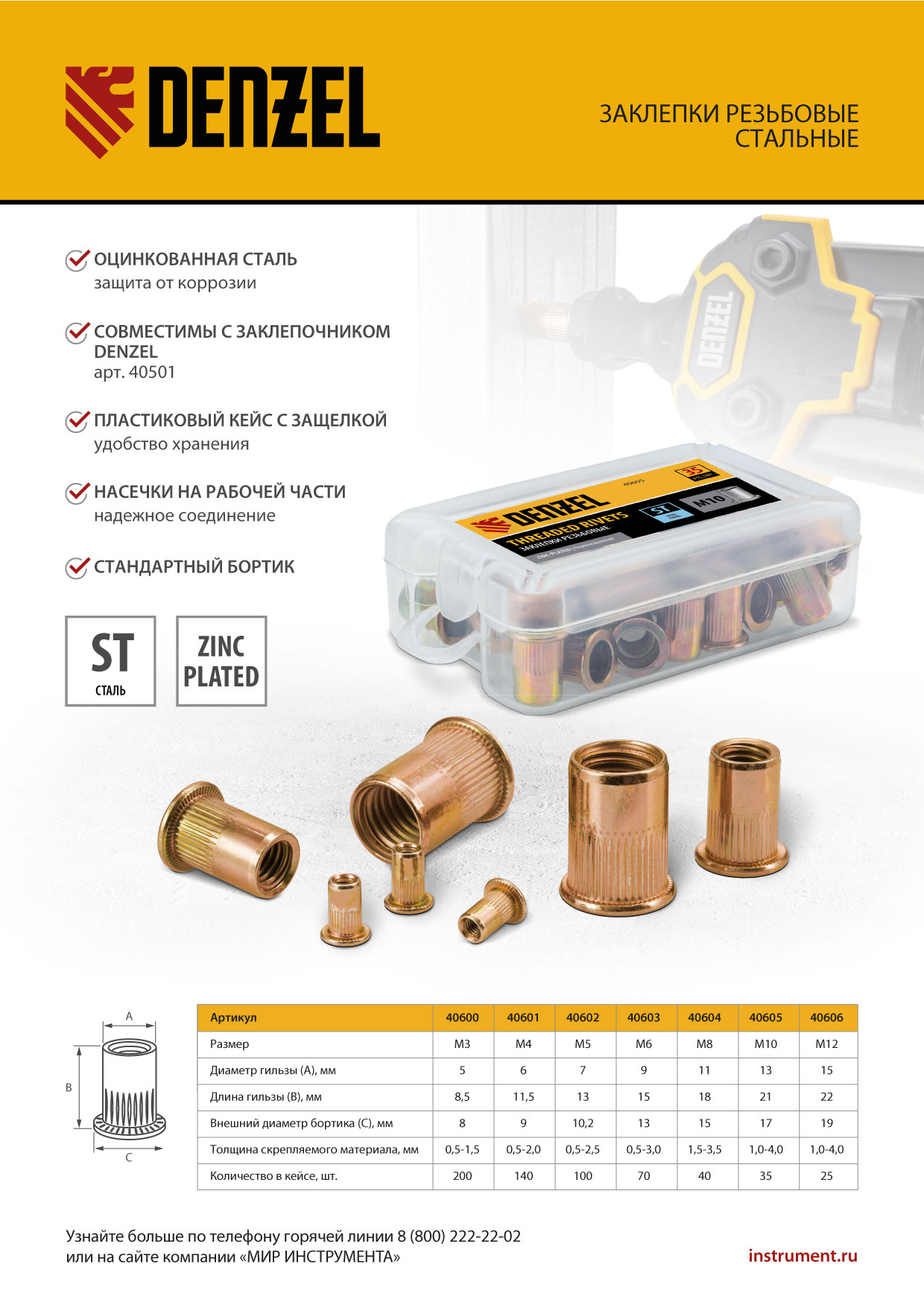 - Удобное хранение и транспортировка — заклепки поставляются в прочном пластиковом кейсе с защелкой.