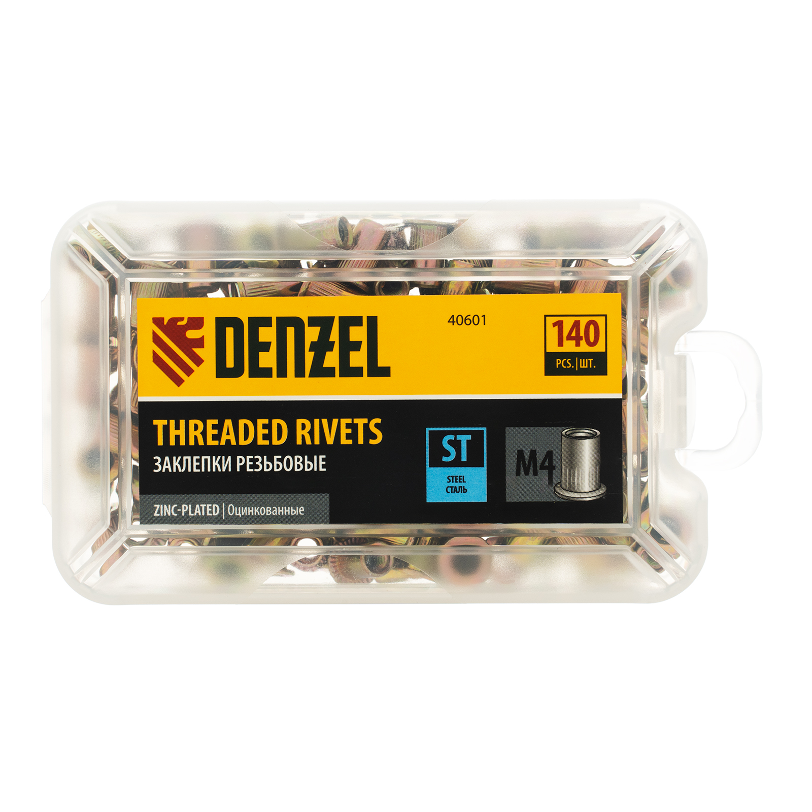Стальные резьбовые заклепки Denzel 40601, с резьбой M4, оцинкованные, предназначены для скрепления листовых материалов толщиной 0,5-2 мм. Совместимы с заклепочником Denzel 40501. Позволяют получить резьбовое соединение даже при одностороннем доступе к месту крепления. Крепежные элементы используются для проведения строительных и монтажных работ, пригодятся на даче и в гараже.