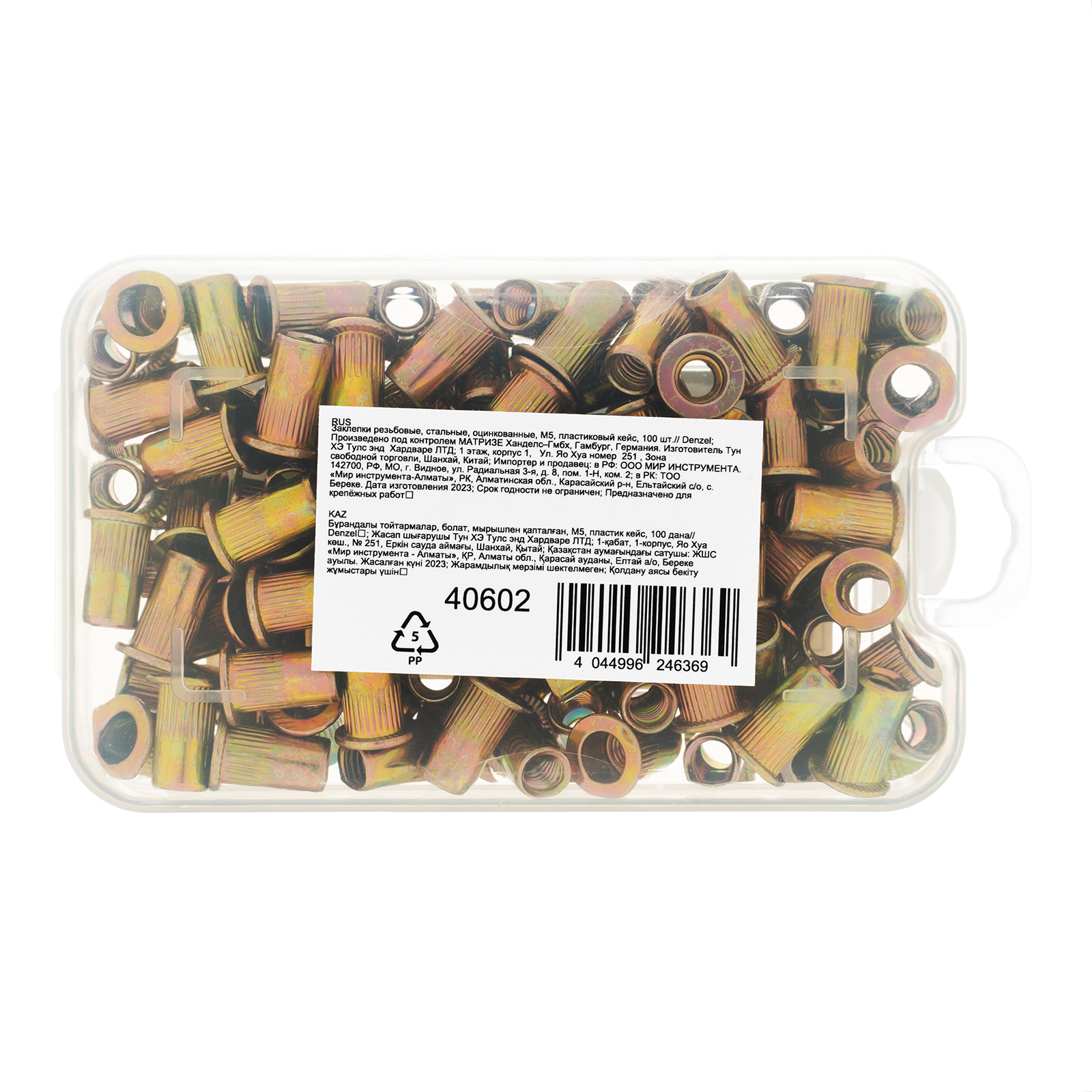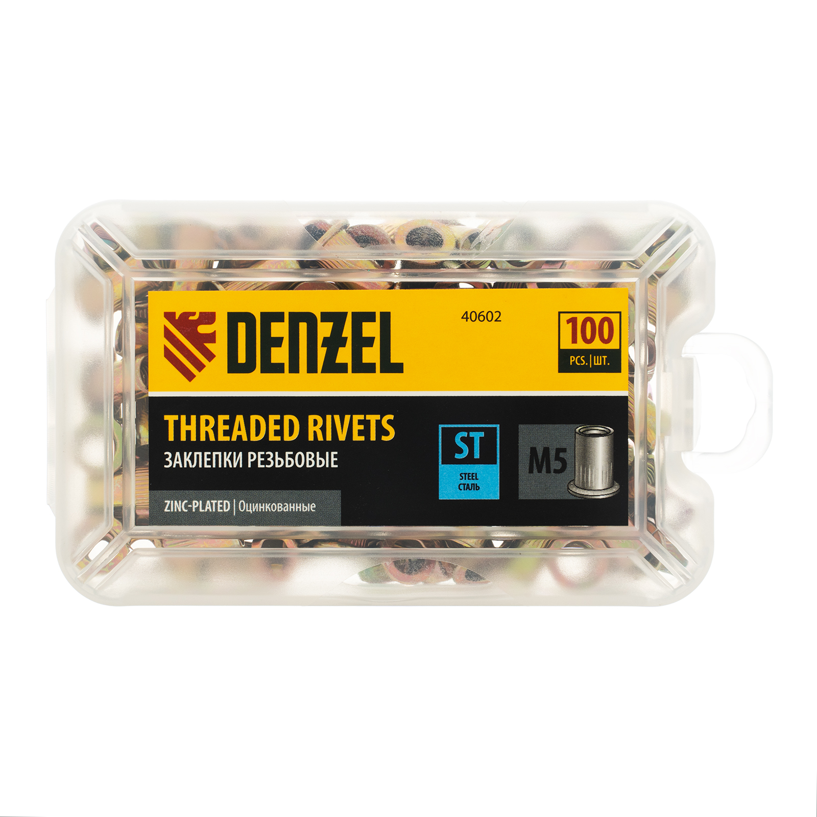 Стальные резьбовые заклепки Denzel 40602, с резьбой M5, оцинкованные, предназначены для скрепления листовых материалов толщиной 0,5-2,5 мм. Совместимы с заклепочником Denzel 40501. Позволяют получить резьбовое соединение даже при одностороннем доступе к месту крепления. Крепежные элементы используются для проведения строительных и монтажных работ, пригодятся на даче и в гараже.