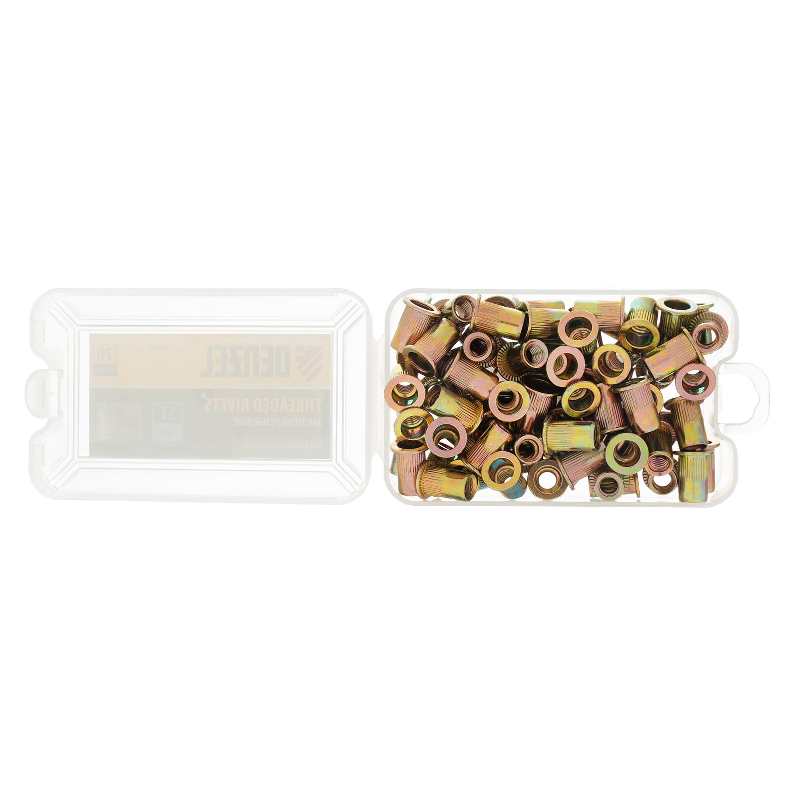 Стальные резьбовые заклепки Denzel 40603, с резьбой M6, оцинкованные, предназначены для скрепления листовых материалов толщиной 0,5-3 мм. Совместимы с заклепочником Denzel 40501. Позволяют получить резьбовое соединение даже при одностороннем доступе к месту крепления. Крепежные элементы используются для проведения строительных и монтажных работ, пригодятся на даче и в гараже.