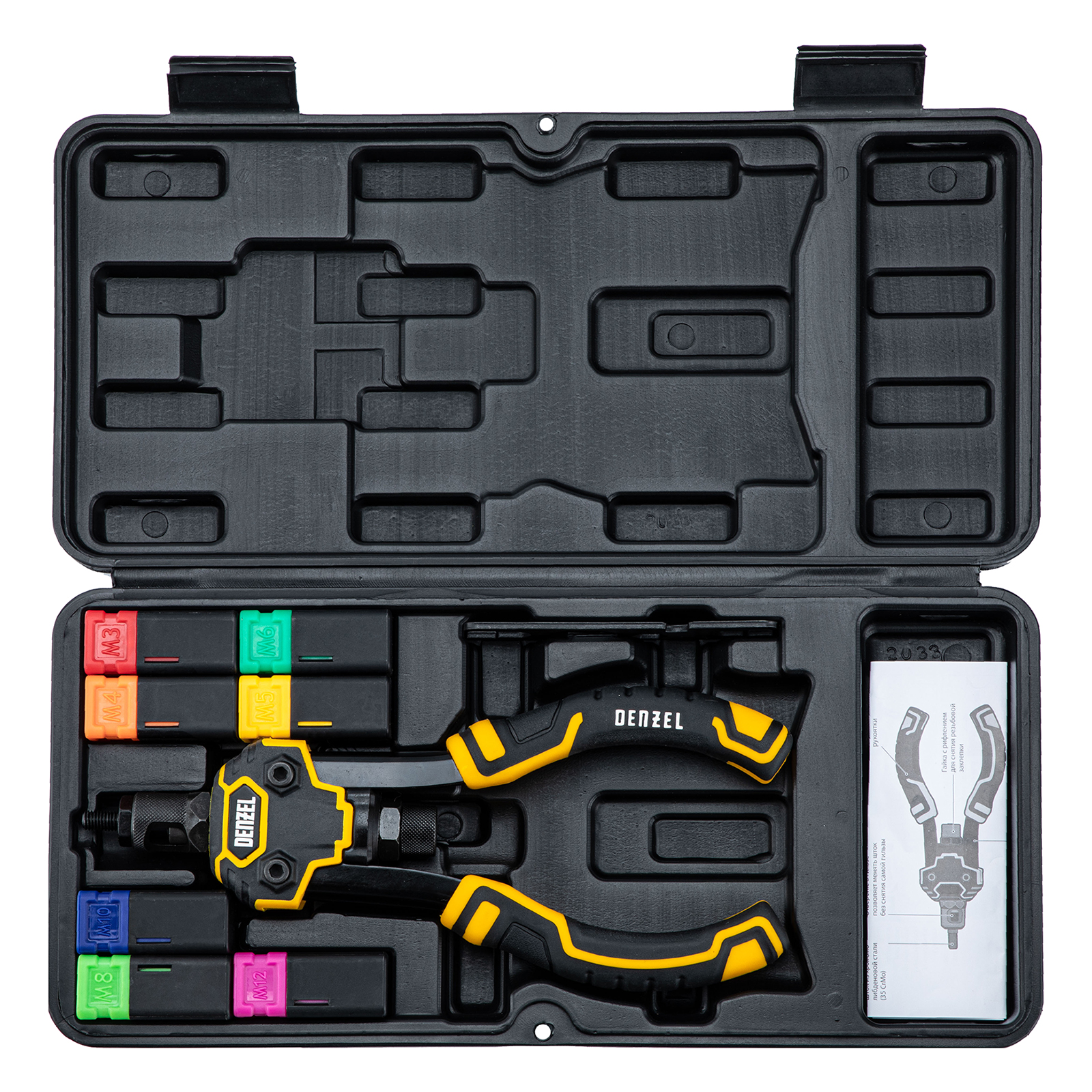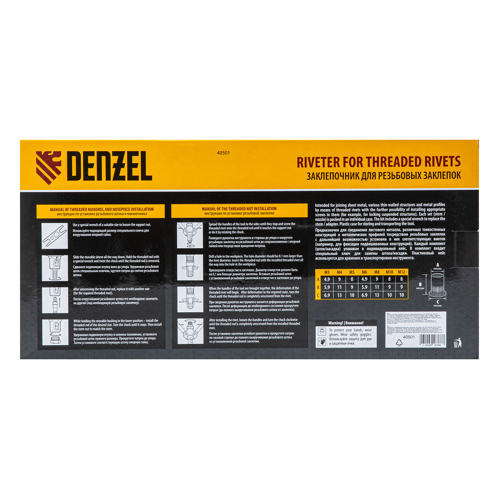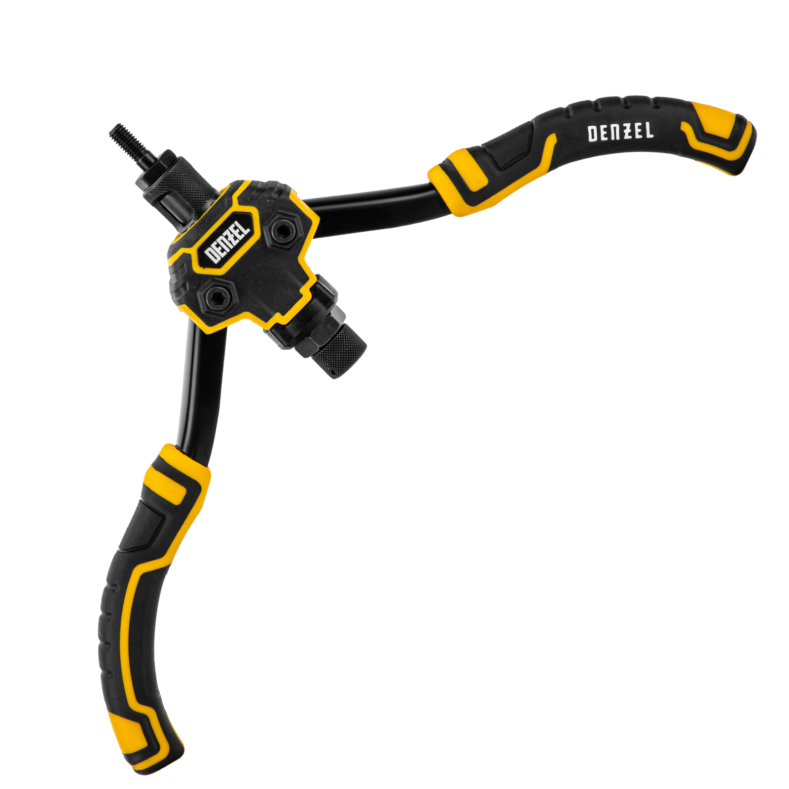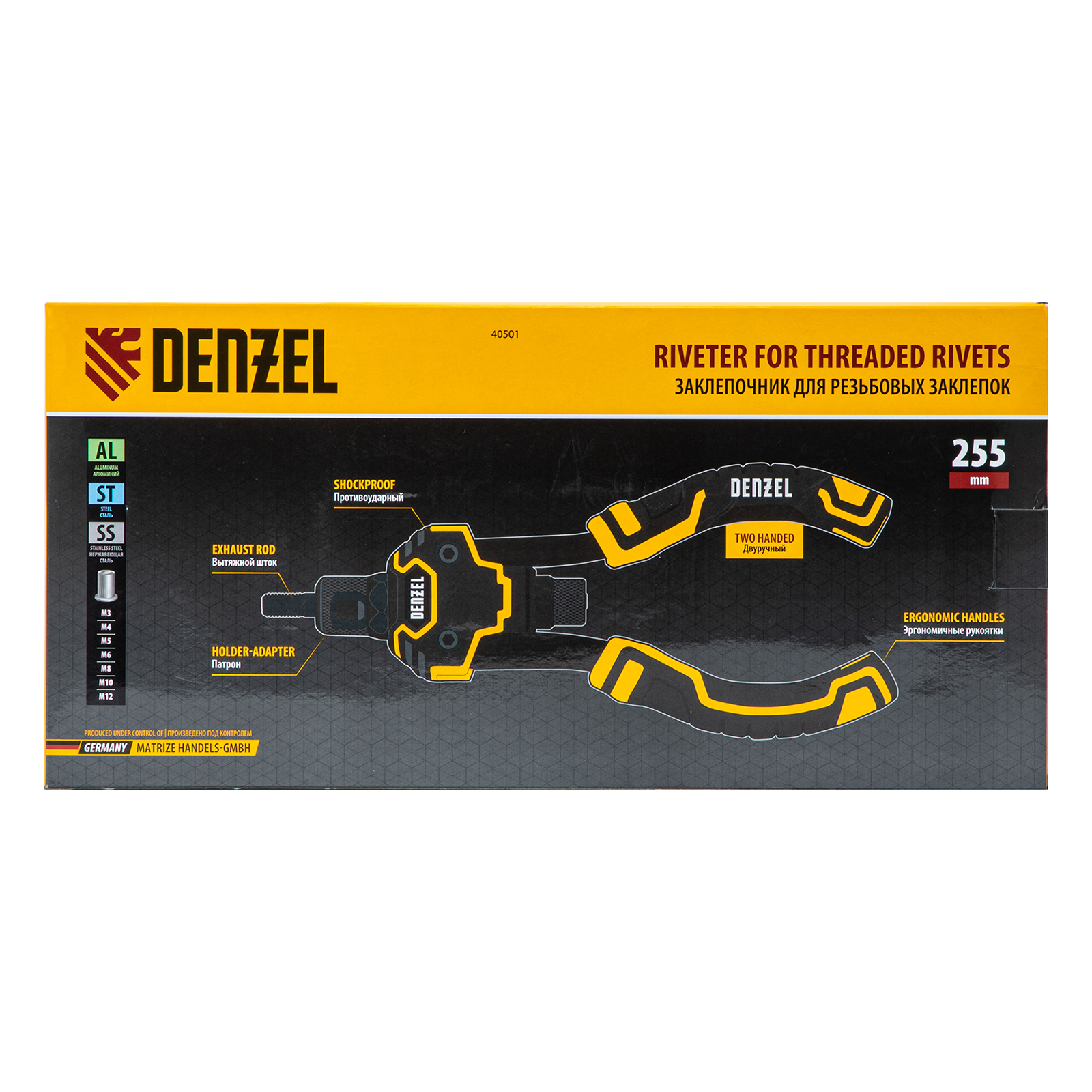 Заклепочник двуручный Denzel 40501 длиной 255 мм предназначен для создания неразъемных соединений при помощи резьбовых заклепок из алюминия, стали или нержавеющей стали (М3, М4, М5, М6, М8, М10, М12). Позволяет прочно фиксировать листовые заготовки, металлический профиль и легкие конструкции. Для каждого типоразмера заклепок предусмотрена соответствующая головка. Инструмент применяется при проведении строительных, монтажных работ, будет полезен дома, в гараже или на даче.