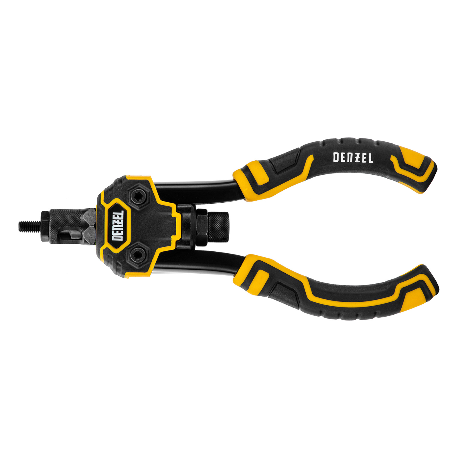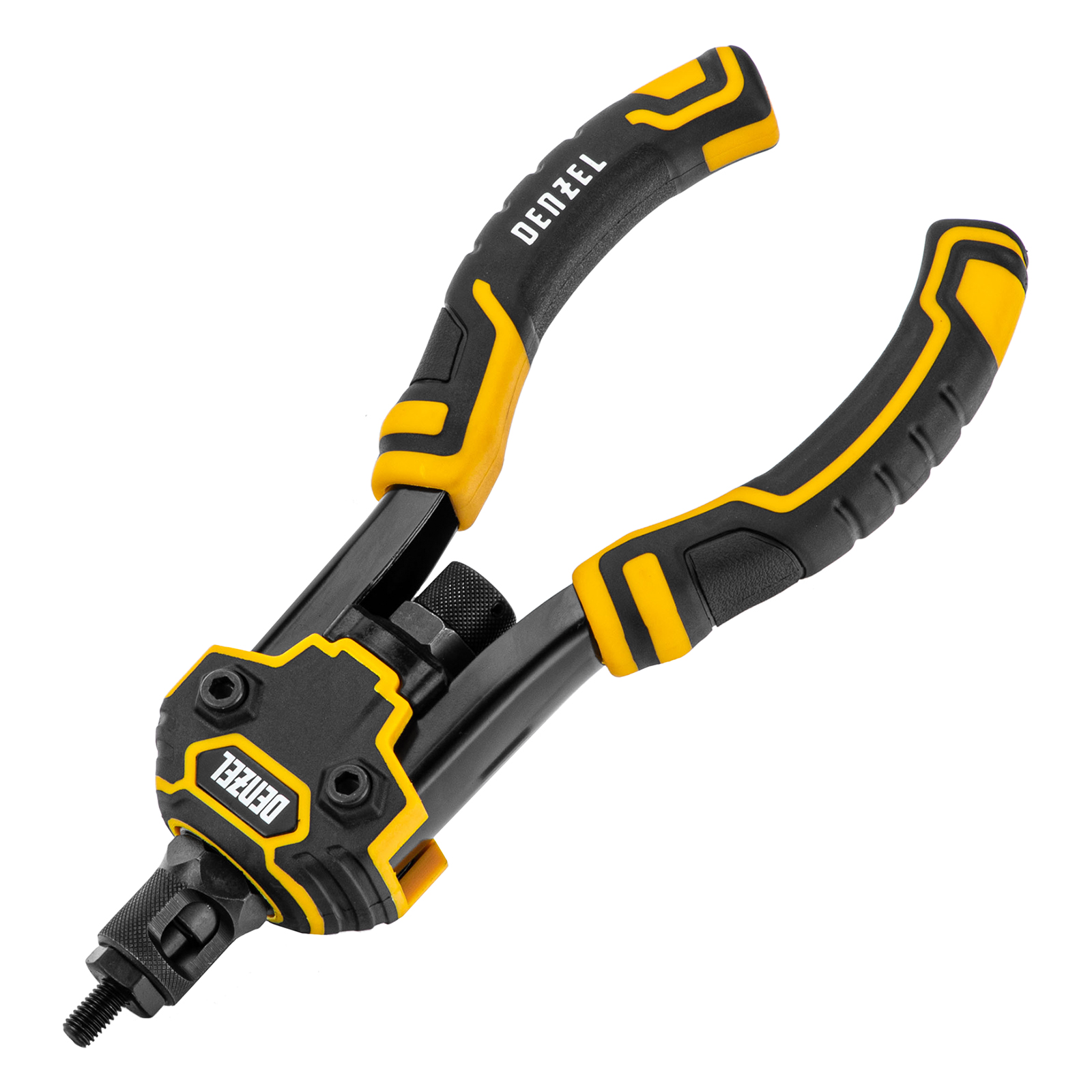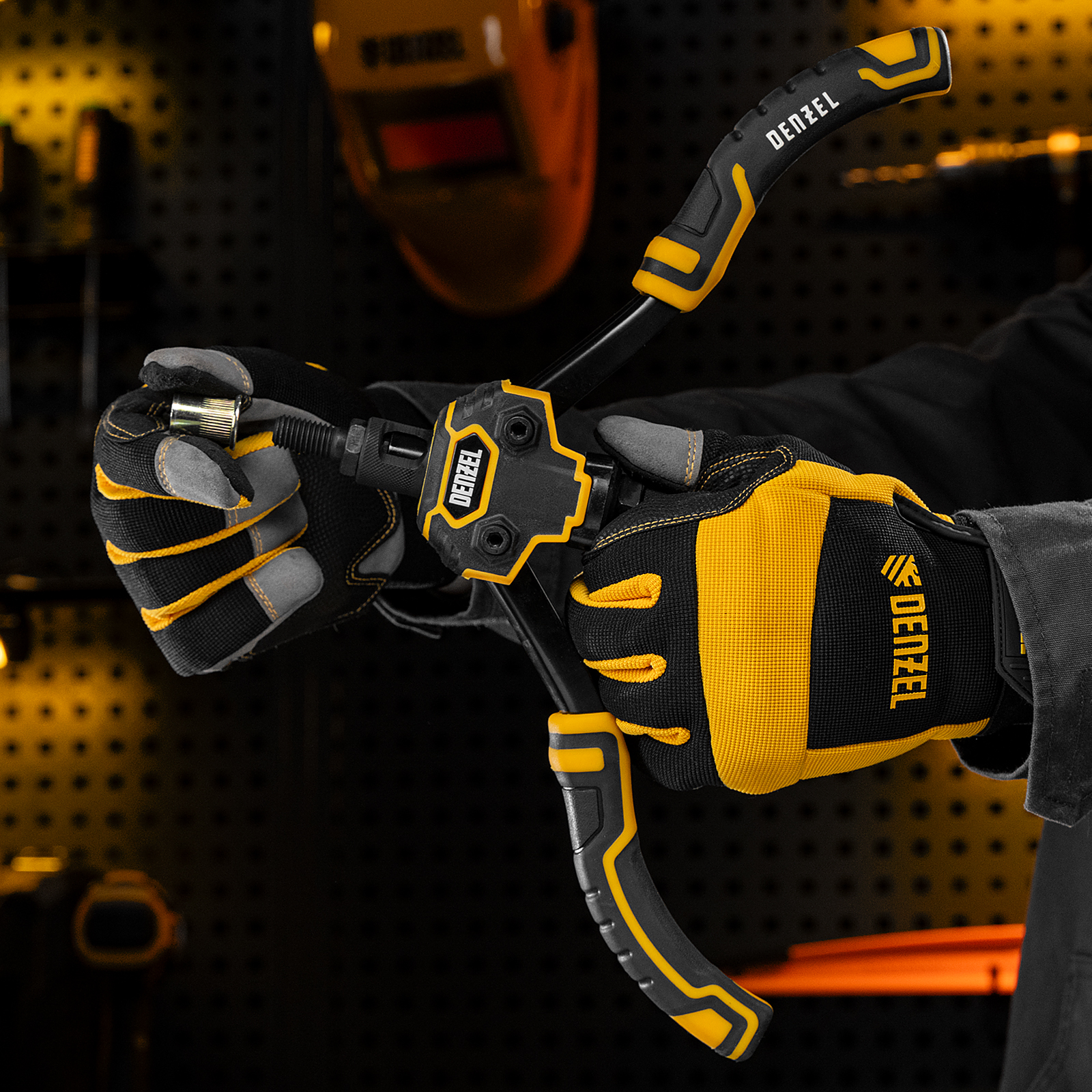 Заклепочник двуручный Denzel 40501 длиной 255 мм предназначен для создания неразъемных соединений при помощи резьбовых заклепок из алюминия, стали или нержавеющей стали (М3, М4, М5, М6, М8, М10, М12). Позволяет прочно фиксировать листовые заготовки, металлический профиль и легкие конструкции. Для каждого типоразмера заклепок предусмотрена соответствующая головка. Инструмент применяется при проведении строительных, монтажных работ, будет полезен дома, в гараже или на даче.