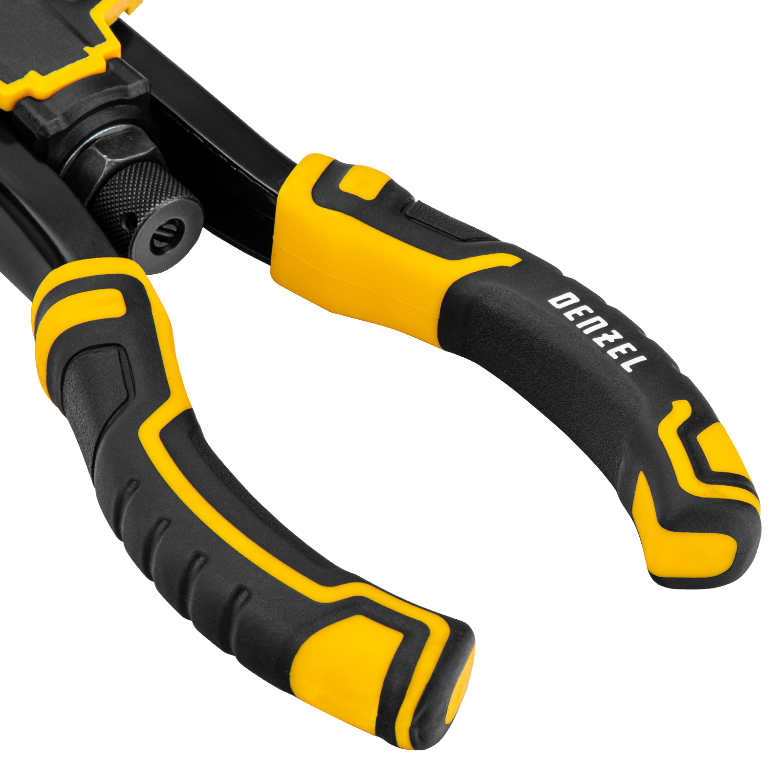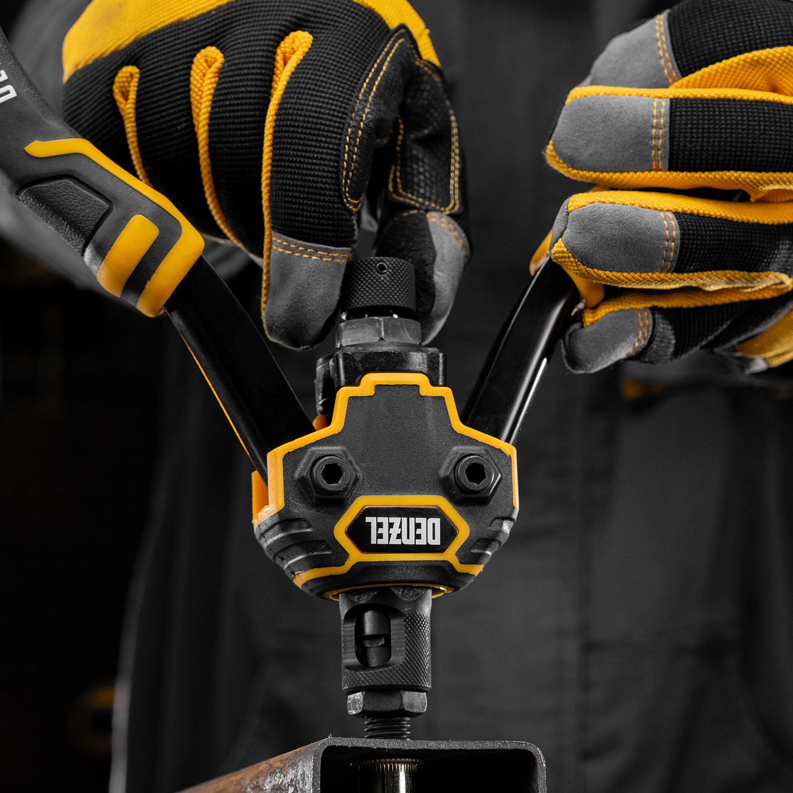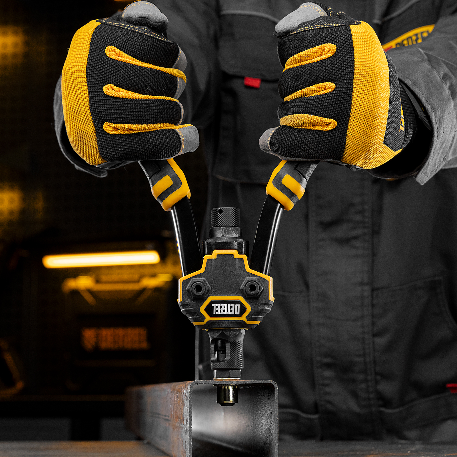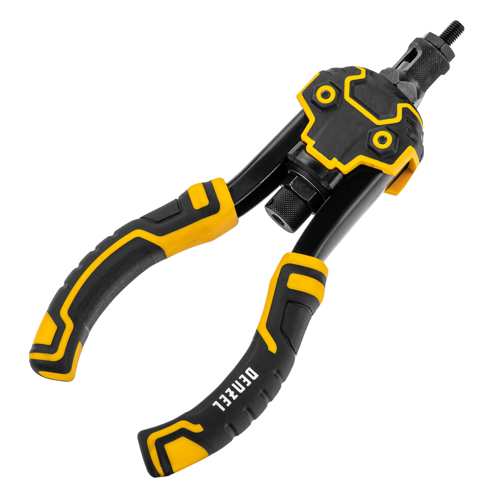 Заклепочник двуручный Denzel 40501 длиной 255 мм предназначен для создания неразъемных соединений при помощи резьбовых заклепок из алюминия, стали или нержавеющей стали (М3, М4, М5, М6, М8, М10, М12). Позволяет прочно фиксировать листовые заготовки, металлический профиль и легкие конструкции. Для каждого типоразмера заклепок предусмотрена соответствующая головка. Инструмент применяется при проведении строительных, монтажных работ, будет полезен дома, в гараже или на даче.