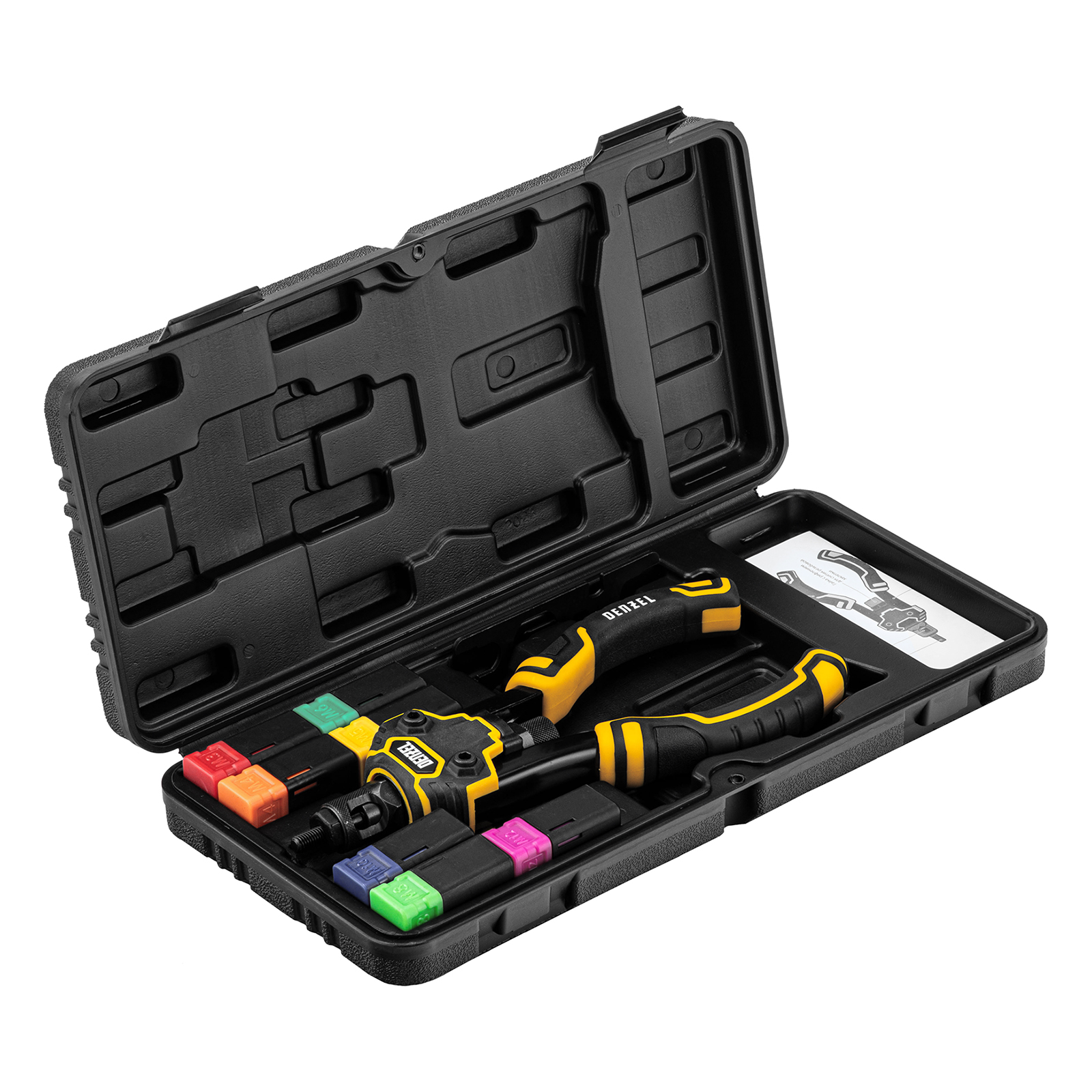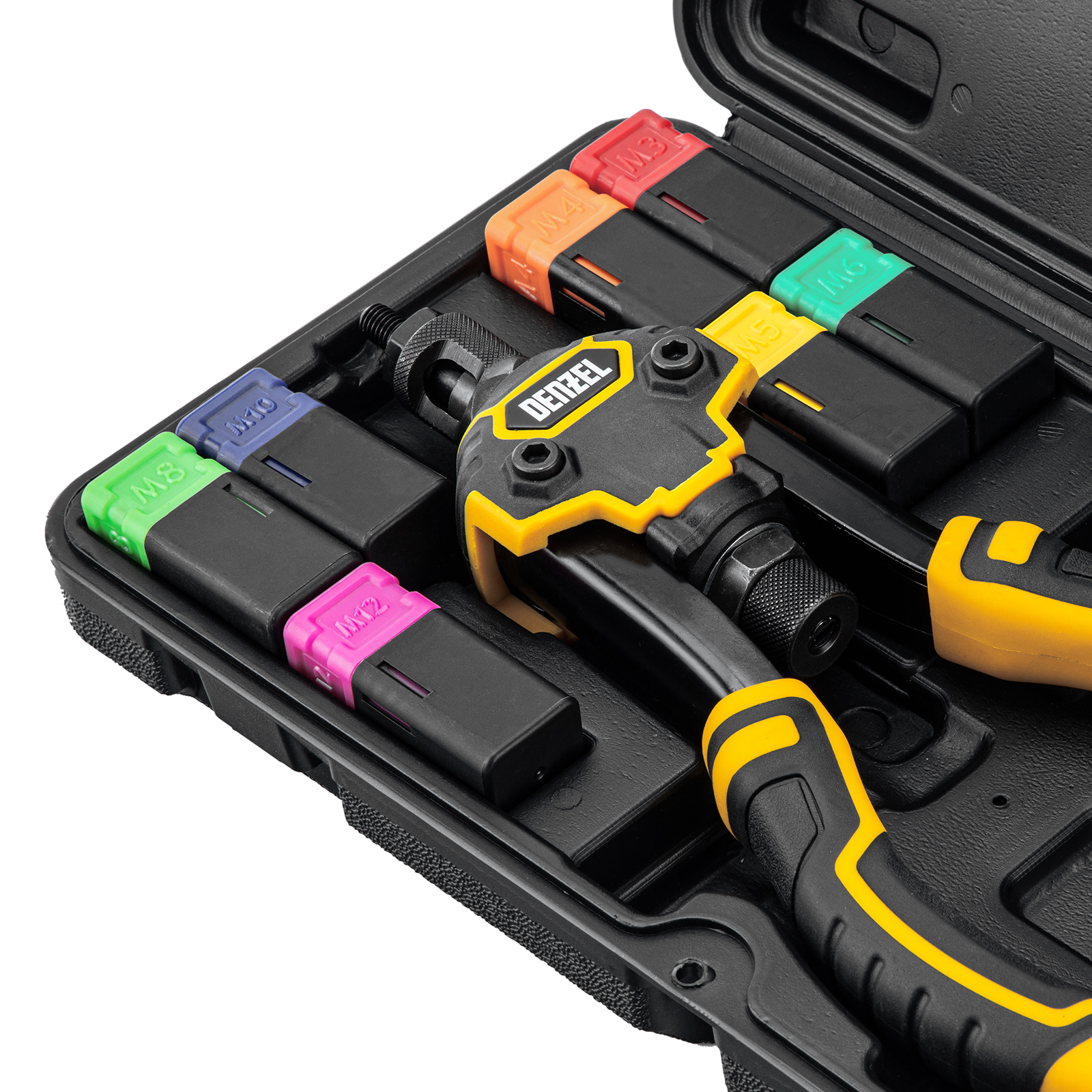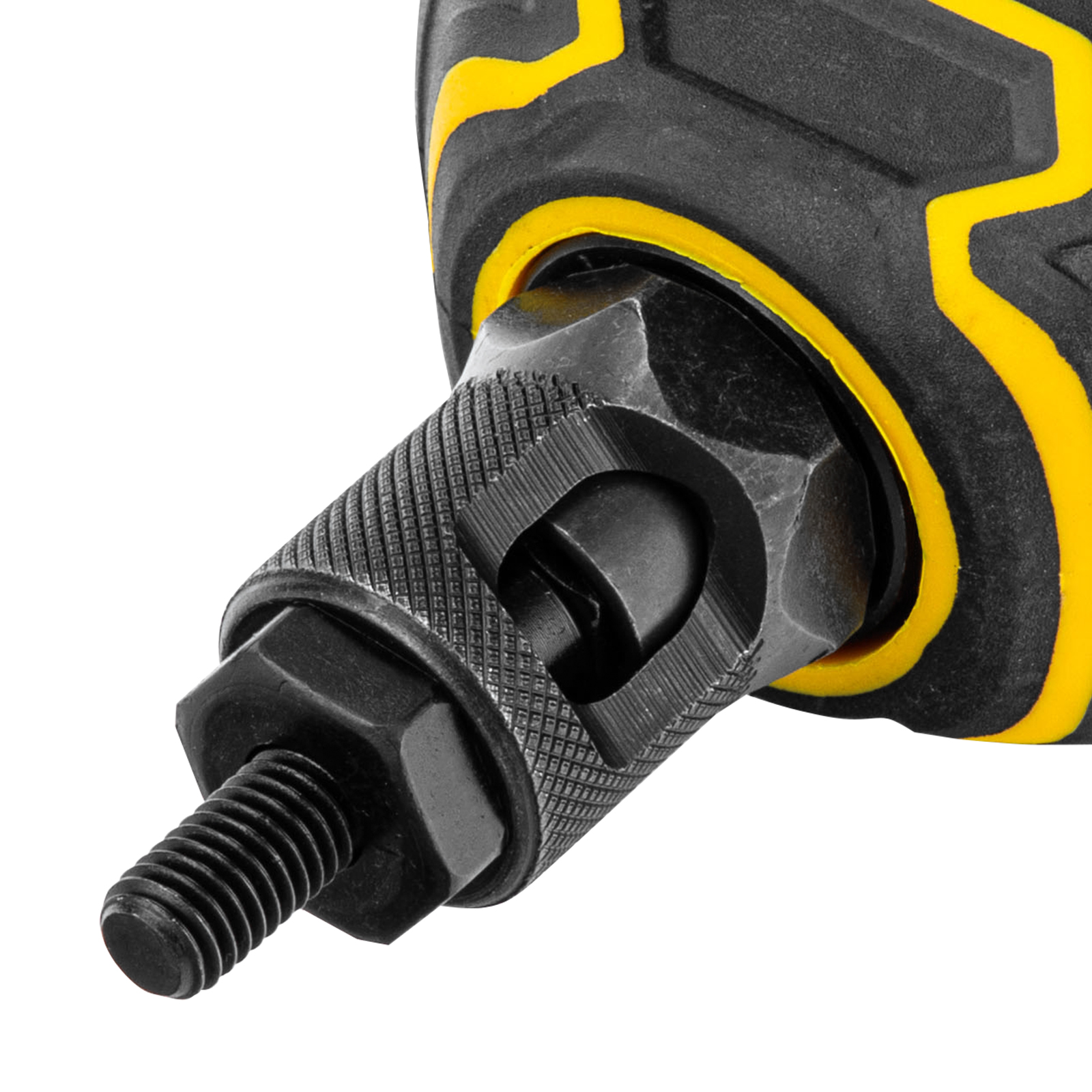 - Продуманная комплектация — заклепочник поставляется с ключом для быстрой установки насадок.