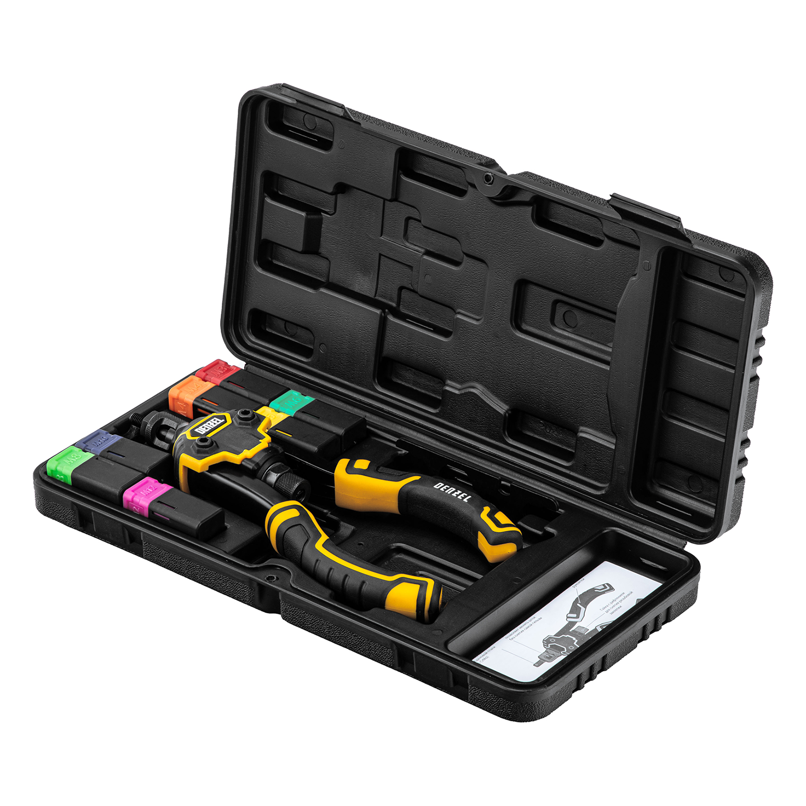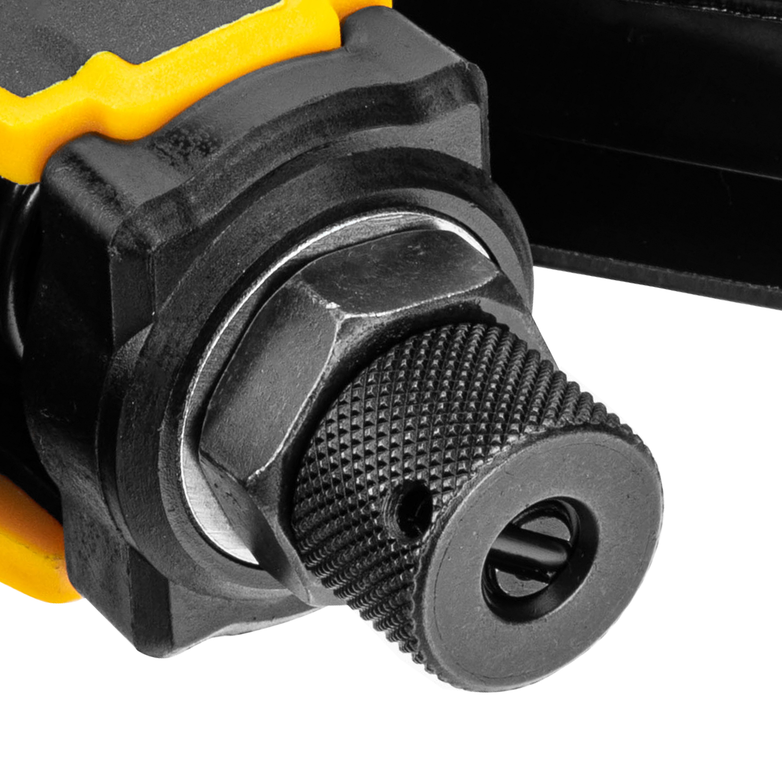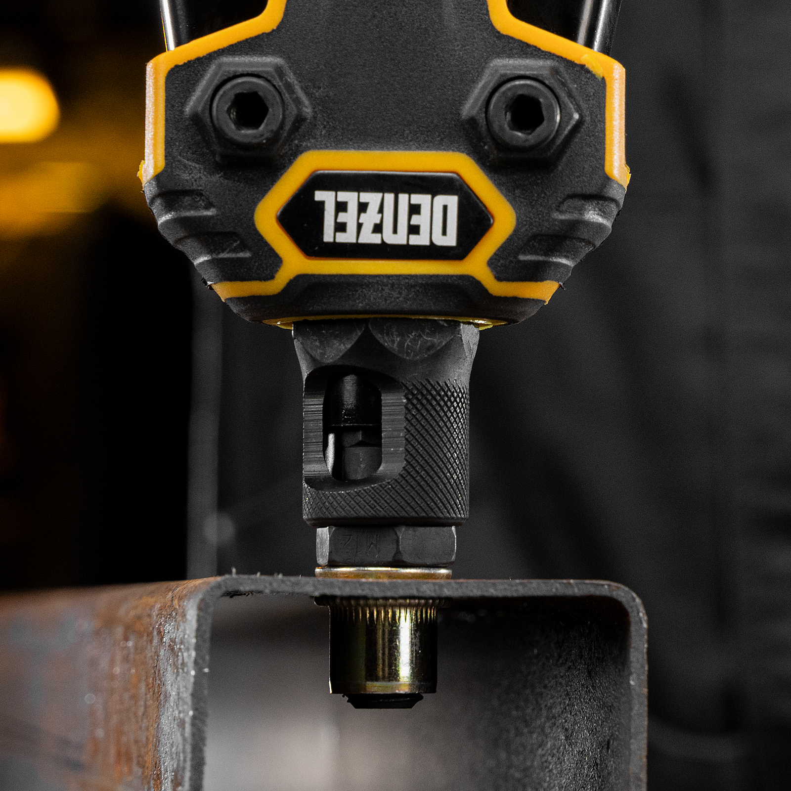 - Продуманная комплектация — заклепочник поставляется с ключом для быстрой установки насадок.