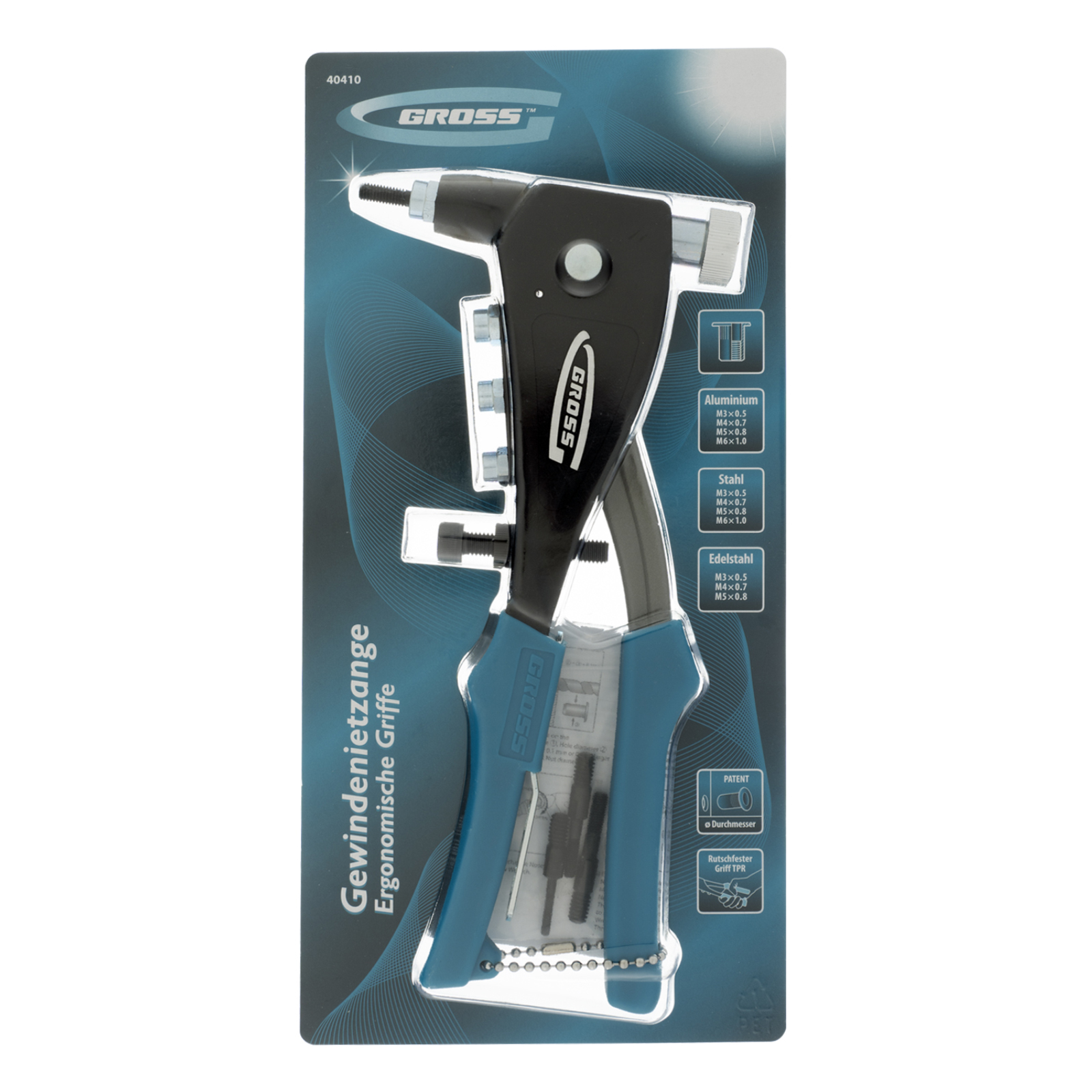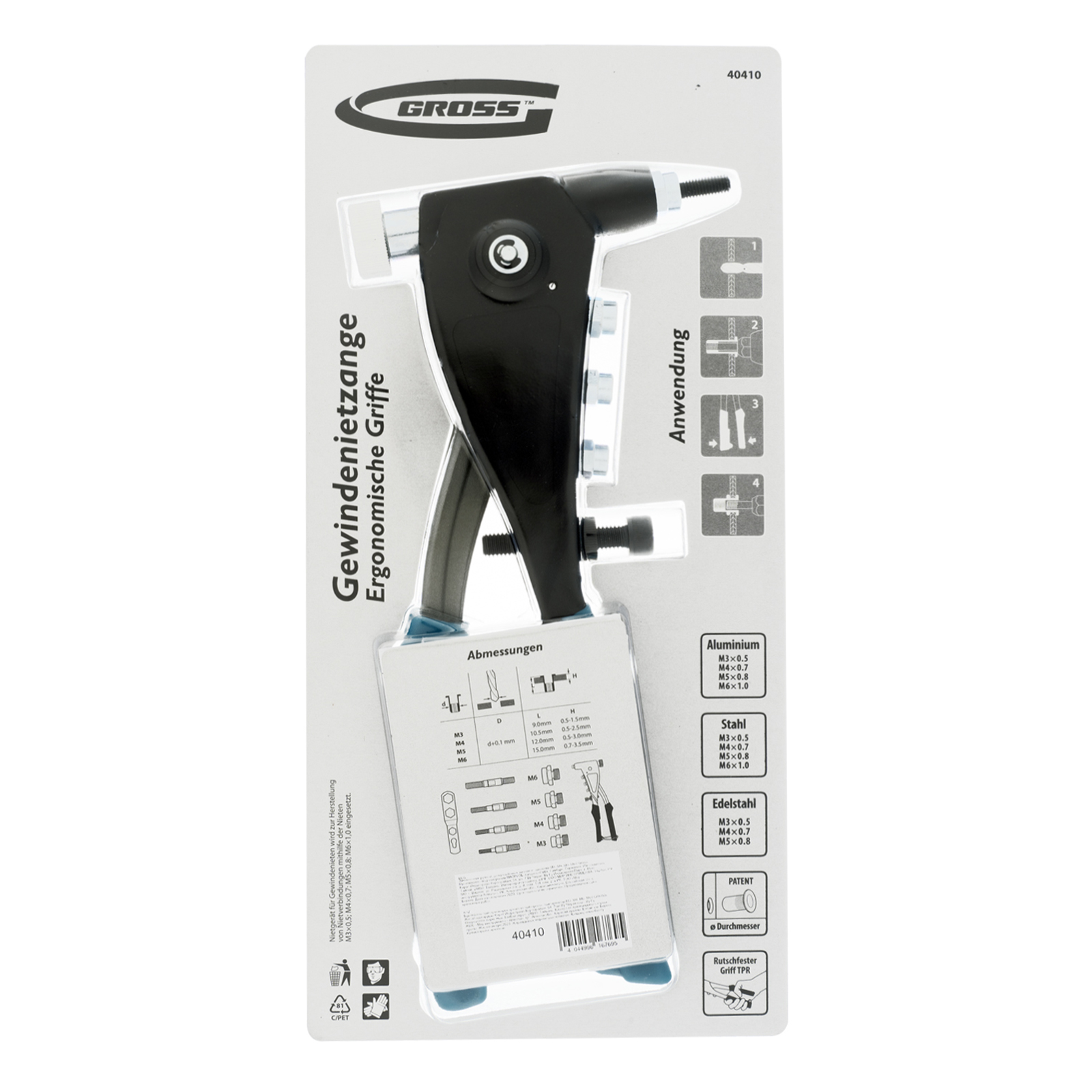 Ручной заклепочник Gross 40410 предназначен для создания неразъемных соединений при помощи резьбовых заклепок. Заклепки из алюминия, стали (М3, М4, М5, М6) или нержавеющей стали (М3, М4, М5) позволяют прочно зафиксировать листовые заготовки, металлический профиль и легкие конструкции. Для каждого типоразмера предусмотрена соответствующая головка. Полученные с помощью заклепочника соединения допускают установку соответствующих винтов для подвешивания различных конструкций. Заклепочник применяется для строительных, монтажных работ, будет полезен дома, в гараже или на даче.