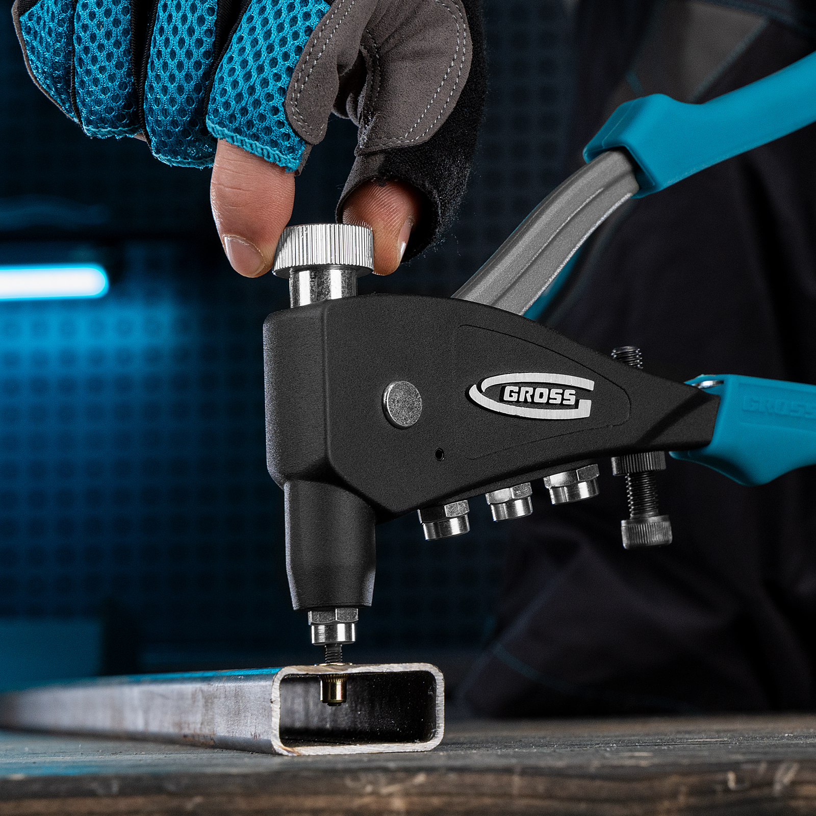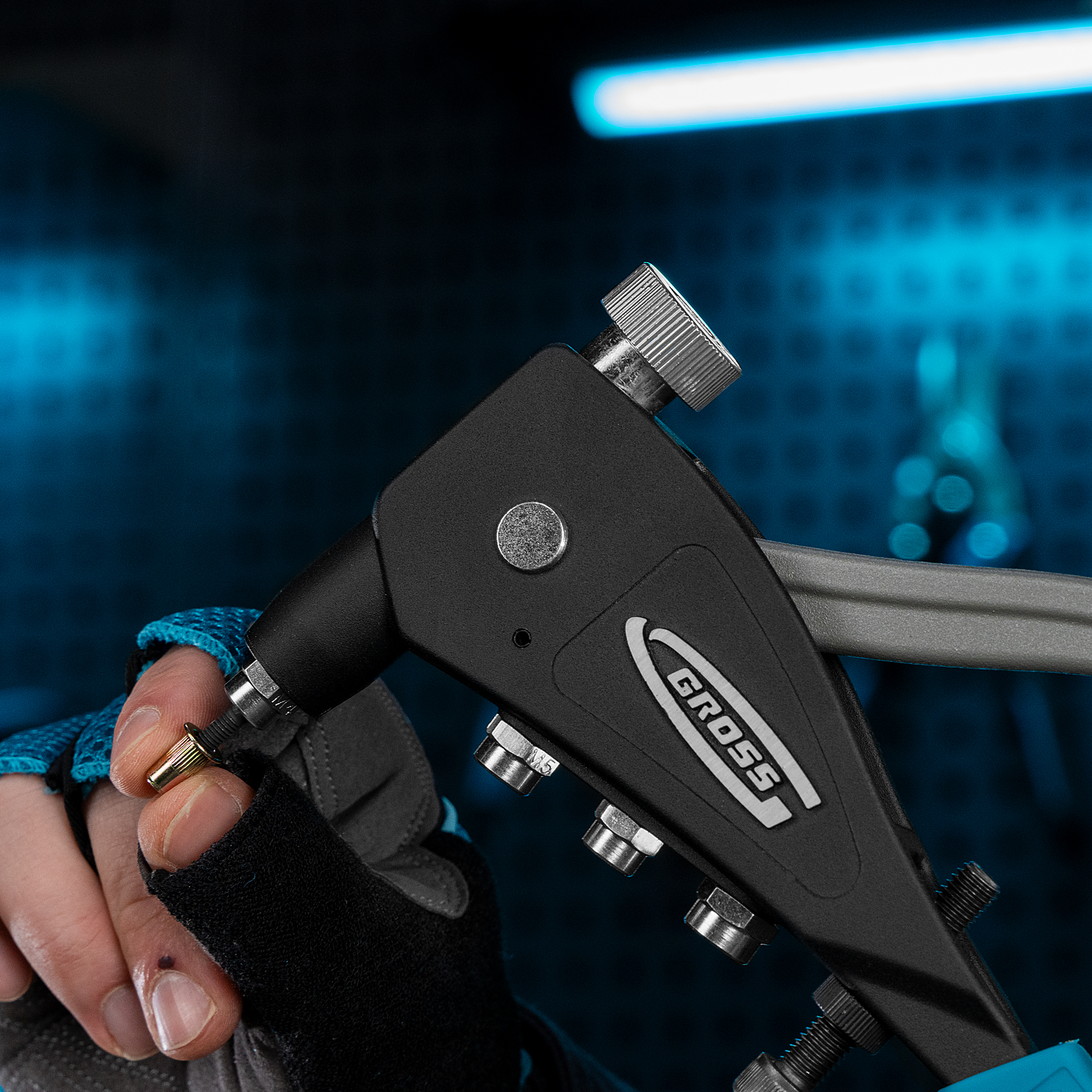 - Быстрая замена насадок — сменные головки всегда под рукой, т .к. крепятся на корпус заклепочника.