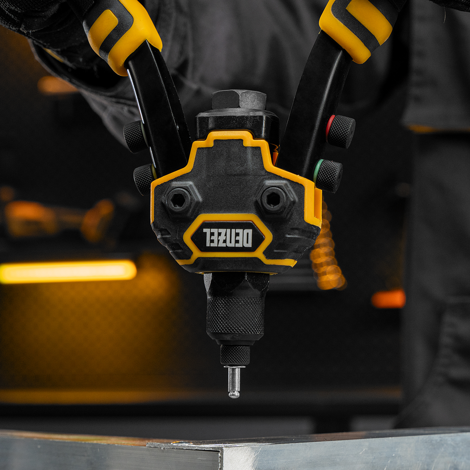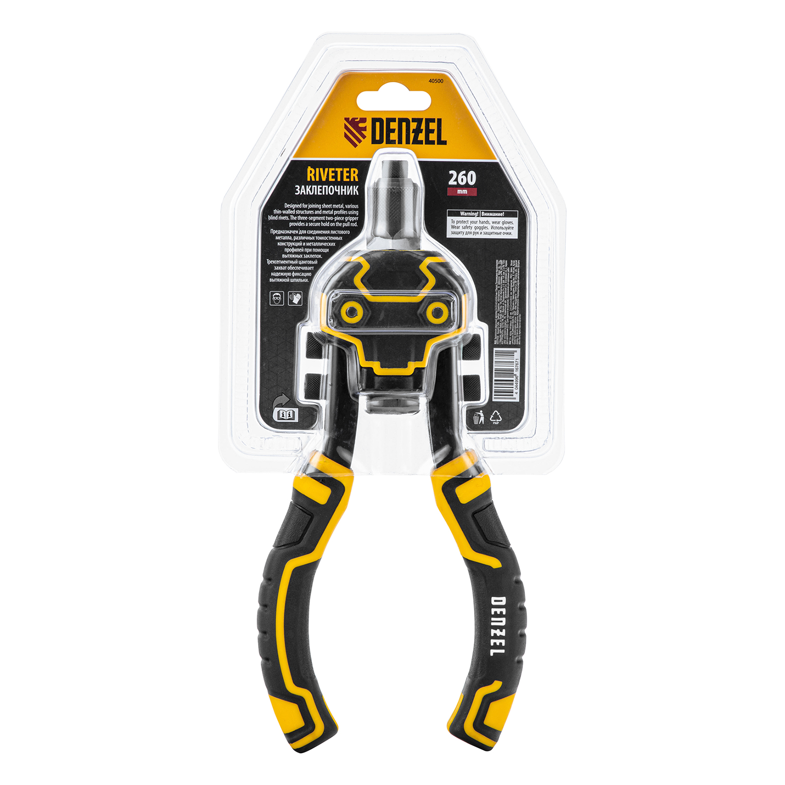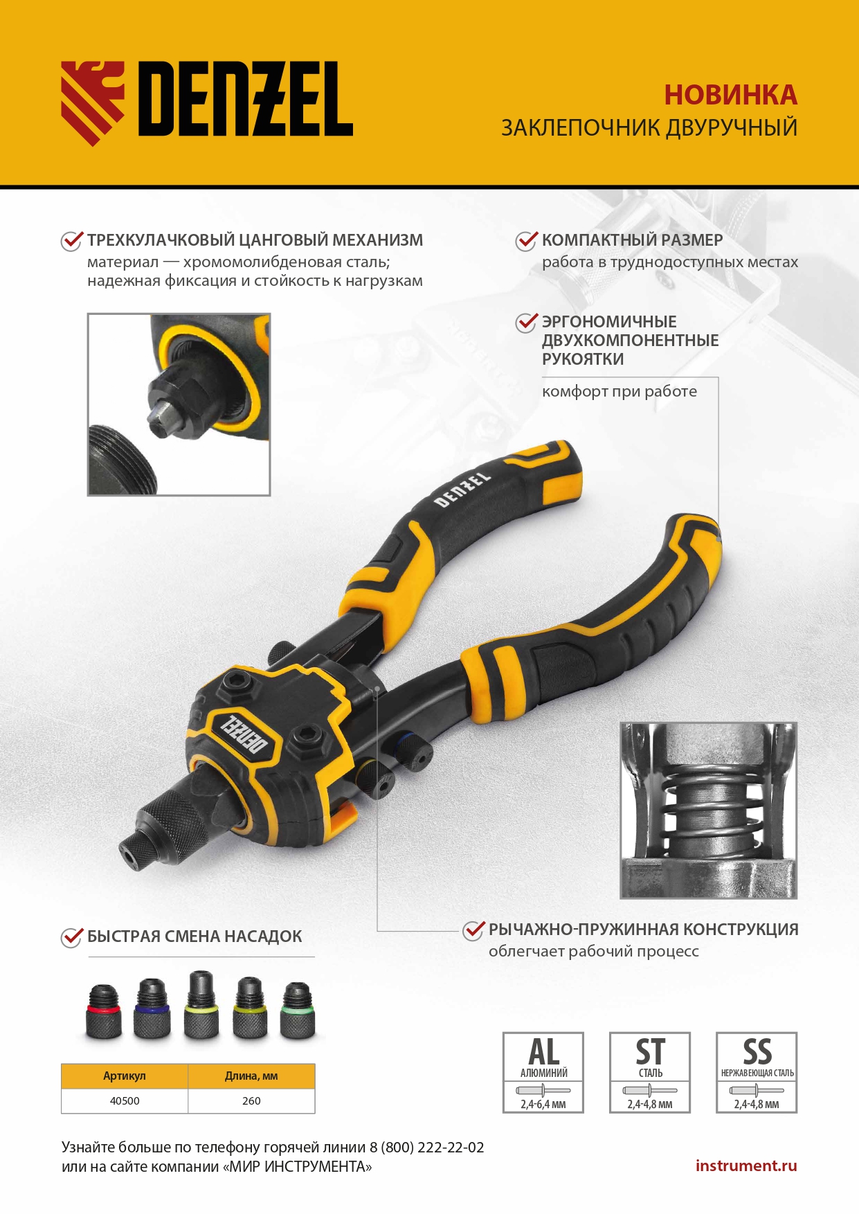 Заклепочник двуручный Denzel 40500 длиной 250 мм предназначен для работы с алюминиевыми и стальными заклепками диаметром 2,4-6,4 мм и 2,4-4,8 мм соответственно. Используется для прочного соединения листовых металлических заготовок, легких конструкций небольшой толщины и металлопрофилей. Двуручный заклепочник требует меньше усилий от пользователя для вытягивания шпильки, поэтому подходит для профессионального применения и выполнения больших объемов работ.