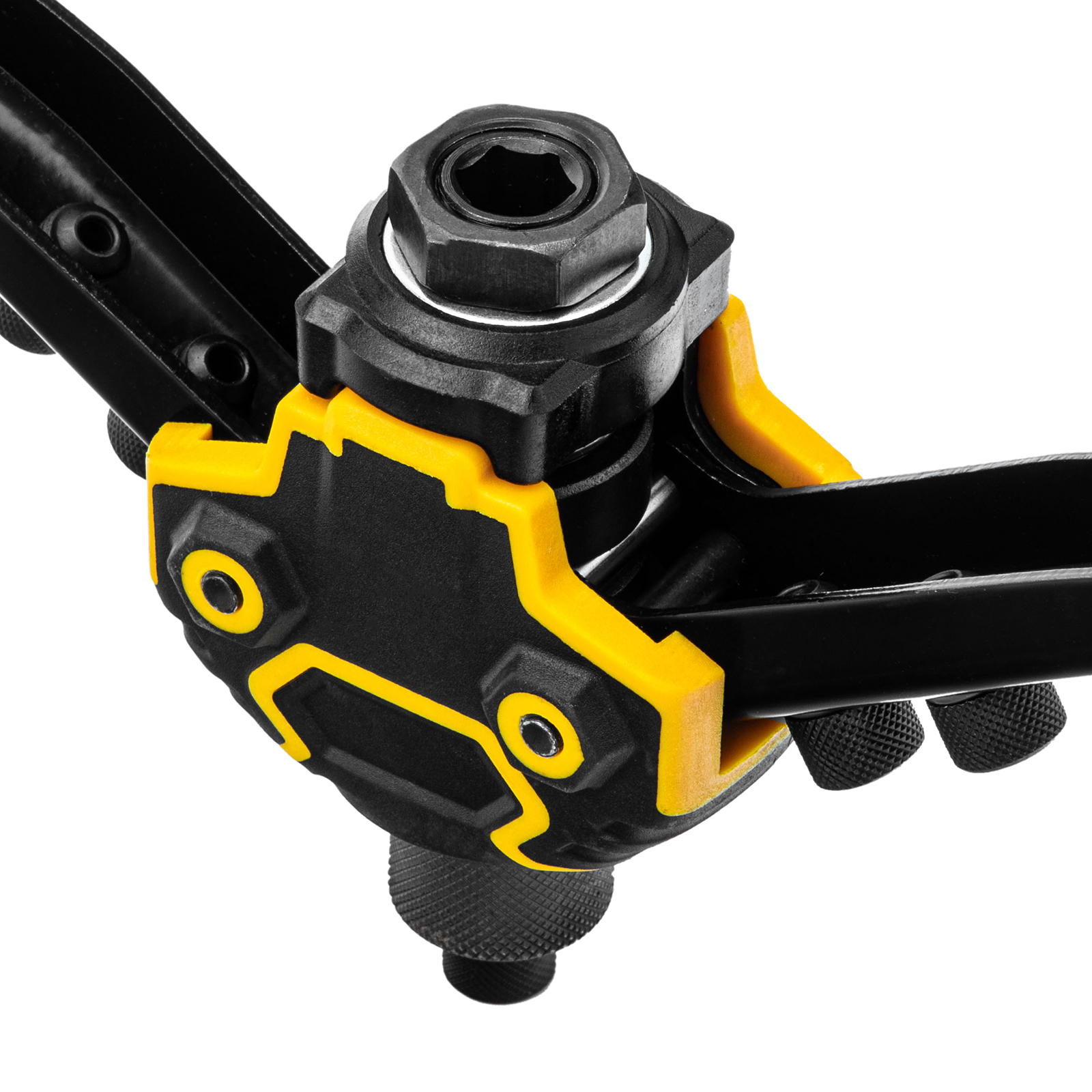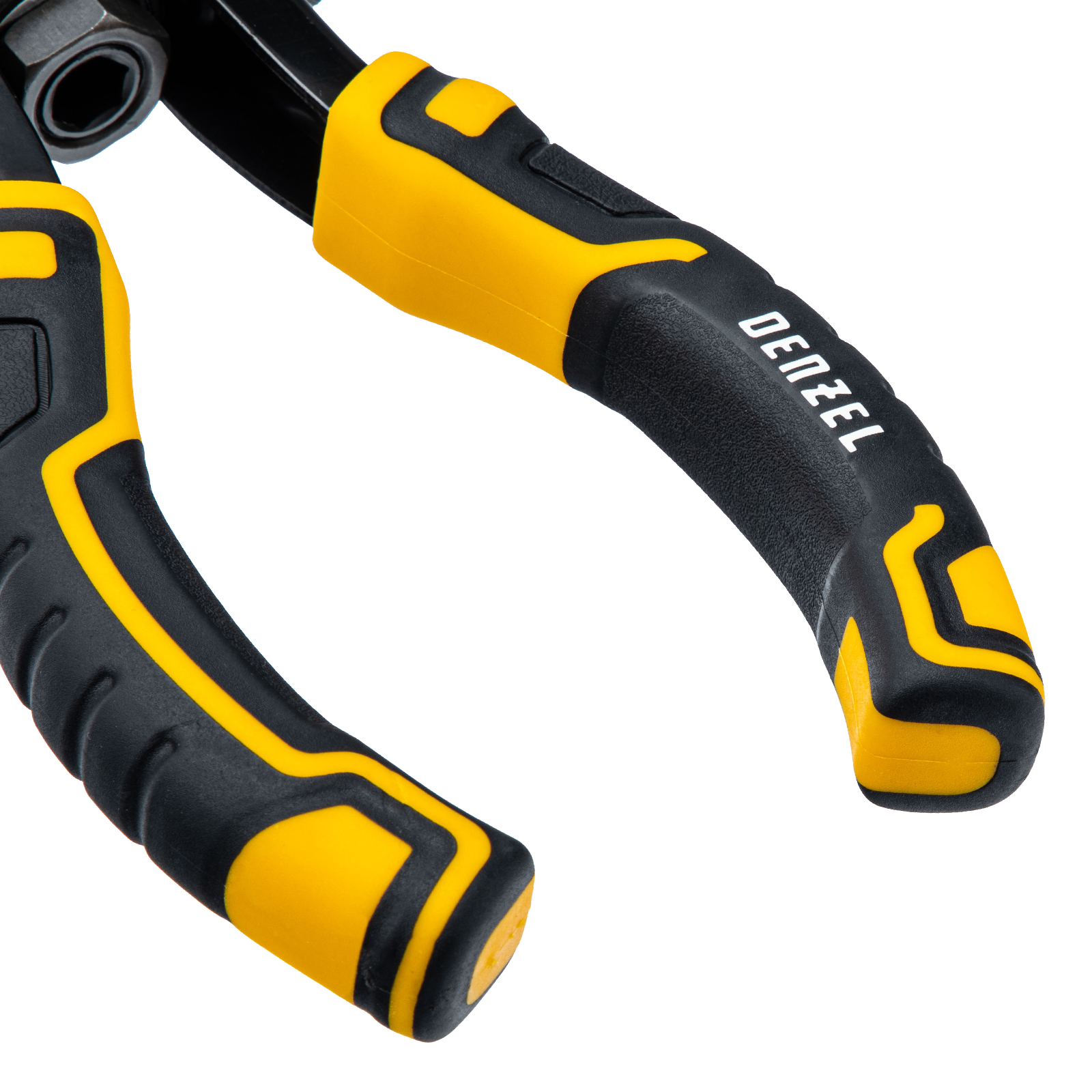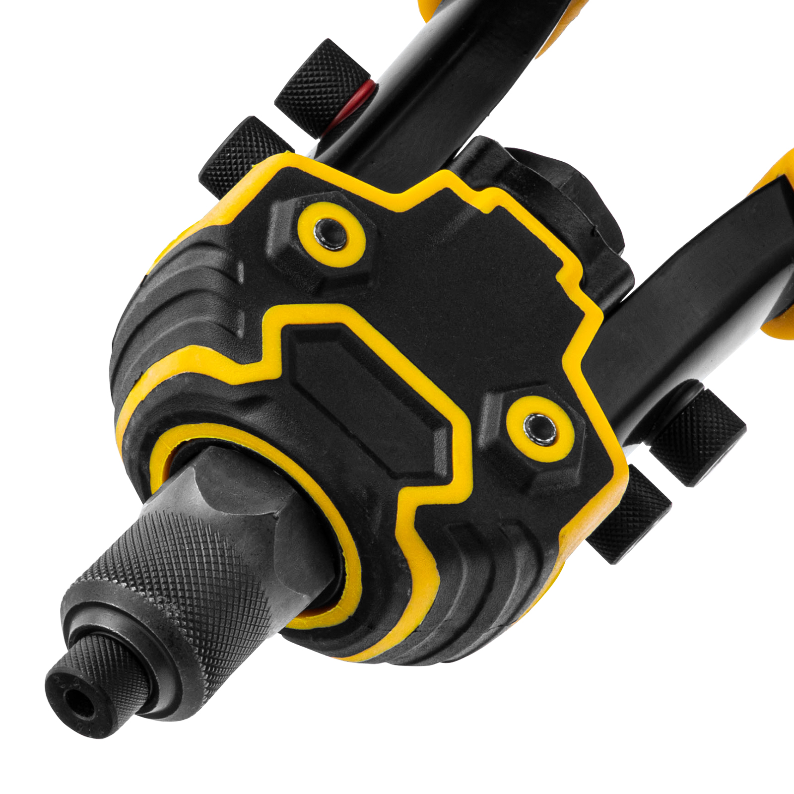 Заклепочник двуручный Denzel 40500 длиной 250 мм предназначен для работы с алюминиевыми и стальными заклепками диаметром 2,4-6,4 мм и 2,4-4,8 мм соответственно. Используется для прочного соединения листовых металлических заготовок, легких конструкций небольшой толщины и металлопрофилей. Двуручный заклепочник требует меньше усилий от пользователя для вытягивания шпильки, поэтому подходит для профессионального применения и выполнения больших объемов работ.