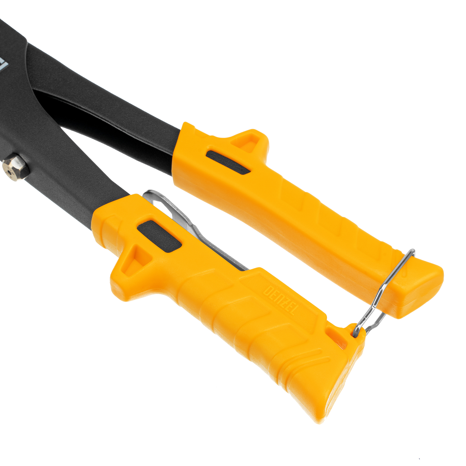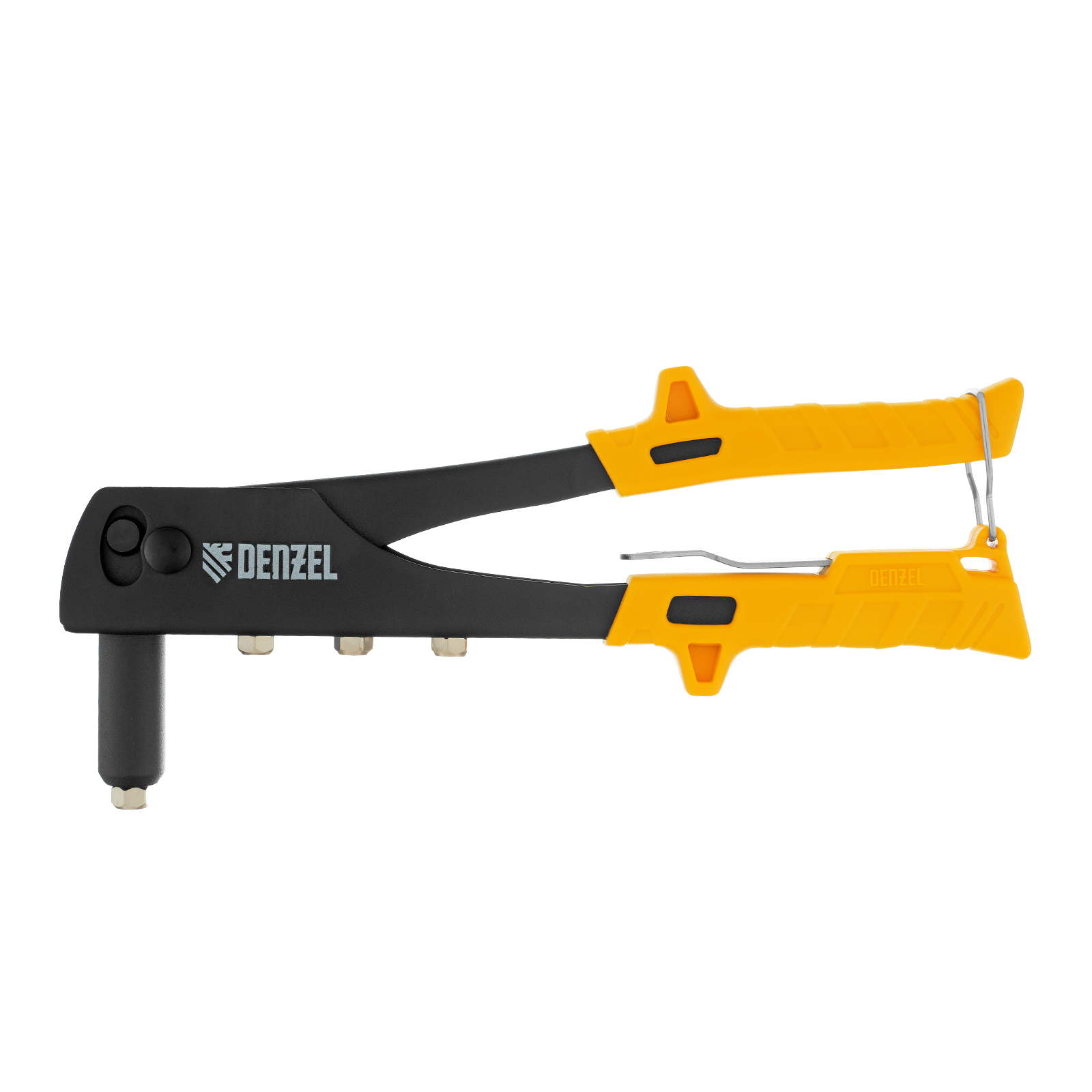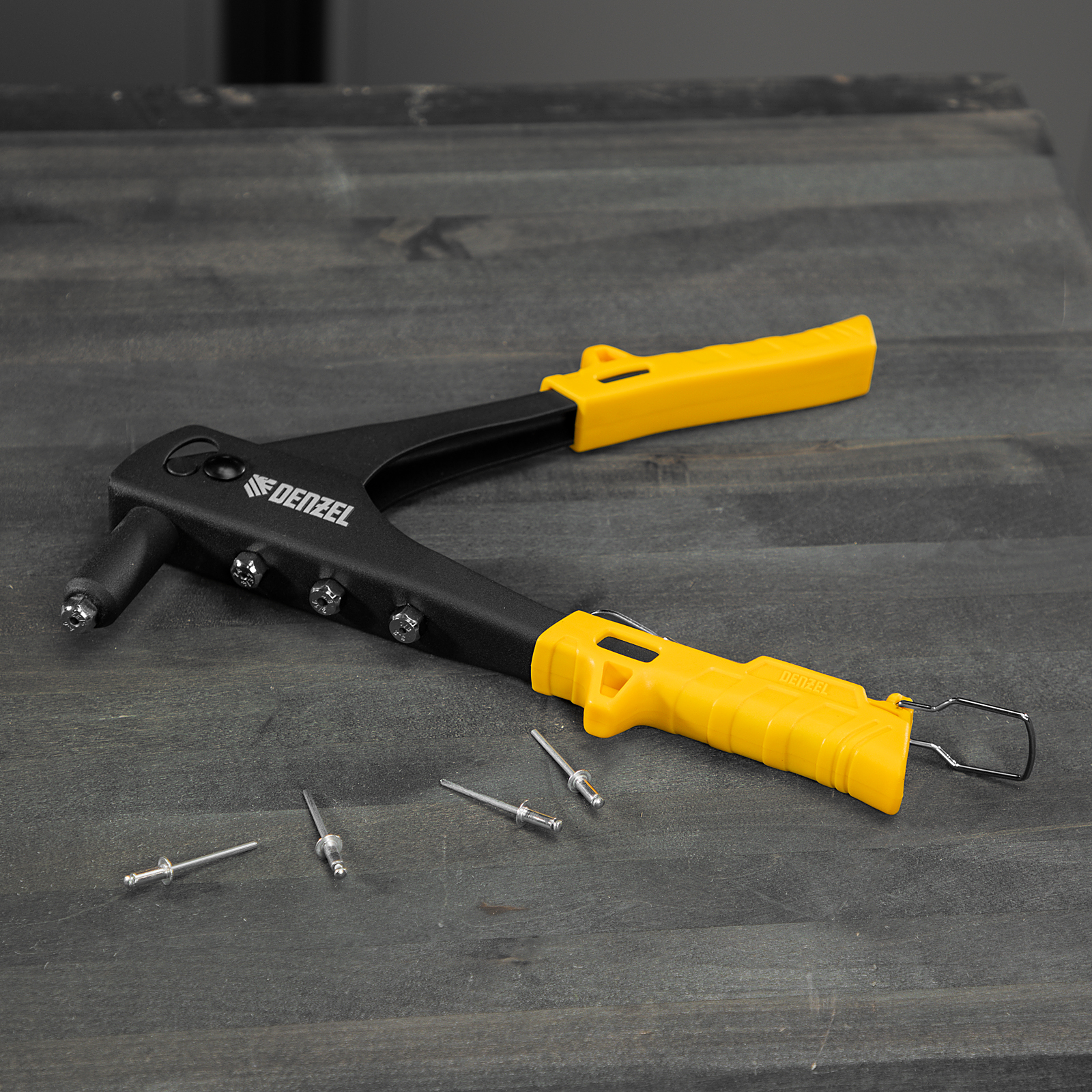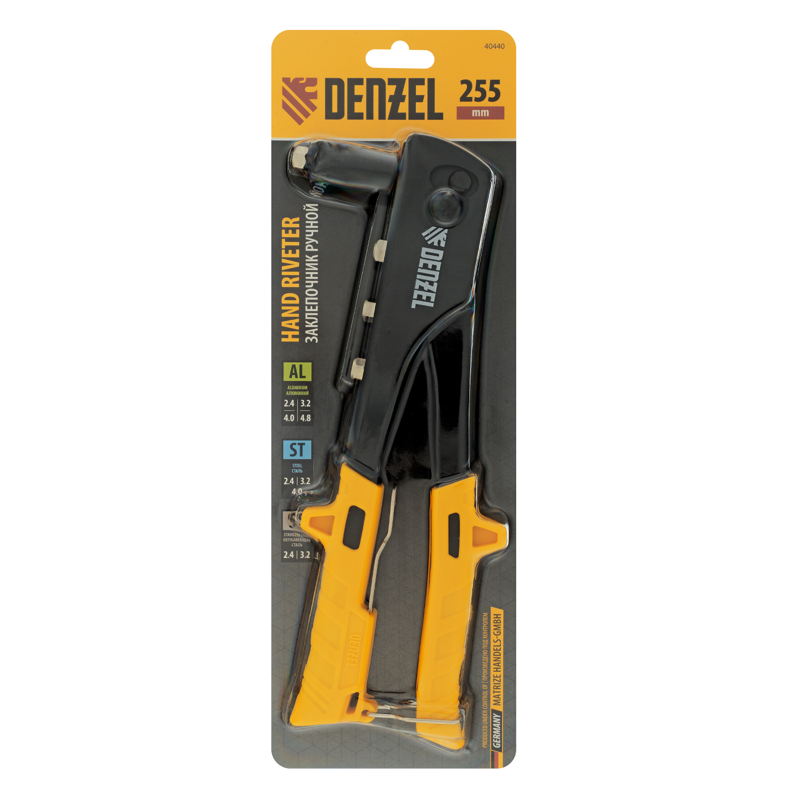 Ручной заклепочник Denzel 40440 длиной 255 мм предназначен для работы с алюминиевыми вытяжными заклепками диаметром 2,4-3,2-4,0-4,8 мм, стальными диаметром 2,4-3,2-4,0 мм и вытяжными заклепками из «нержавейки» диаметром 2,4-3,2 мм. Инструмент позволяет соединять листовые металлические заготовки, металлопрофиль и легкие конструкции небольшой толщины. Используется для проведения строительных, ремонтных и монтажных работ как в быту, так и в профессиональной сфере.