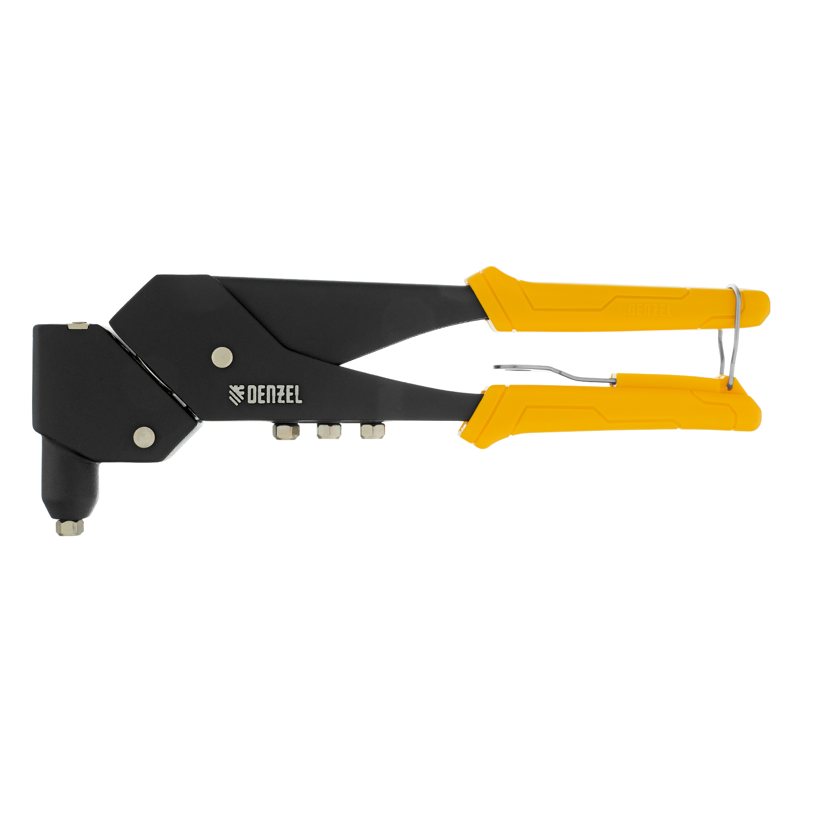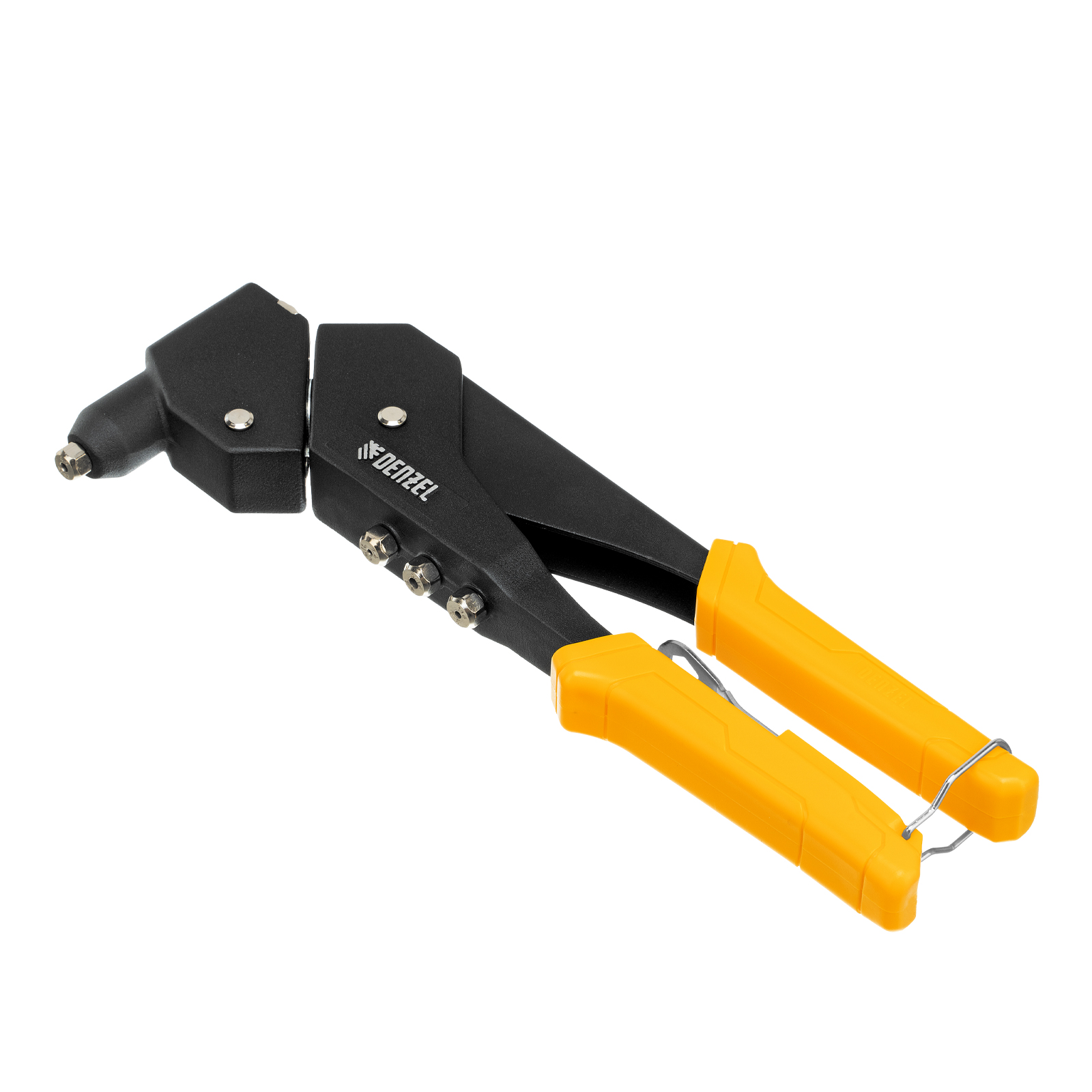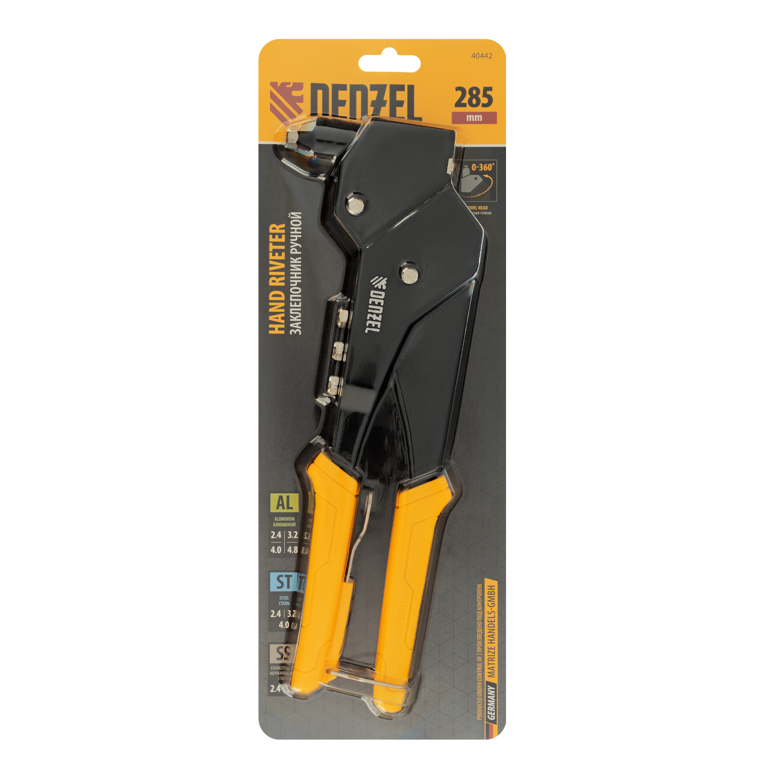 Заклепочник ручной литой Denzel 40442 длиной 285 мм, поворотный на 0-360°, используется для создания неразъемных соединений с помощью алюминиевых вытяжных заклепок диаметром 2,4-3,2-4,0-4,8 мм, стальных диаметром 2,4-3,2-4,0 мм и вытяжных заклепок из «нержавейки» диаметром 2,4-3,2 мм. Голова инструмента вращается на 360°, что упрощает работу в стесненных условиях. Заклепочник пригодится на производстве, в ремонтной мастерской, а также в быту.