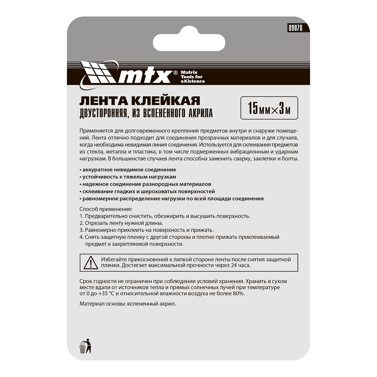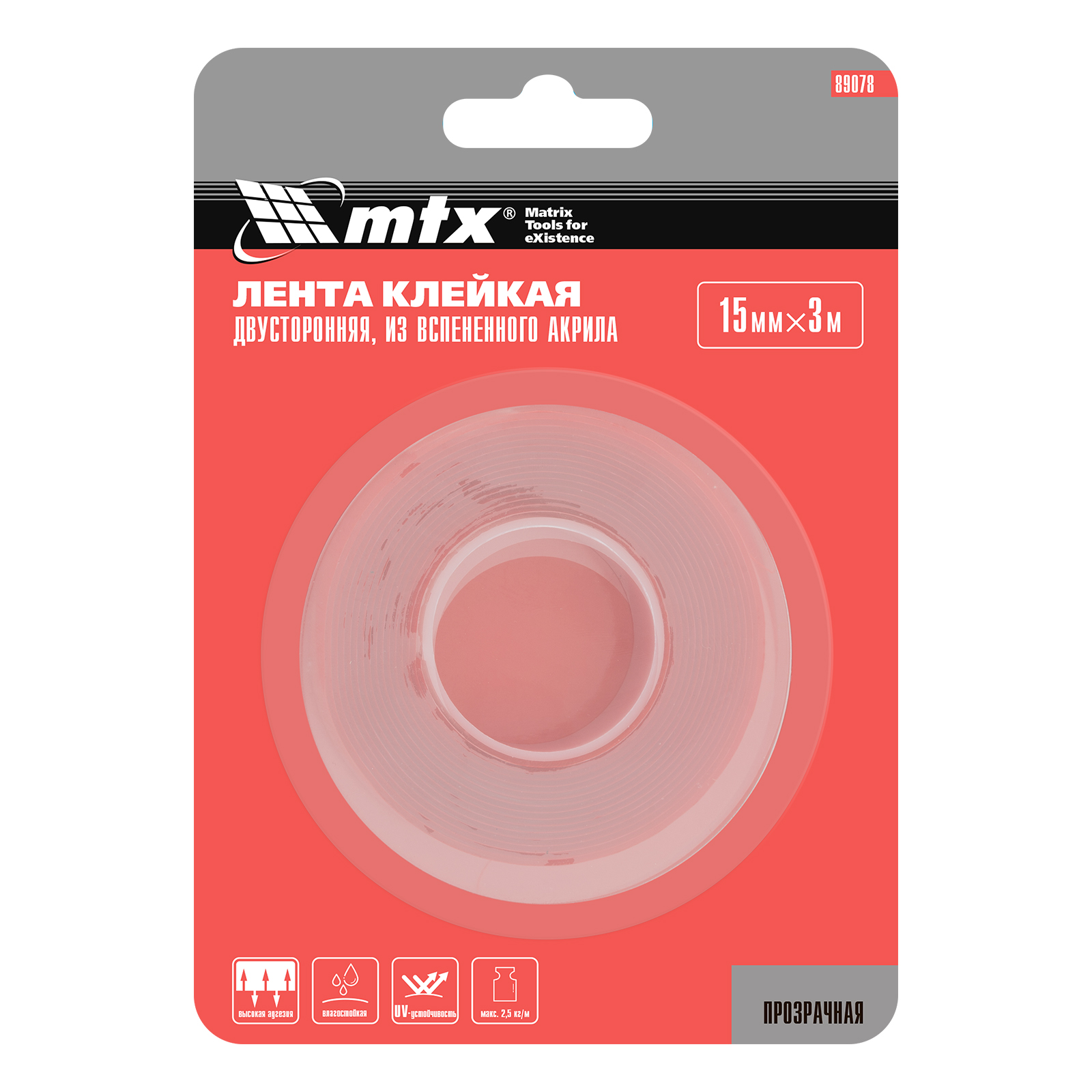 Двусторонняя клейкая лента из вспененного акрила Matrix 89078 размером 15 мм х 3 м, прозрачная, обеспечивает долговременное соединение предметов из стекла, металла и пластика, в том числе предметов, подвергающихся вибрационным и ударным нагрузкам. Подходит для скрепления прозрачных материалов, т. к. образует невидимое соединение. Лента обладает повышенной мягкостью и гибкостью, используется для проведения ремонтных работ в гараже, дома или на даче.