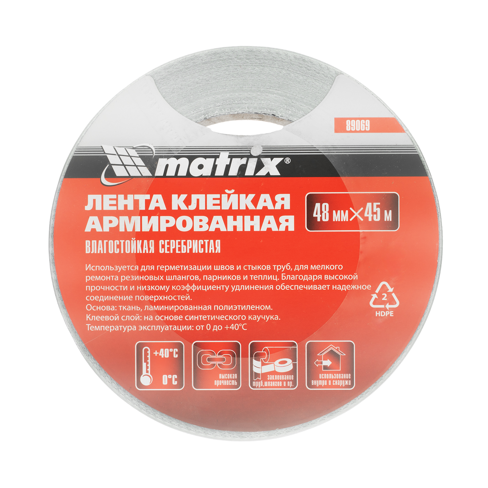 Влагостойкая клейкая армированная лента Matrix 89069 размером 48 мм х 45 м, серебристого цвета, позволяет решить множество задач в быту и на производстве. С ее помощью можно осуществить мелкий ремонт различных изделий, герметизировать соединения, предотвратить попадание пыли и воды на детали и т.д.